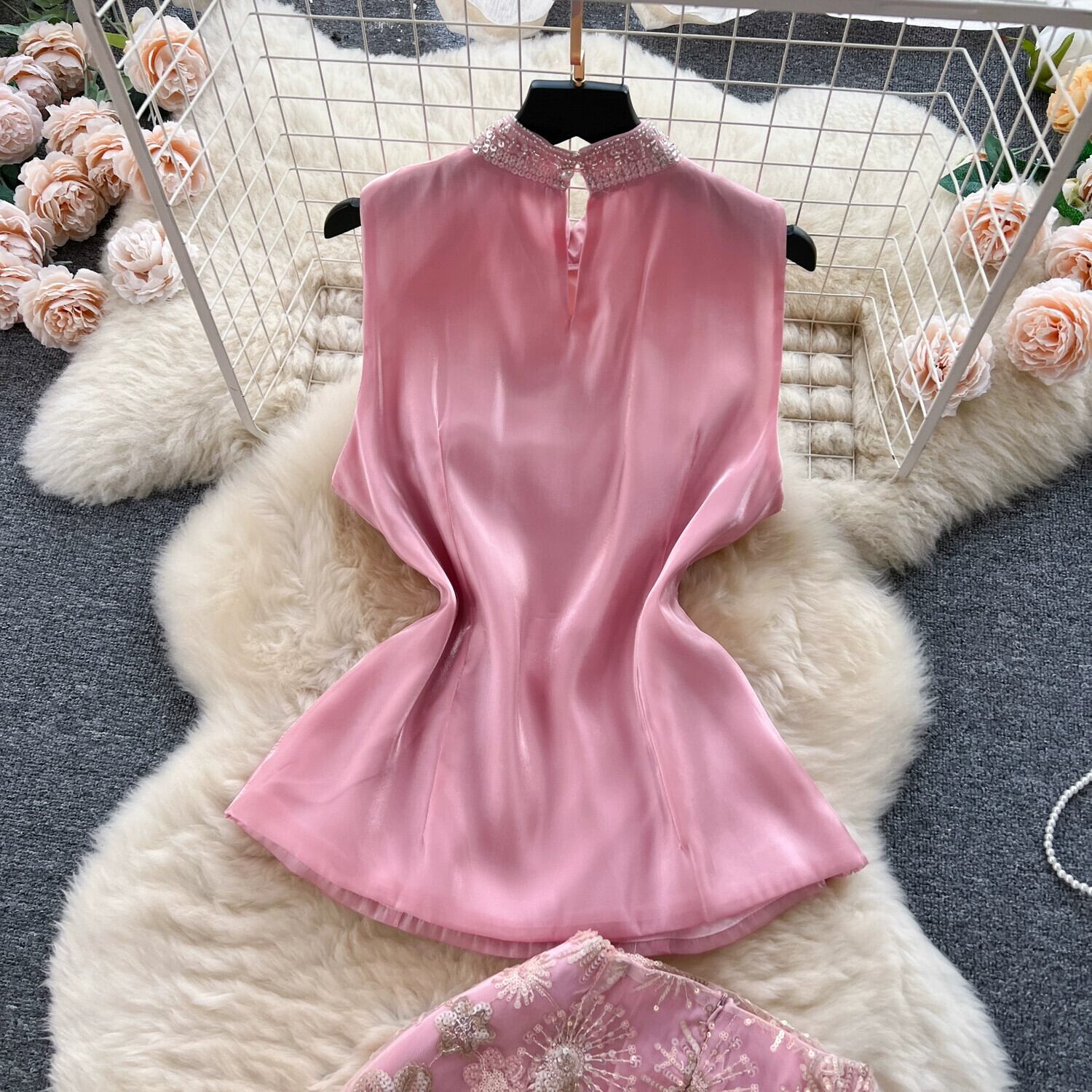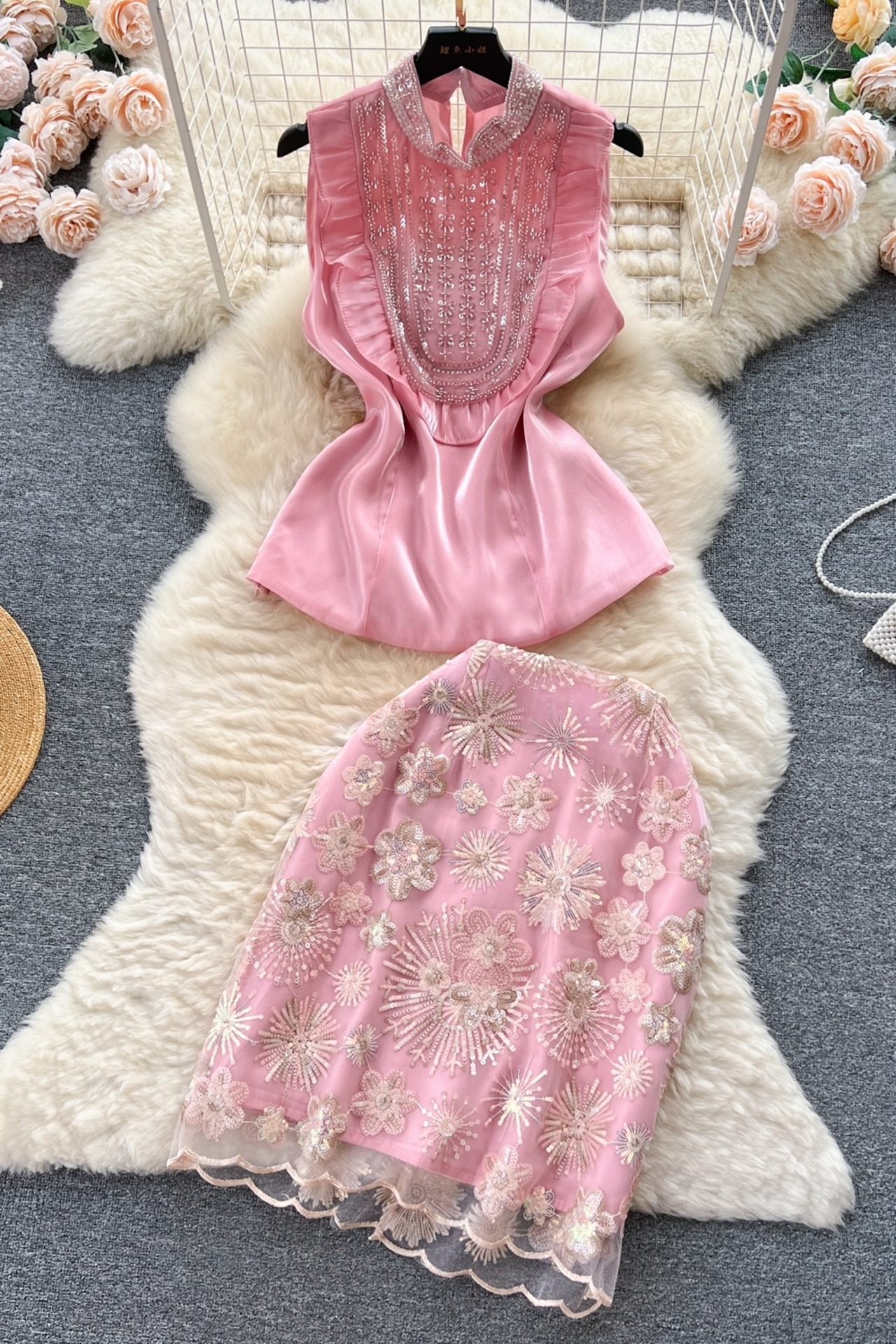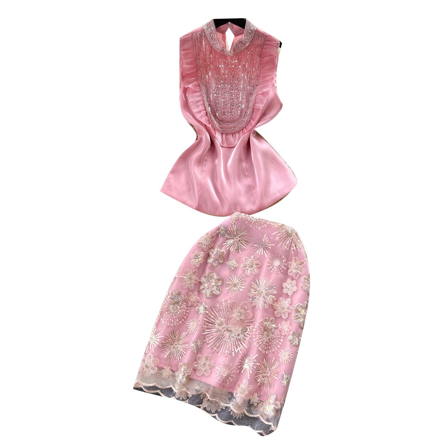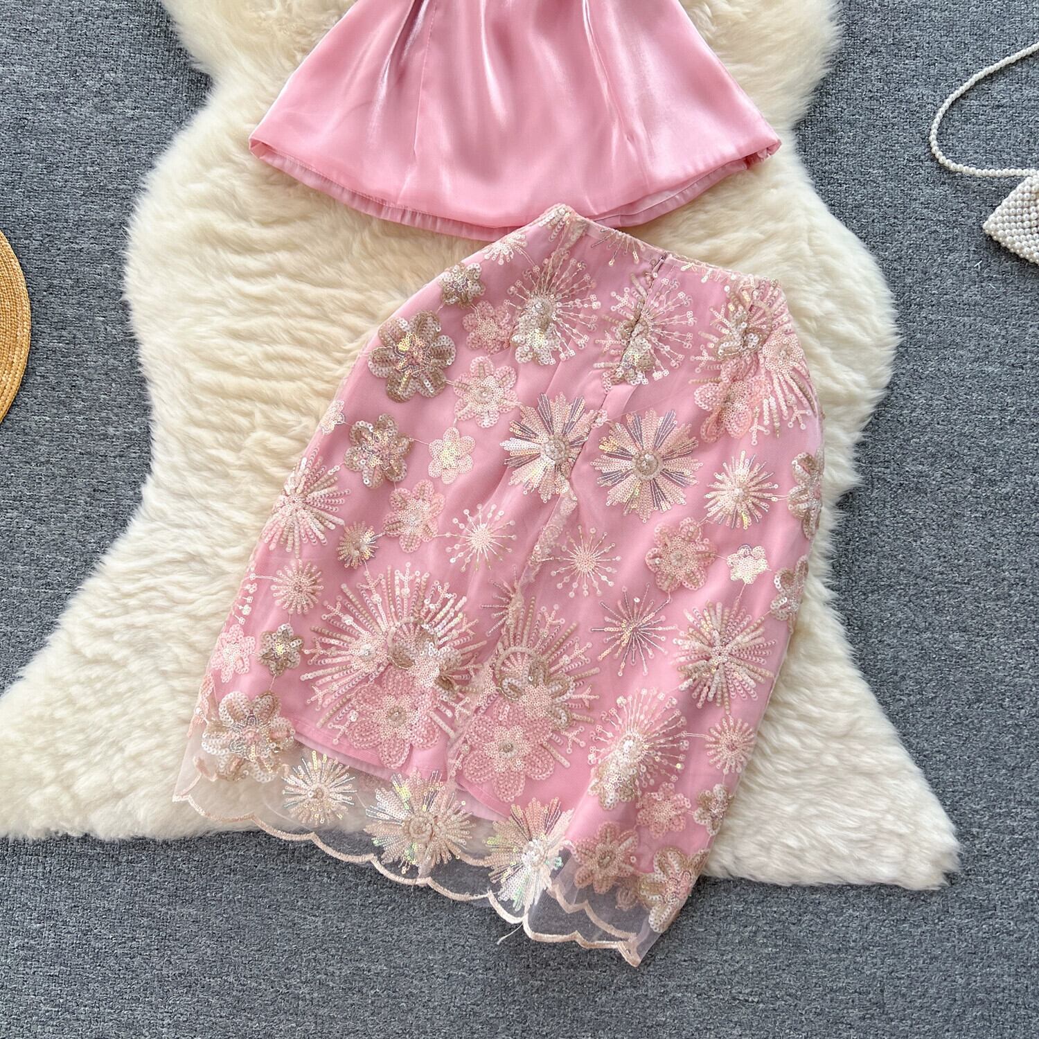レディスタイルファッションスーツレディースフレンチヘビービーズスパンコールサテンシャツハイウエストヒップスカート2点セット ハイウェスト lyxaj67537443112