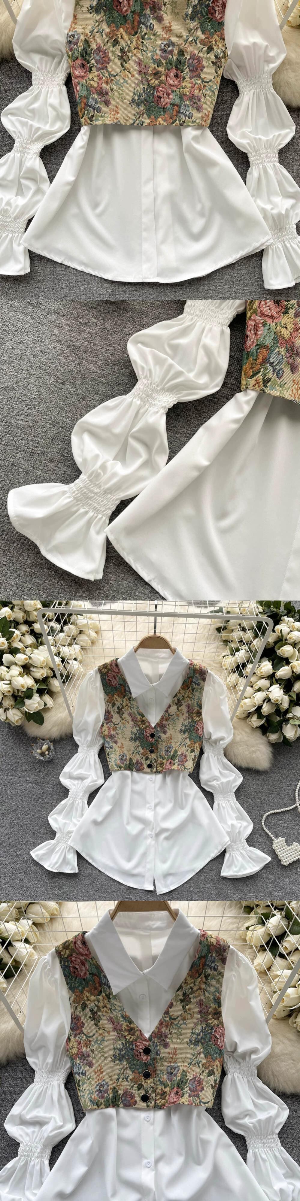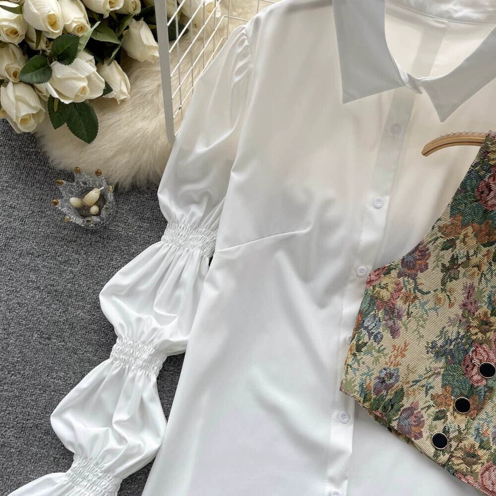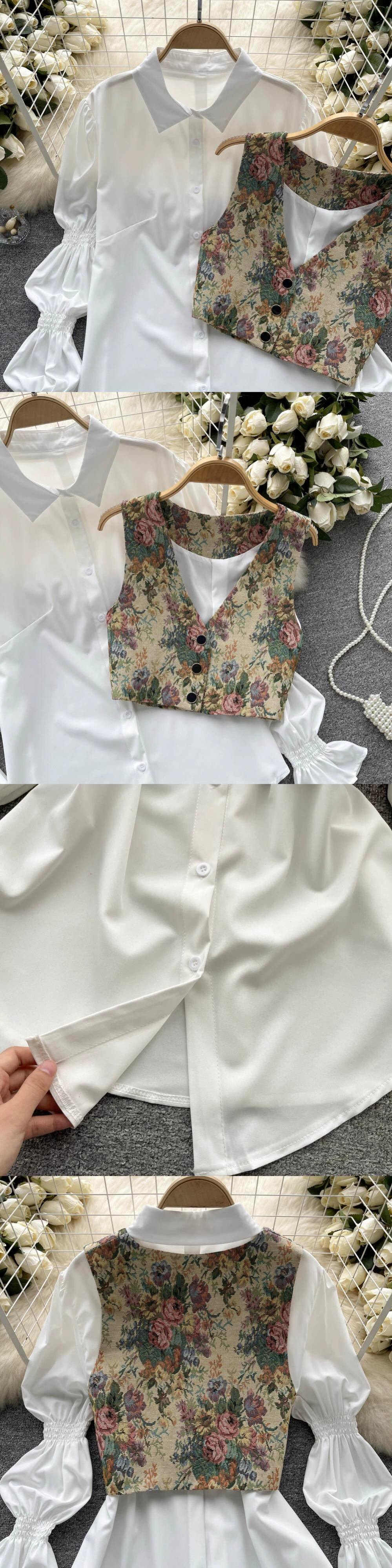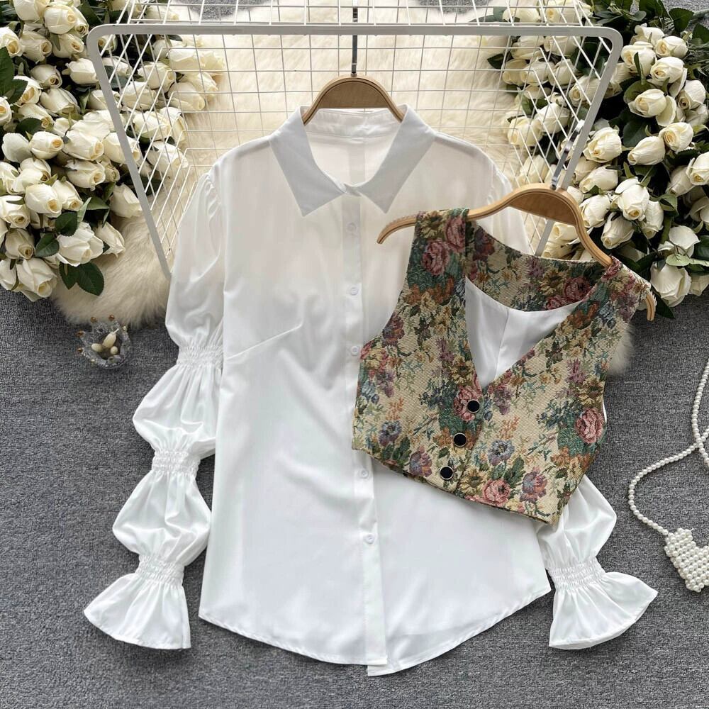 フレンチレトロ油絵プリントベスト+ミドル丈プリーツパフスリーブ白シャツレディース2点セット ホワイト lyxaj49280899283