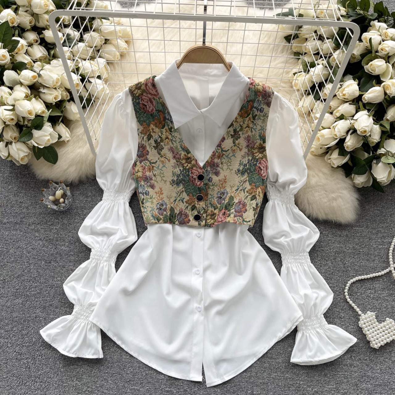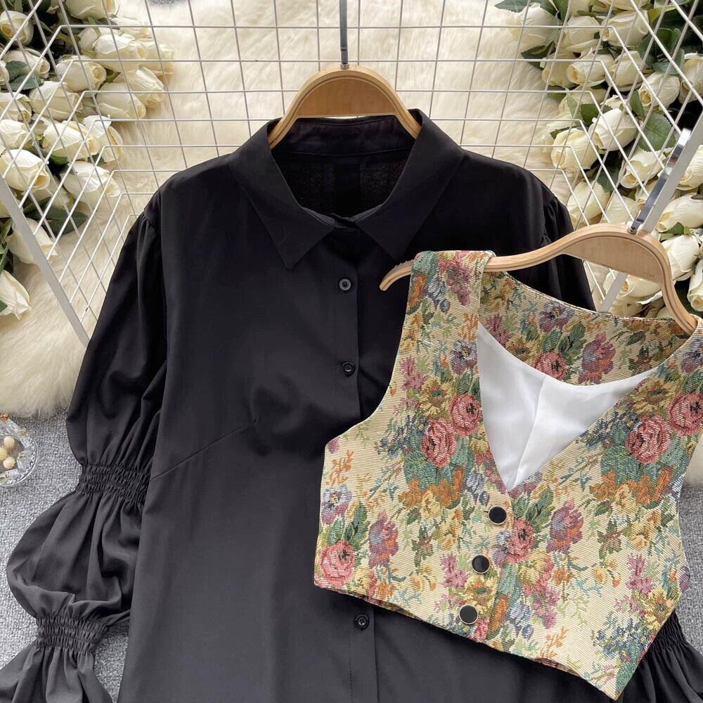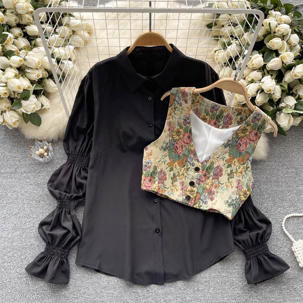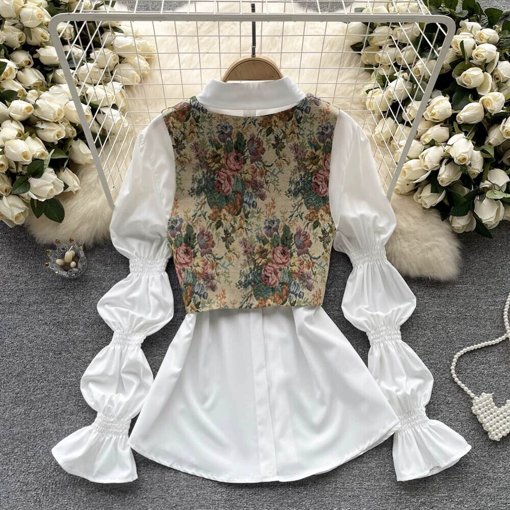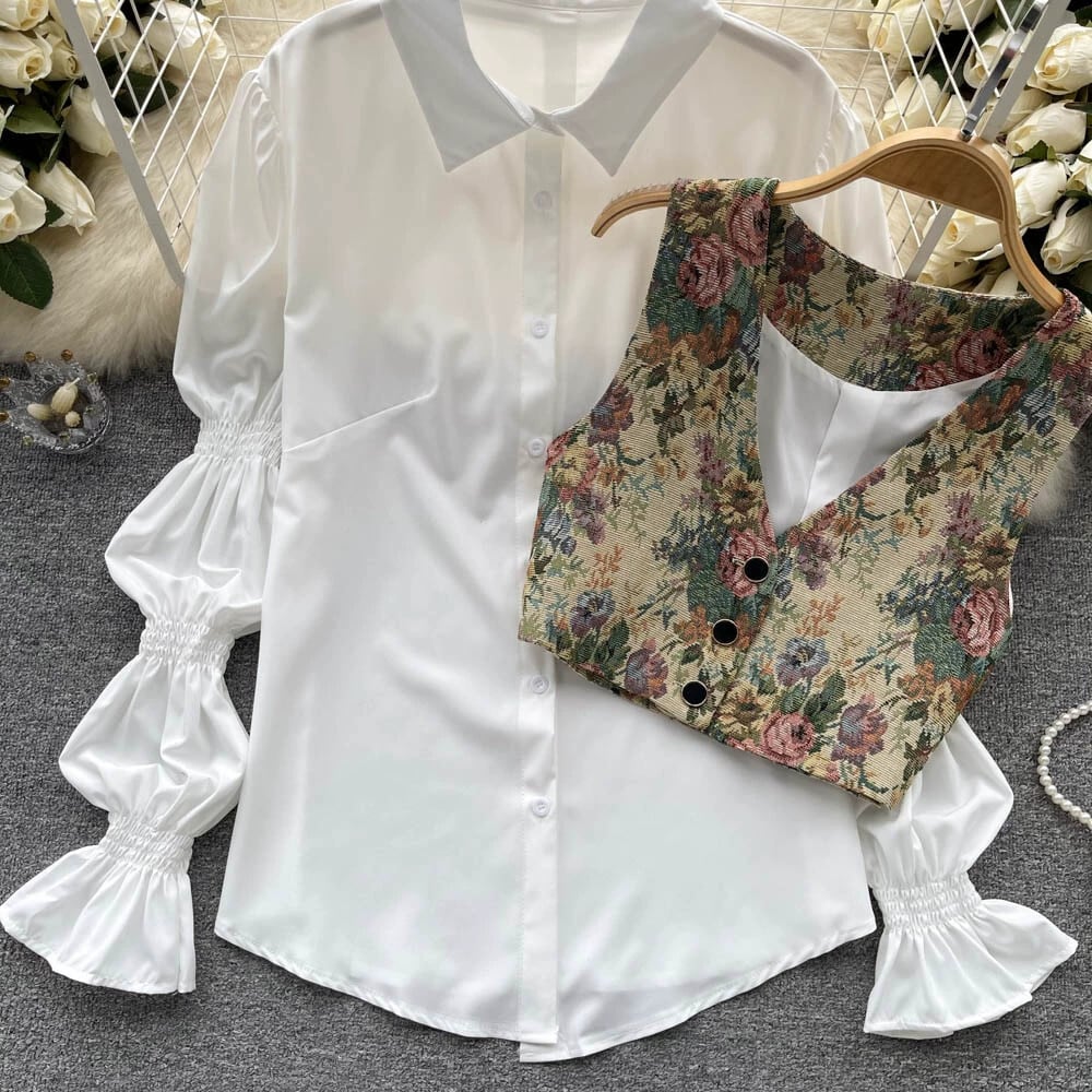 フレンチレトロ油絵プリントベスト+ミドル丈プリーツパフスリーブ白シャツレディース2点セット ホワイト lyxaj49280899283