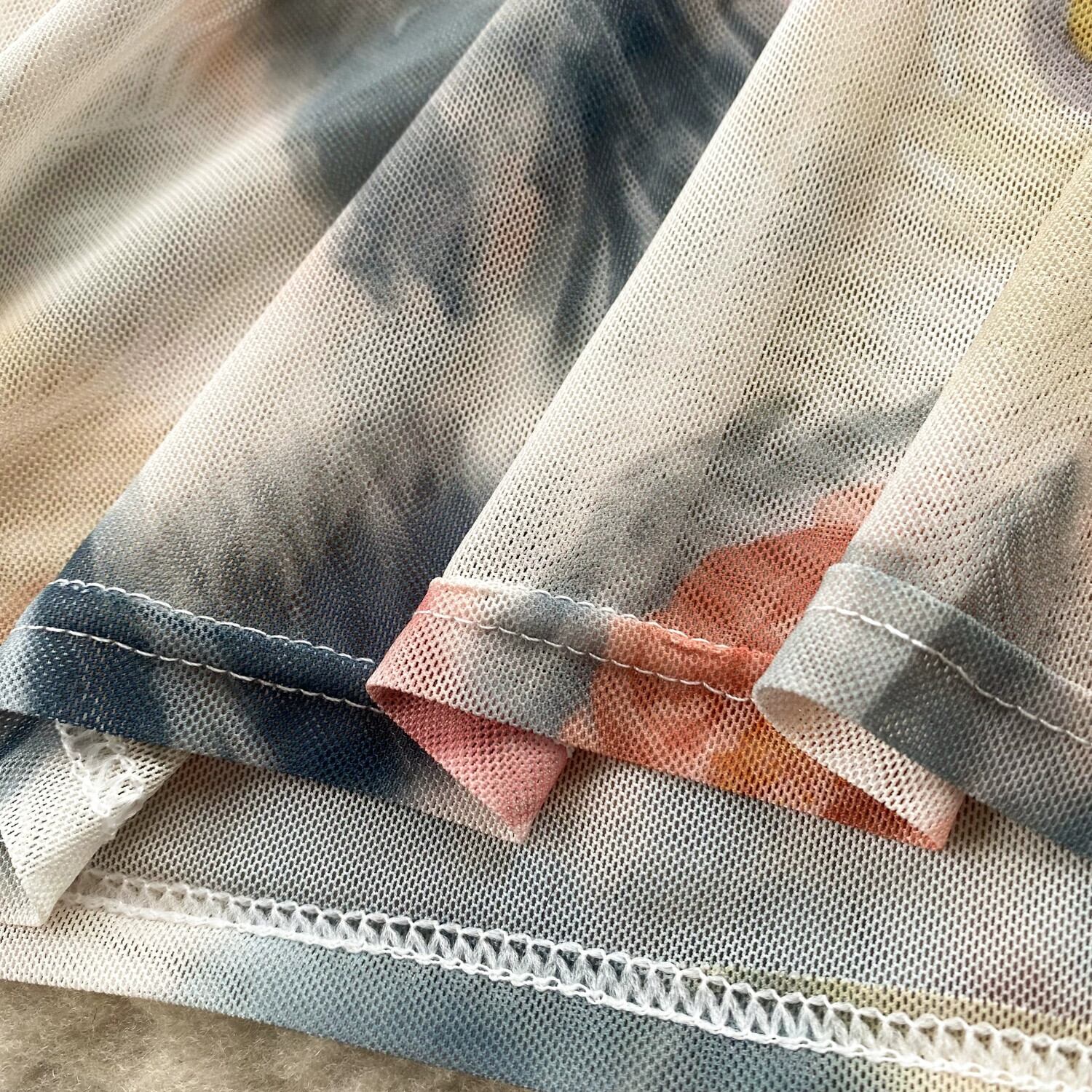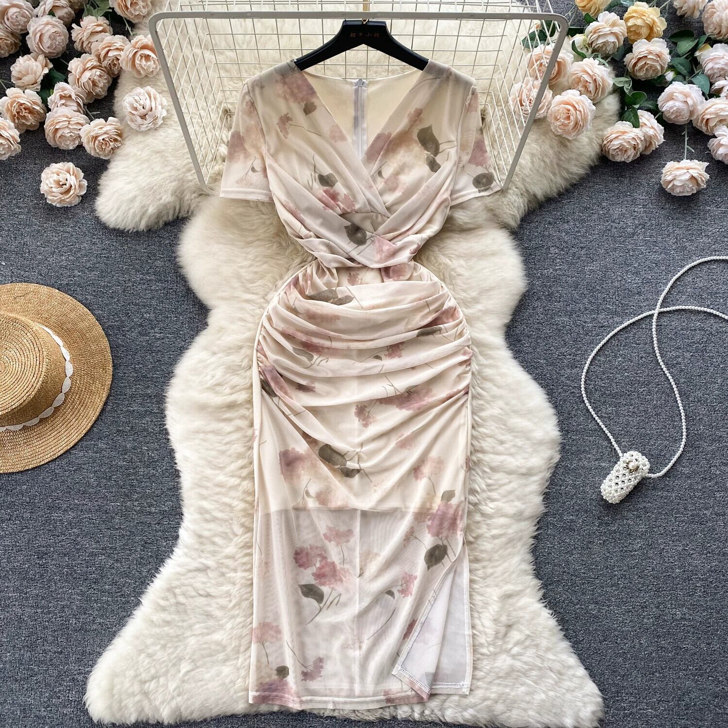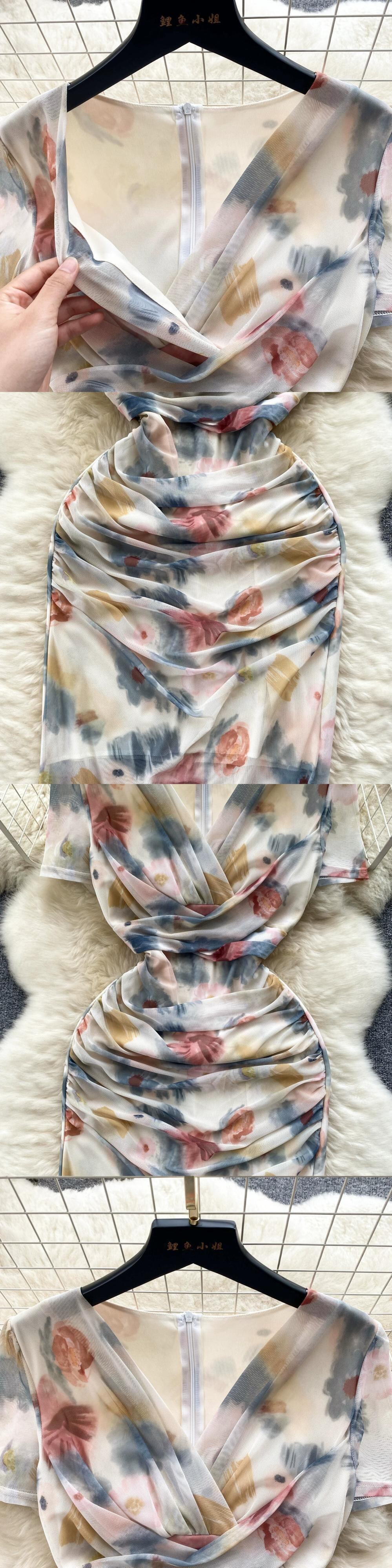 香港シックなニッチセレブスタイルプリーツ V ネック半袖プリントスカートレディース夏スリムフィットヒップハグメッシュスカート サマー 夏物 Vネック lyxaj85307952116
