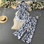 ヨーロッパとアメリカの女性のハイエンドファッション花柄スーツ女性の夏のラペル半袖シャツ + ハイウエストロングパンツ サマー 夏物 ヨーロピアン lyxaj76301668989