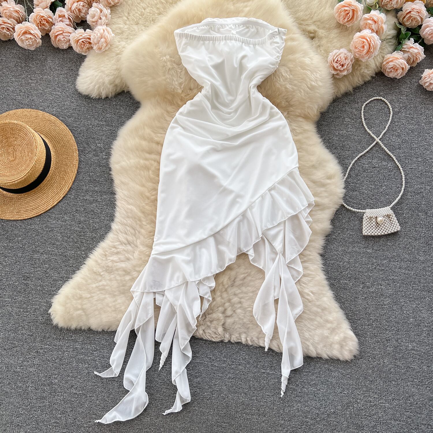 不規則なフリルリボンと立体的なフラワーテールスカートを備えた夏のフランスの純粋な欲望スタイルのチューブトップドレス女性 サマー 夏物 ピュア フラワーデザイン lyxaj94607140431