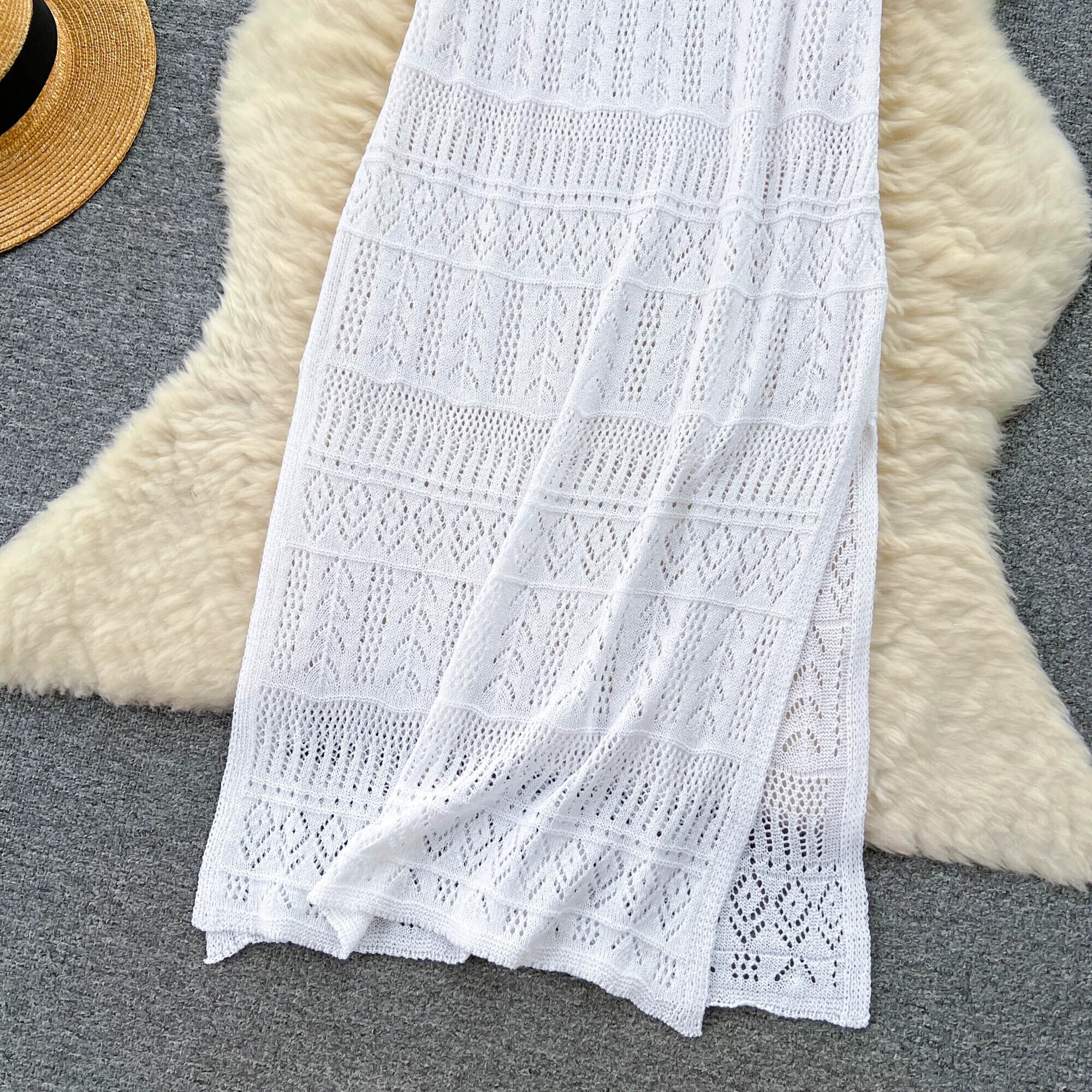 シックなニッチリゾートスタイルラウンドネックレースアップ半袖中空ニットドレスレディーススリムでエレガントなロングスカート Oネック lyxaj91504042095