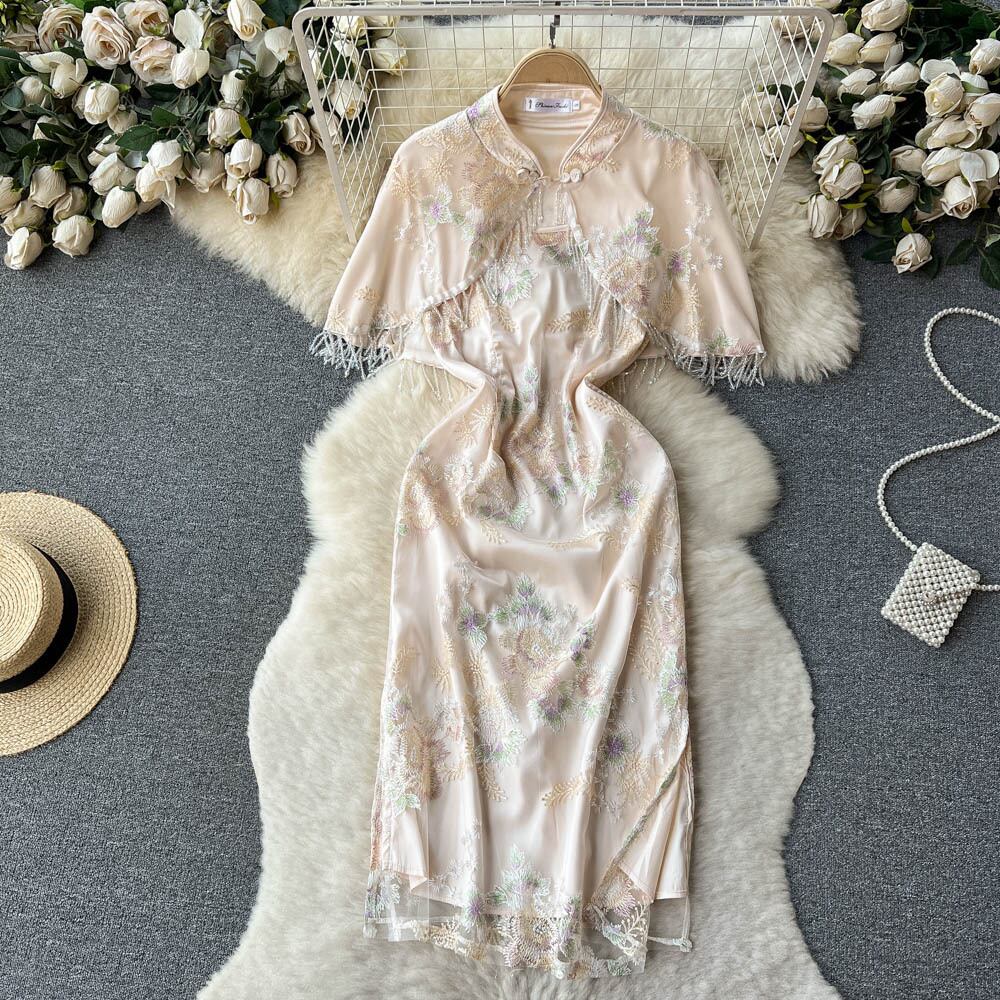 レトロな中国風のチャイナ ドレス スカート スーツ女性、ハイエンド、頑丈、フリンジ付きチョッキ、メッシュ刺繍サスペンダー スカート、トレンディなツーピース セット レッド lyxaj38017926316