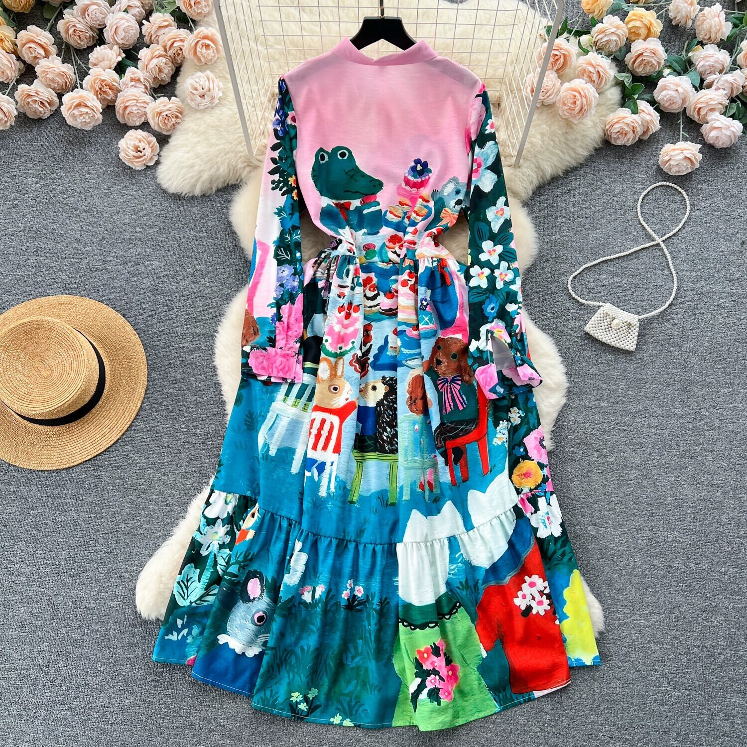 ヨーロッパとアメリカンスタイルのニッチシックなハイエンドプリントシャツドレスレディースウエスト引き締め気質ワイドスリーブ長袖Aラインドレストレンディ ロング ヨーロピアン lyxaj50801861841