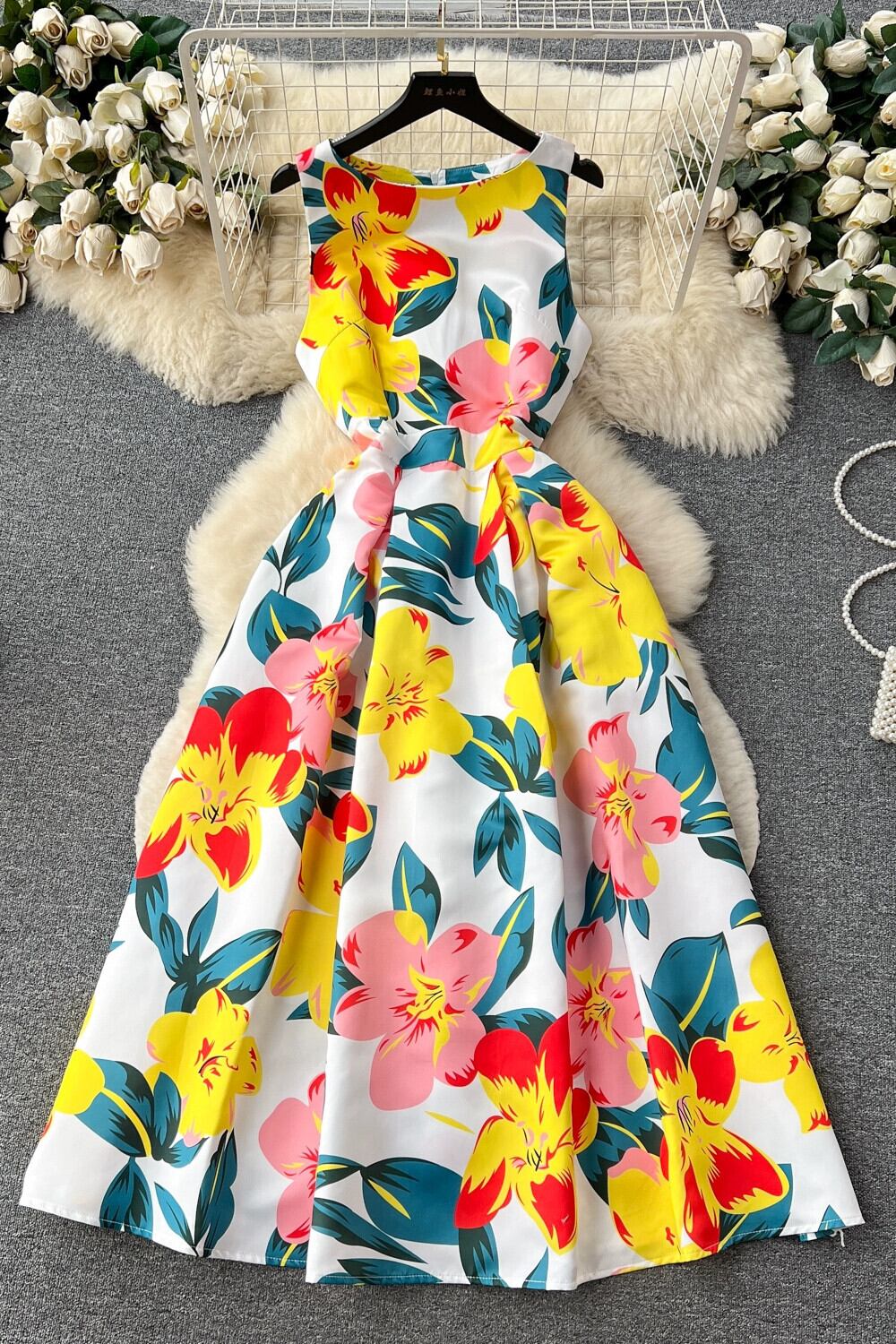 フレンチレトロラウンドネックノースリーブポジショニングプリントドレス女性の夏のウエスト痩身気質ワイドスイングベストスカート サマー 夏物 Oネック lyxaj58229304837