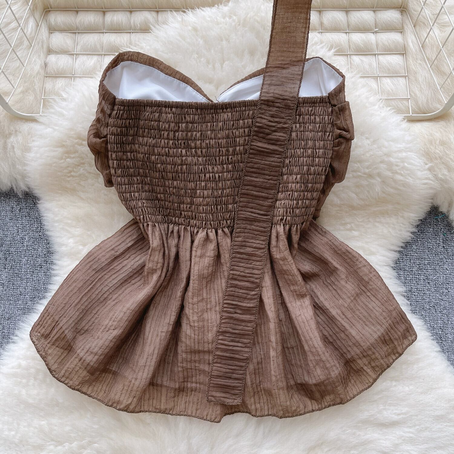 セクシーな純粋な欲望ネクタイスタイルチューブトップノースリーブシフォンブラウス女性の夏のレースアッププリーツリボンシックなトップトレンディ サマー 夏物 ピュア lyxaj75687005654