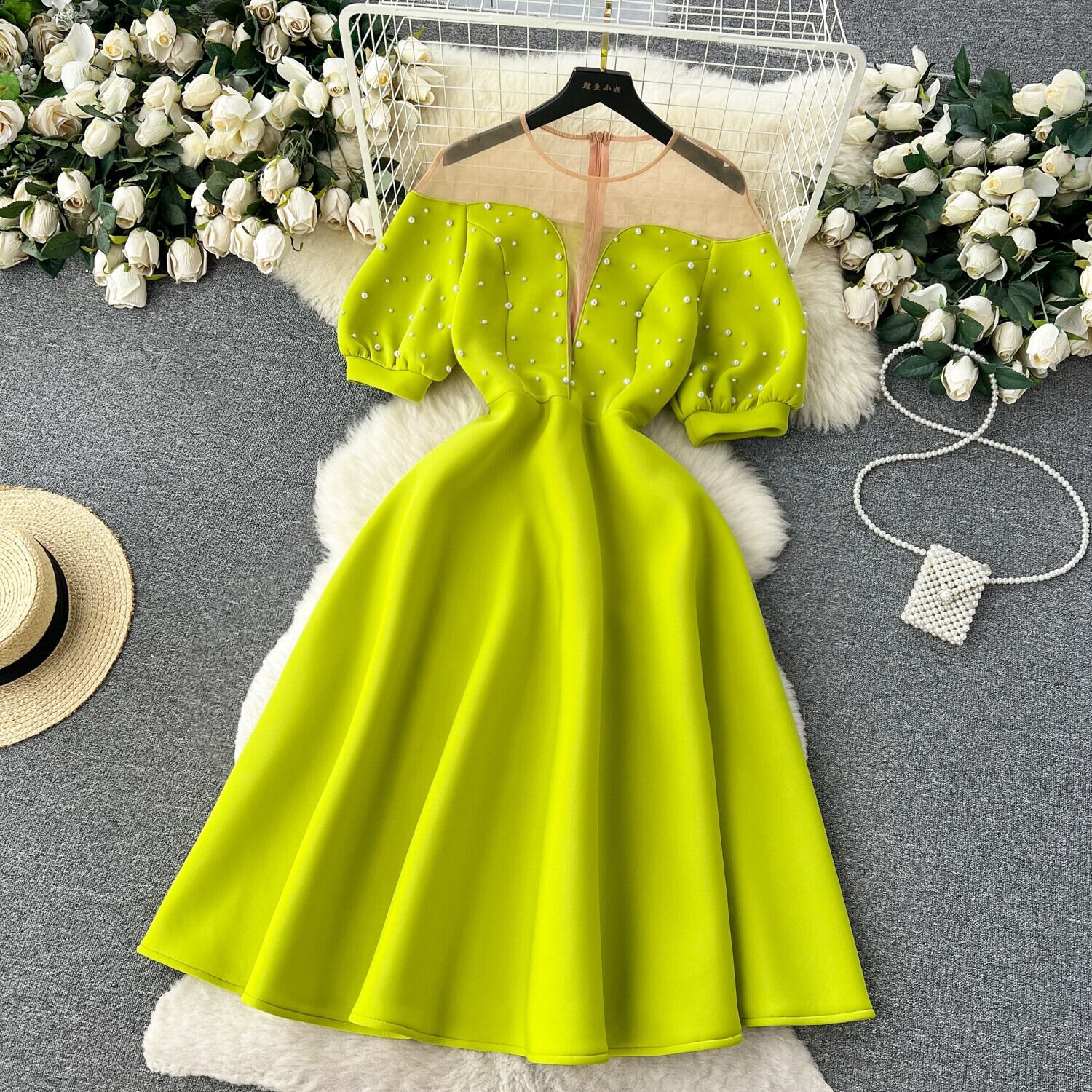 夏フレンチレトロシースルーメッシュステッチビーズパフスリーブドレスドレス女性セレブウエストウエスト大スイングスカート サマー 夏物 lyxaj83542812446