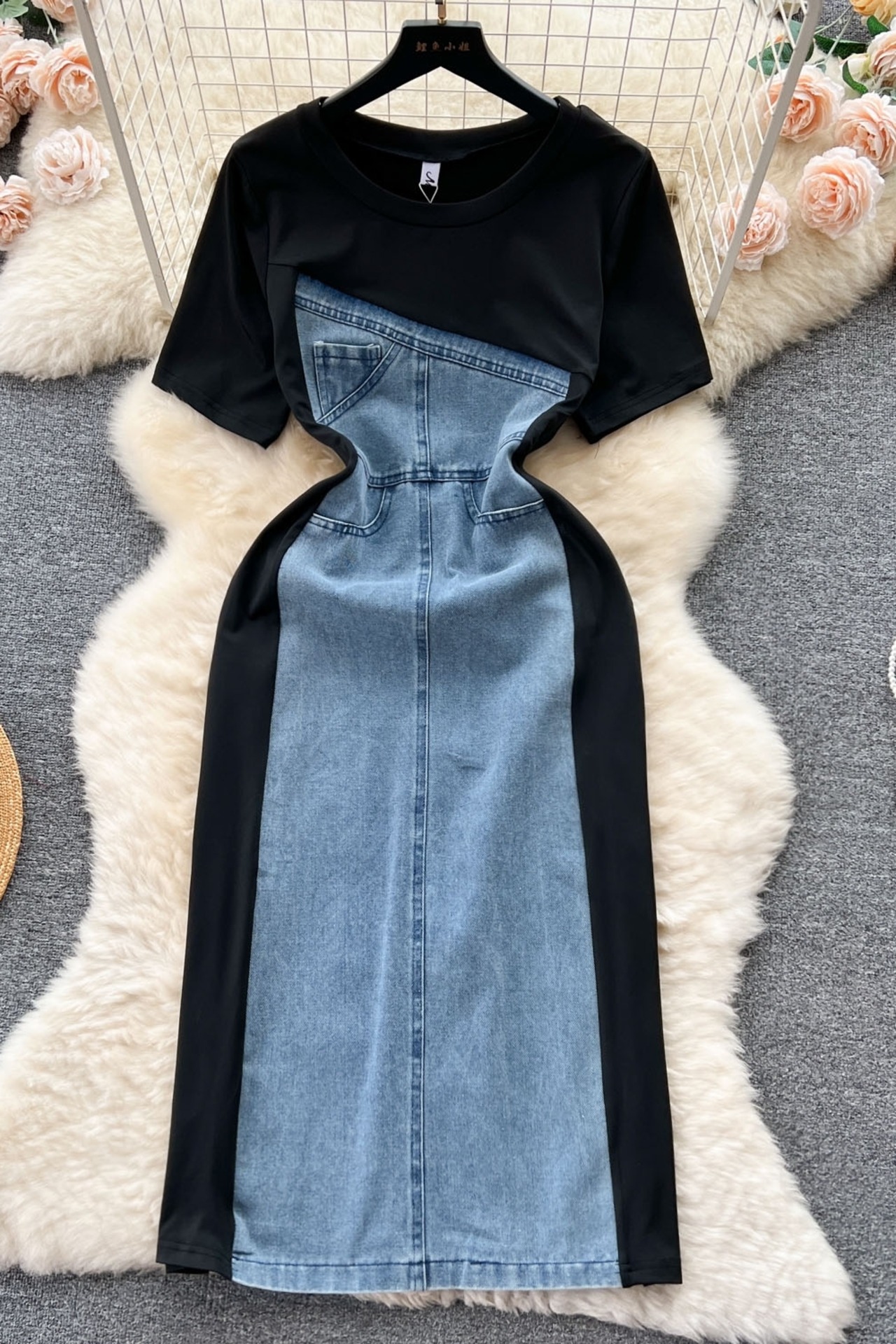 フレンチニッチレトロ半袖スプライシングデニムドレス女性の夏のウエスト痩身シックカジュアルロングスカート サマー 夏物 lyxaj8510292325