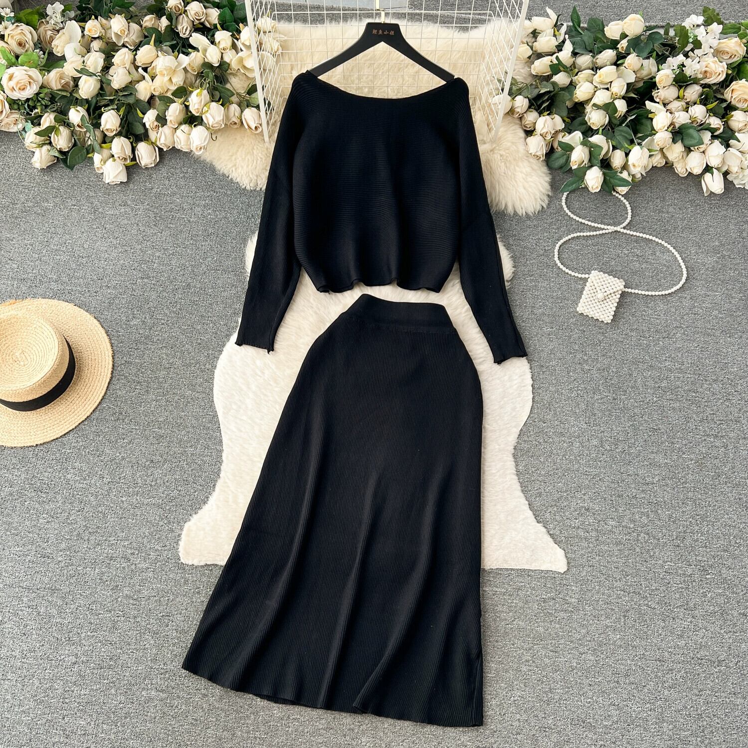 秋冬フレンチライトラグジュアリーセレブスタイルゆったり長袖トップス+ハイウエストロングスカートツーピーススーツ オータム 秋物 ウィンター 冬物 lyxaj75265193194