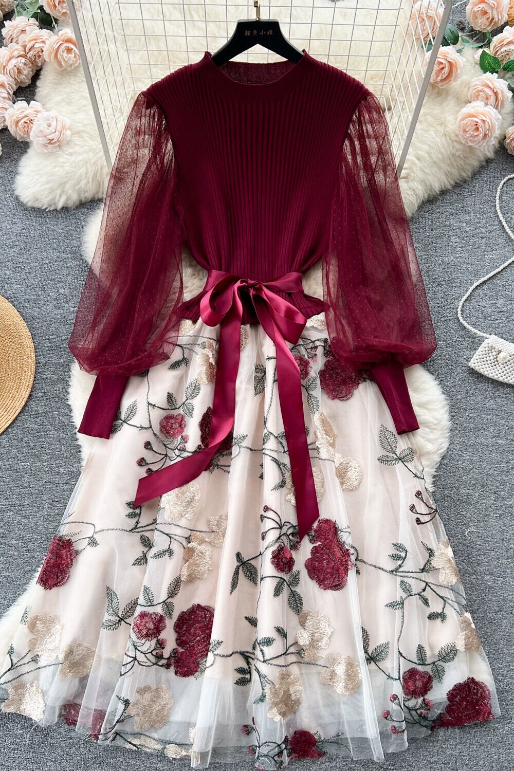 フレンチライトラグジュアリーレディスタイルニットスプライシング刺繍メッシュドレス女性レースアップウエストと痩身気質妖精スカート レッド lyxaj65833920587