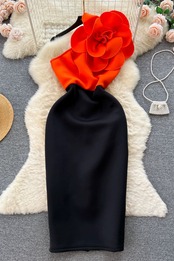 ヨーロッパとアメリカンスタイルの立体フラワースラントカラーオフショルダードレス女性ハイウエスト痩身純粋な欲望ヒップハグカラーブロックドレス ピュア フラワーデザイン ヨーロピアン lyxaj61687116374