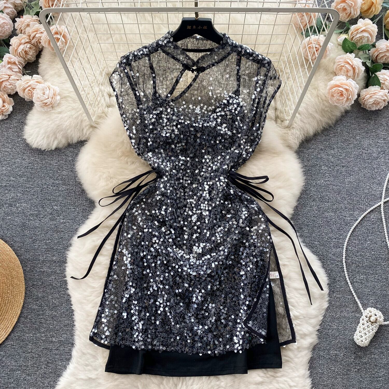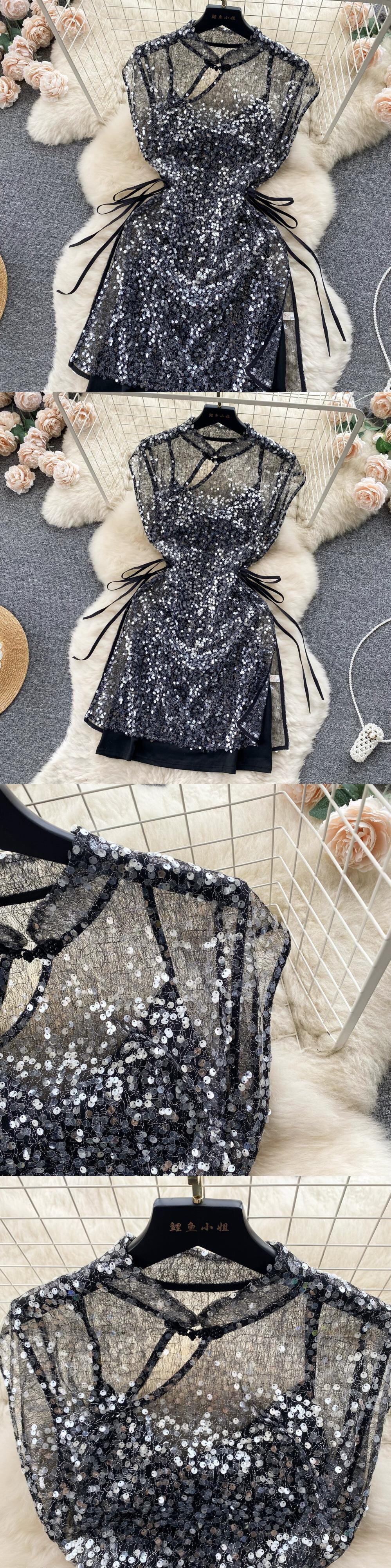 夏の新しいニッチレトロハイエンドチャイナドレススパンコールブラウススカート + サスペンダードレス女性のツーピーススーツ サマー 夏物 lyxaj47676676193