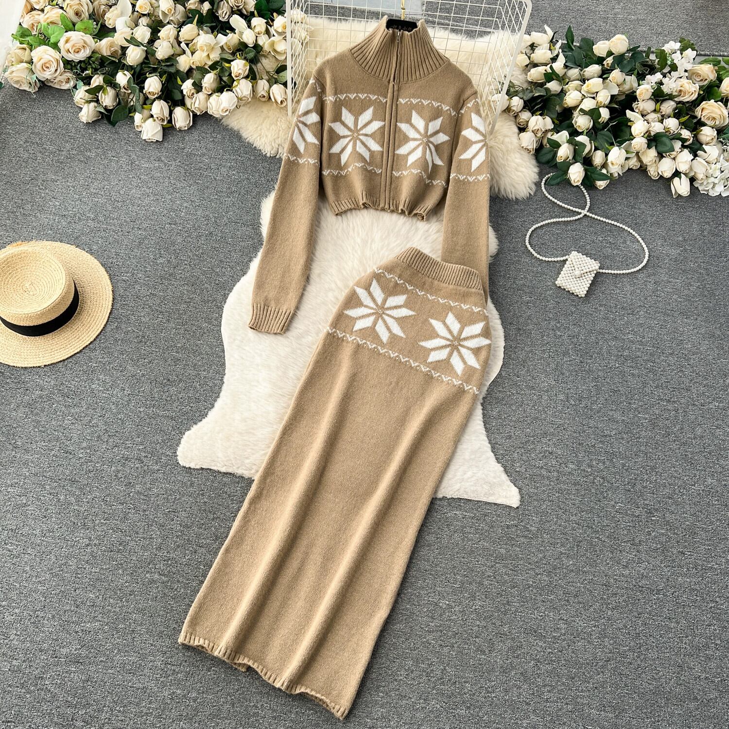 香港風レトロニットプリントスーツレディースルーズショートジッパートップ+ハイウエストヒップスカート2点セット ハイウェスト lyxaj76813516640
