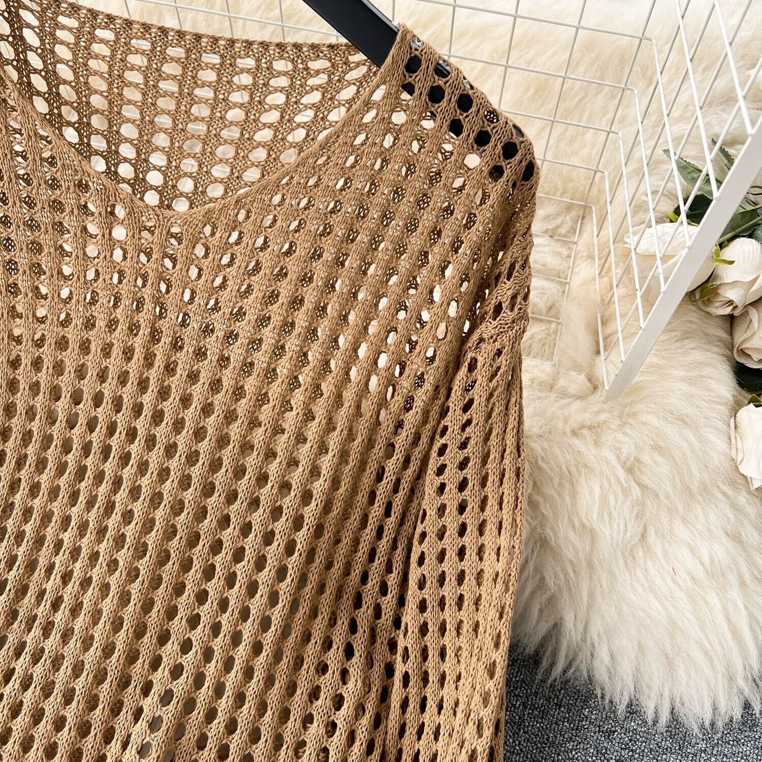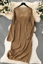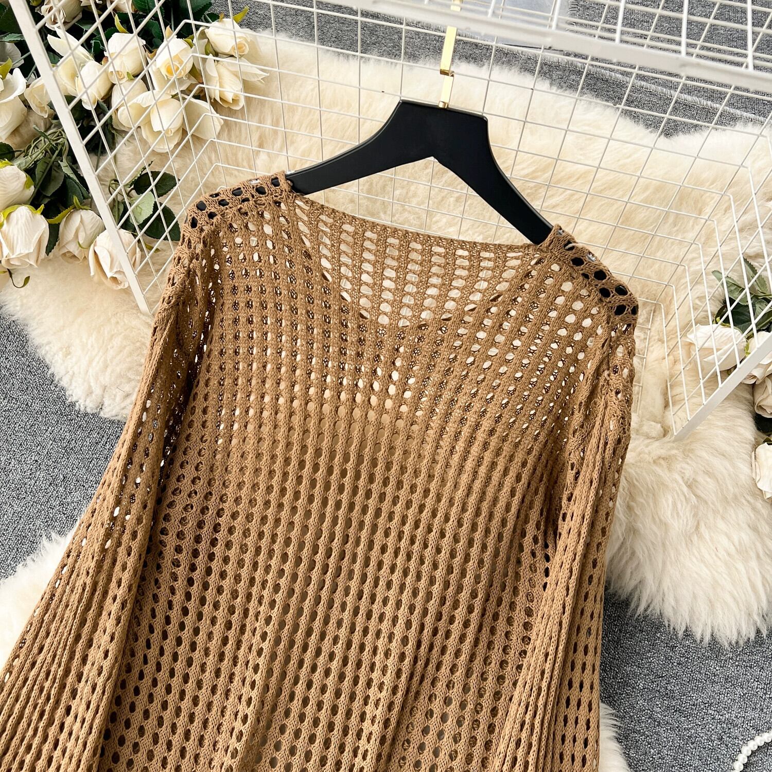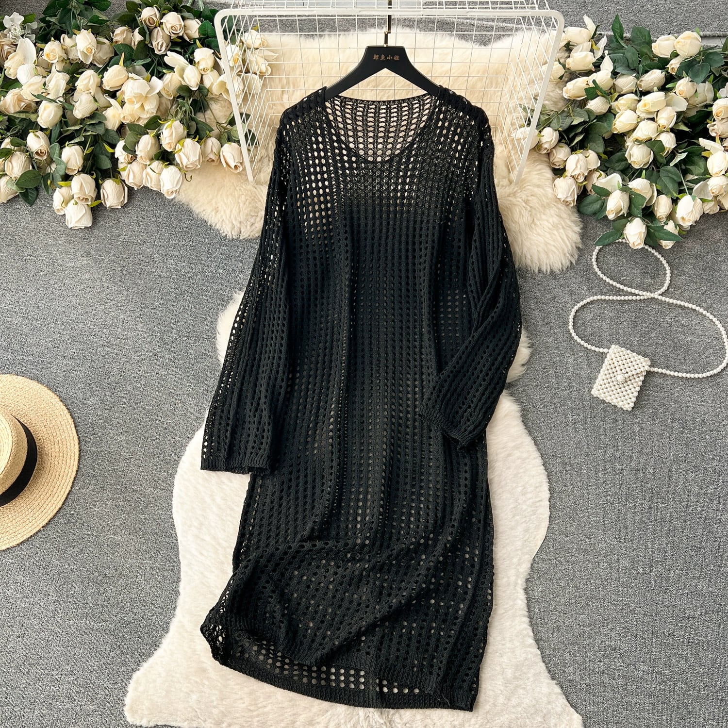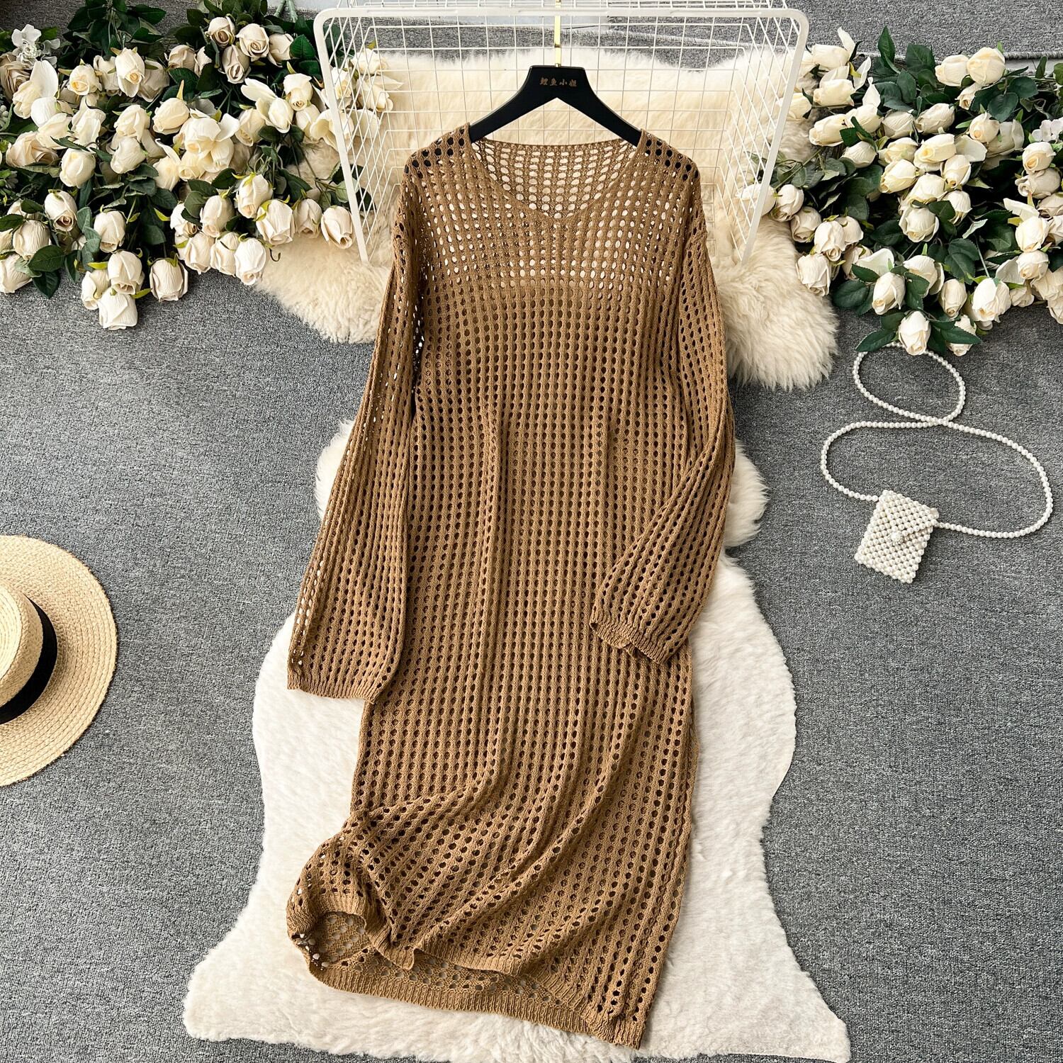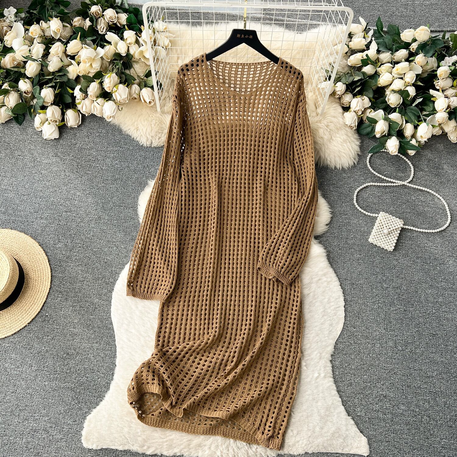 怠惰なスタイルの無地長袖ドレスの女性の夏中空ルーズスリムデザインニッチシックな気質ロングドレス サマー 夏物 ソリッドカラー lyxaj50486233923