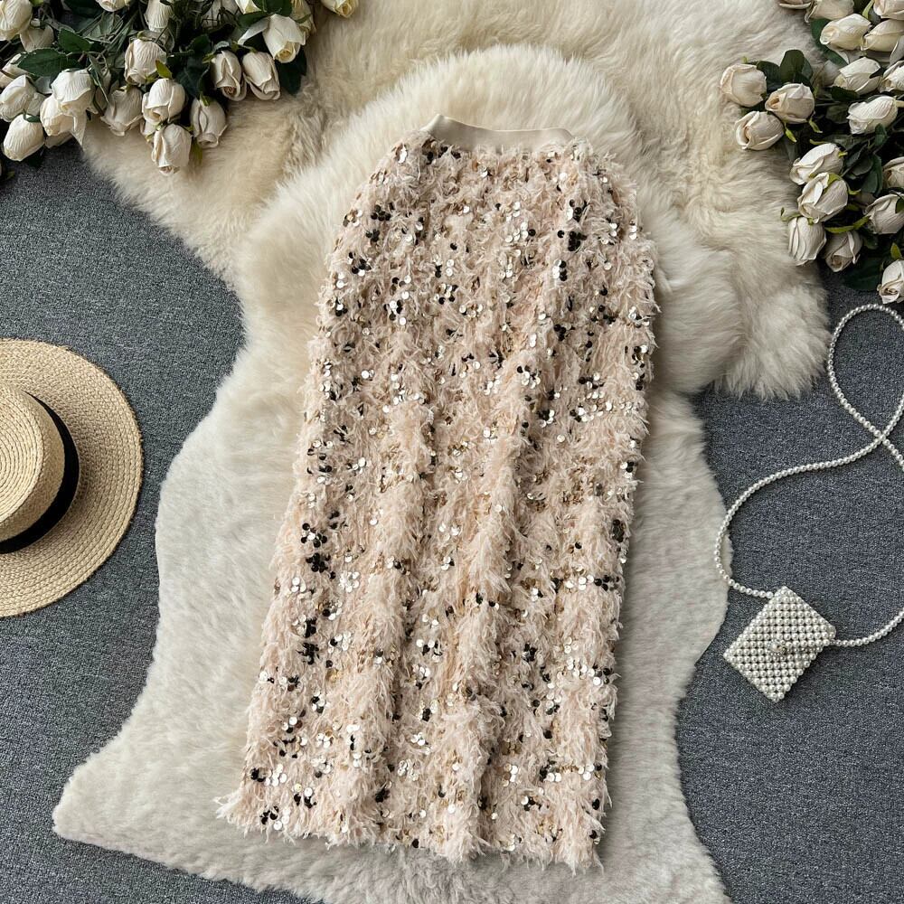 スパンコールテルフェザーライト高級ロングスカートスリムフィットニッチデザイン弾性ウエストスリットバックストレートスカート女性 エラスティック 伸縮 lyxaj54032008577