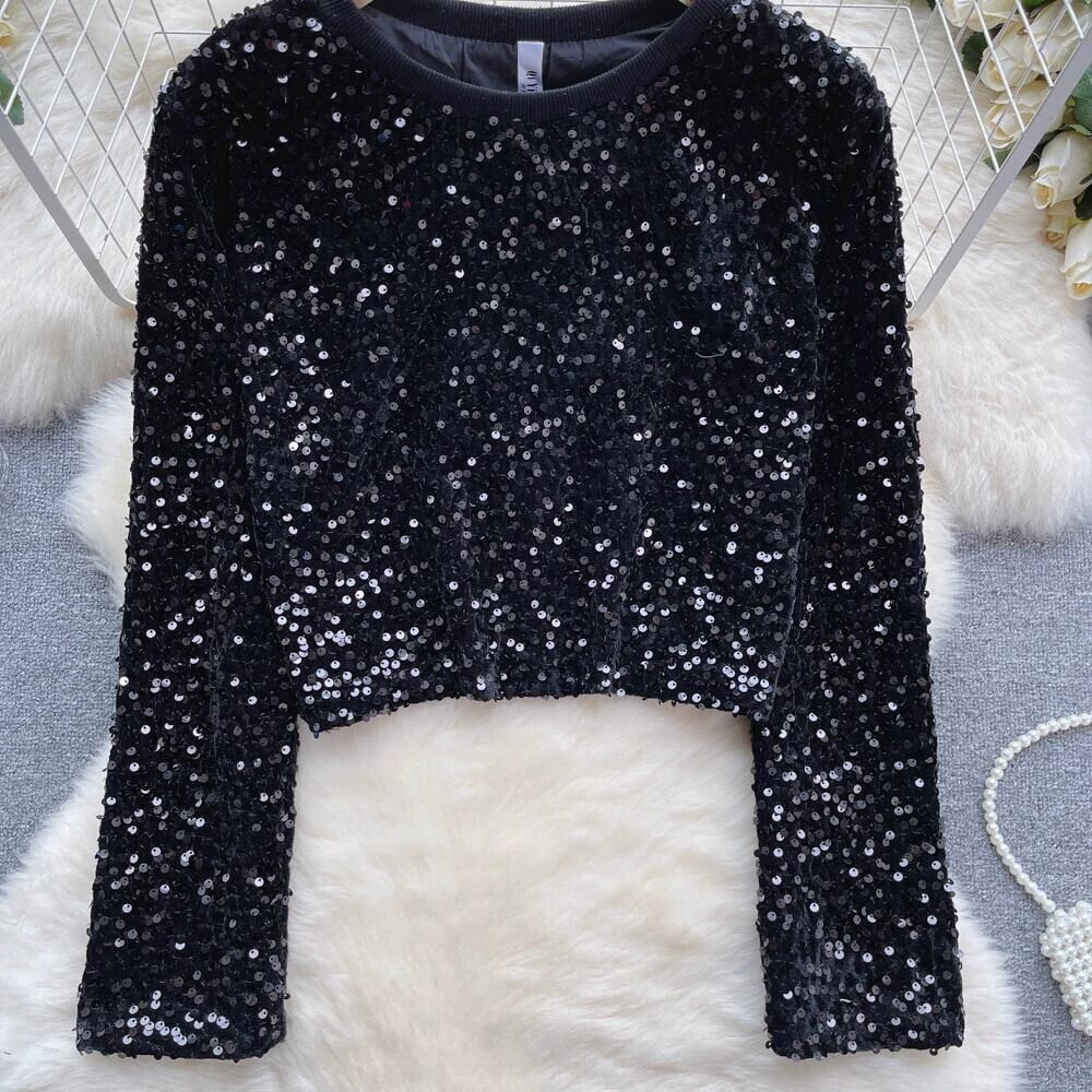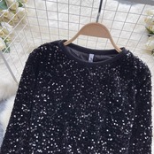 レトロなスタイルの重工業スパンコール付きショート長袖トップ女性シックな気質ルーズで多目的なラウンドネックTシャツトレンディ ロング Oネック lyxaj1971086317