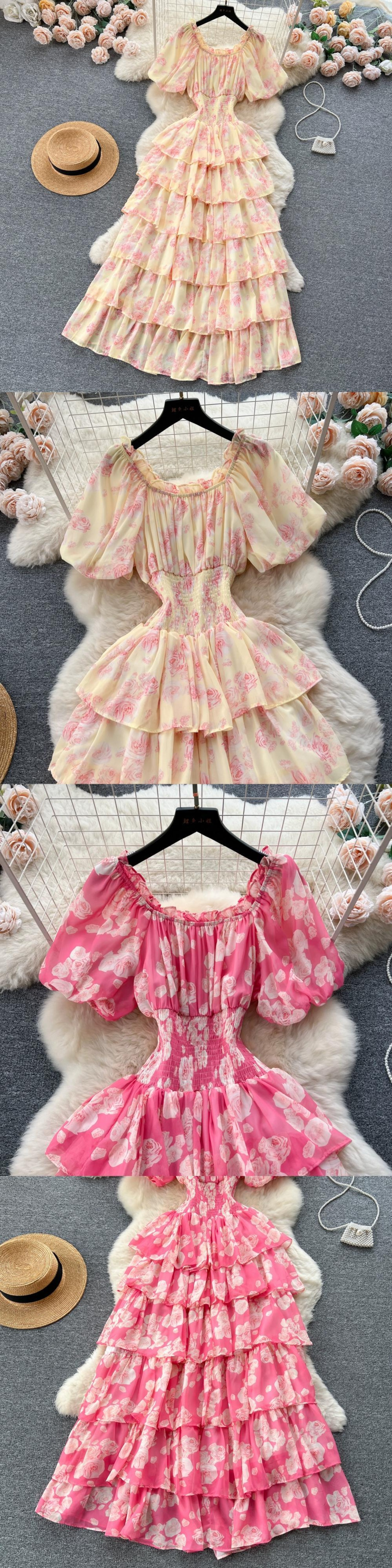 レトロロマンチックな花柄ドレス女性の夏のパフスリーブウエストニッチシックエンドケーキドレス サマー 夏物 lyxaj80808569715