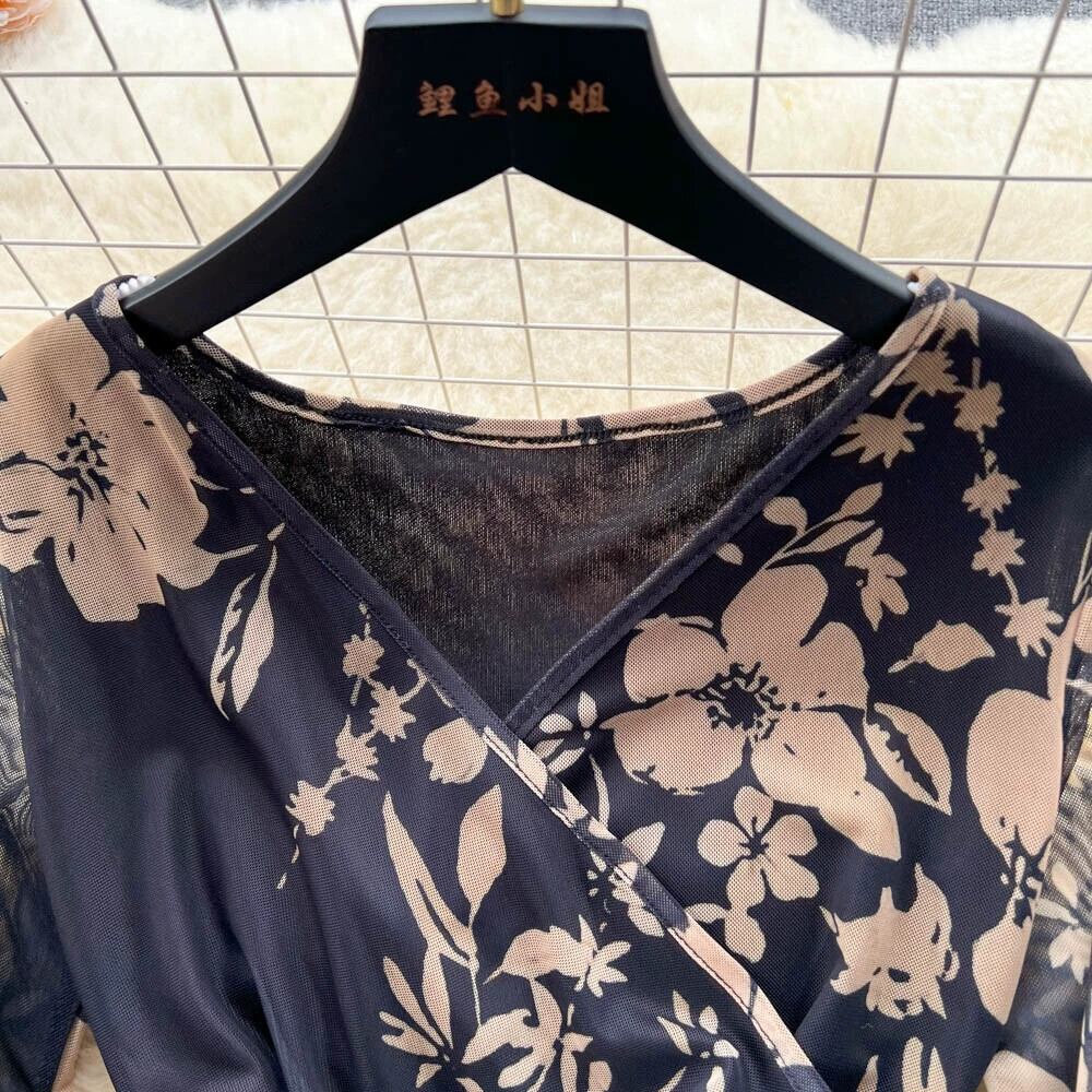 レトロなハイエンドメッシュプリントスプライシングスリムVドレス女性夏のウエストを細くし、エレガントなヒップハグスカート サマー 夏物 lyxaj71392115775