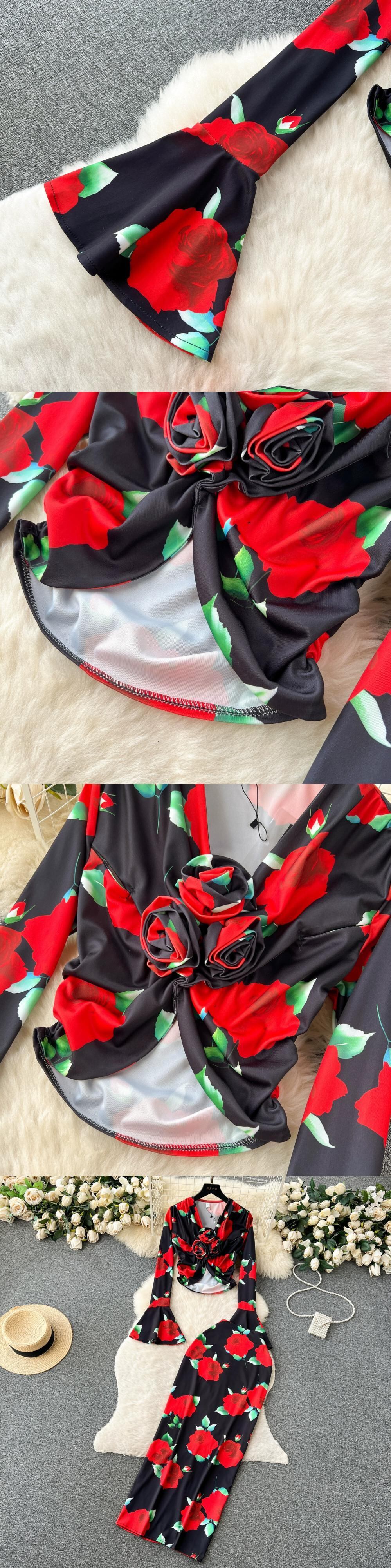 アメリカの純粋な欲望ネクタイ長袖立体フラワークロップトップ女性のツーピースハイウエストヒップハグプリントスカート ロング ピュア フラワーデザイン lyxaj95046934598