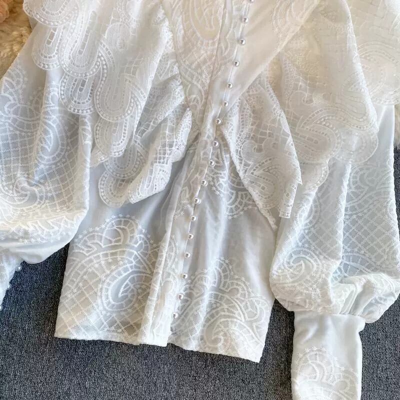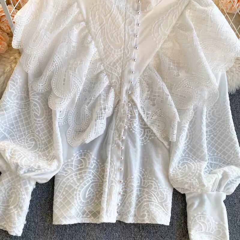 ライト高級レディーストップス 2023 新しい女性の宮殿スタイルのレトロな重工業フリルスリムフィット多目的シャツ レース lyxaj13556253249