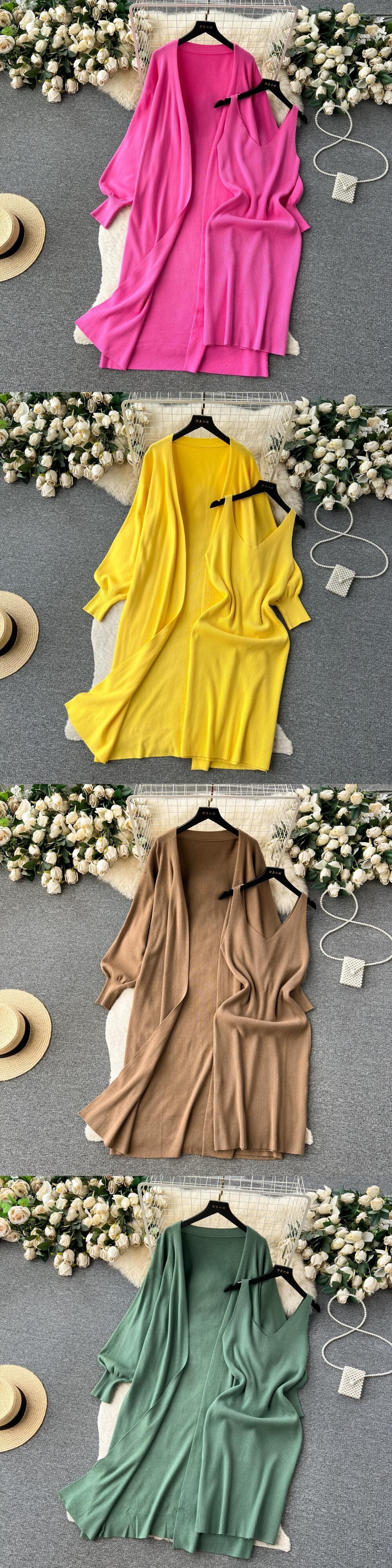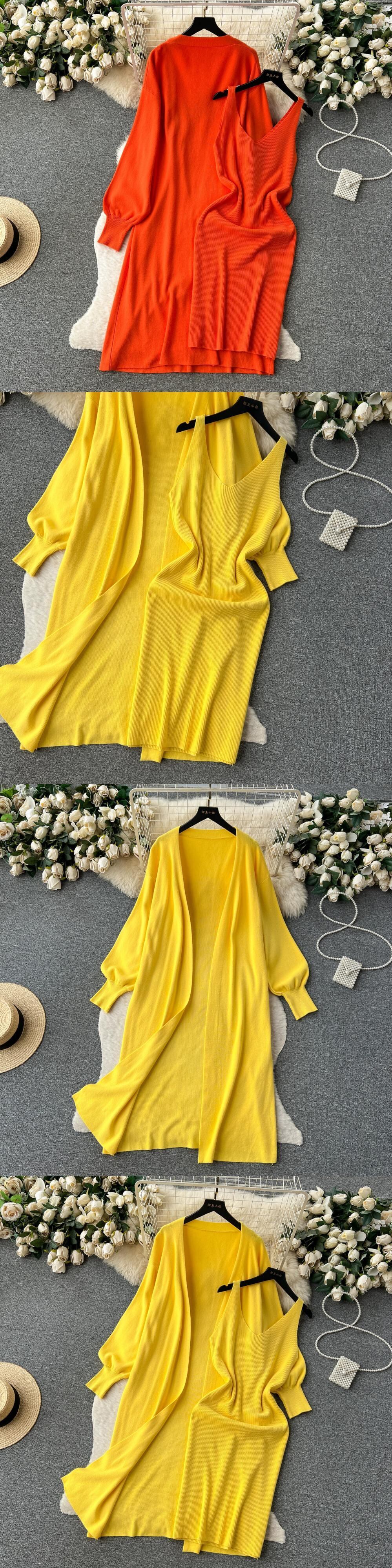 フランスのハイエンド無地ニットファッションスーツ女性、秋の V ネックサスペンダードレス + ゆったり痩身長袖ジャケット ロング オータム 秋物 Vネック ソリッドカラー lyxaj88848110176