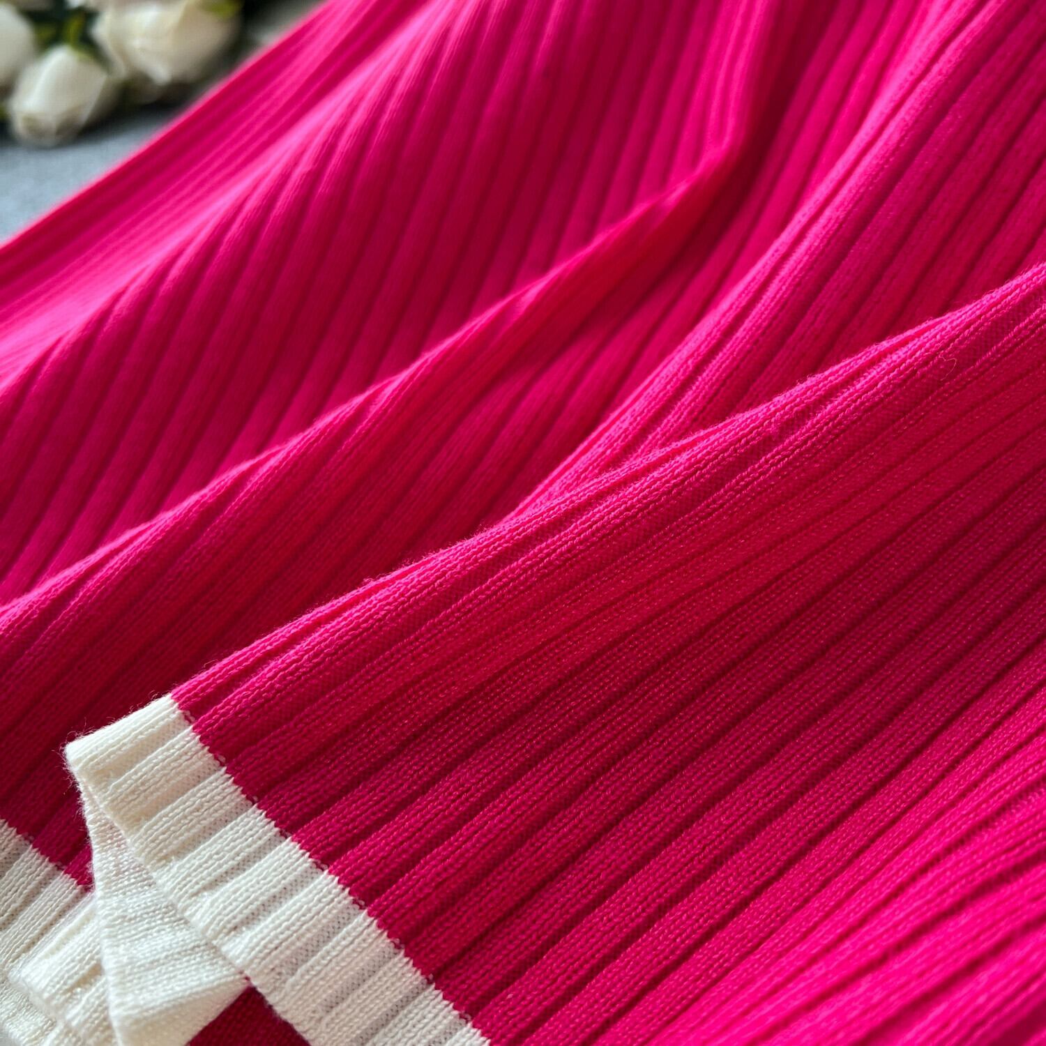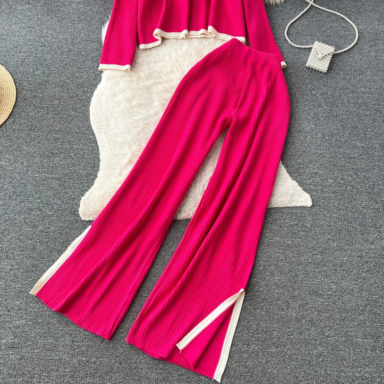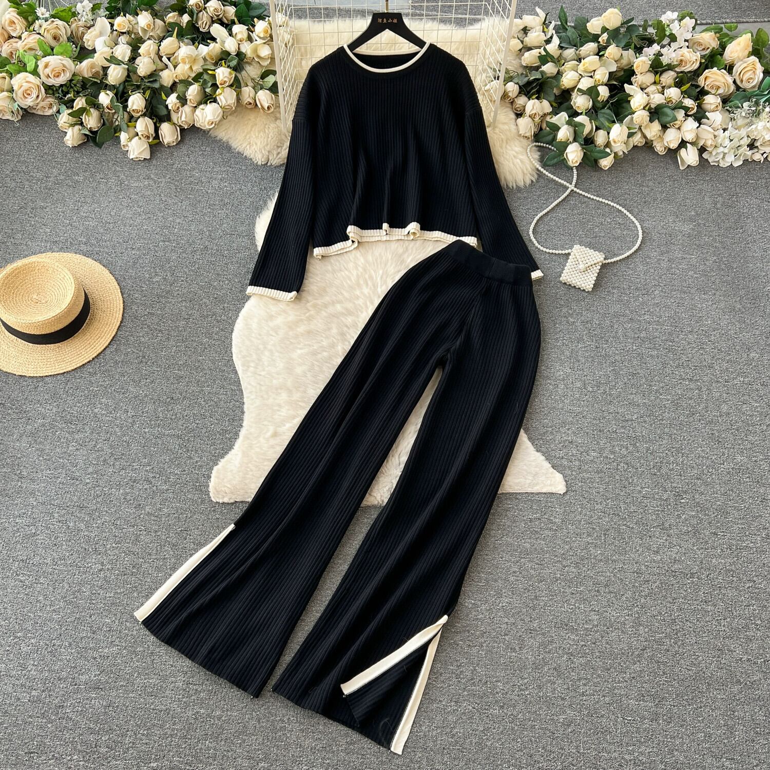 香港スタイルのレトロなファッションカジュアルルーズラウンドネック長袖セータートップツーピースセット女性ハイウエストコントラストカラーエッジパンツ ハイウェスト ロング Oネック lyxaj33717266112