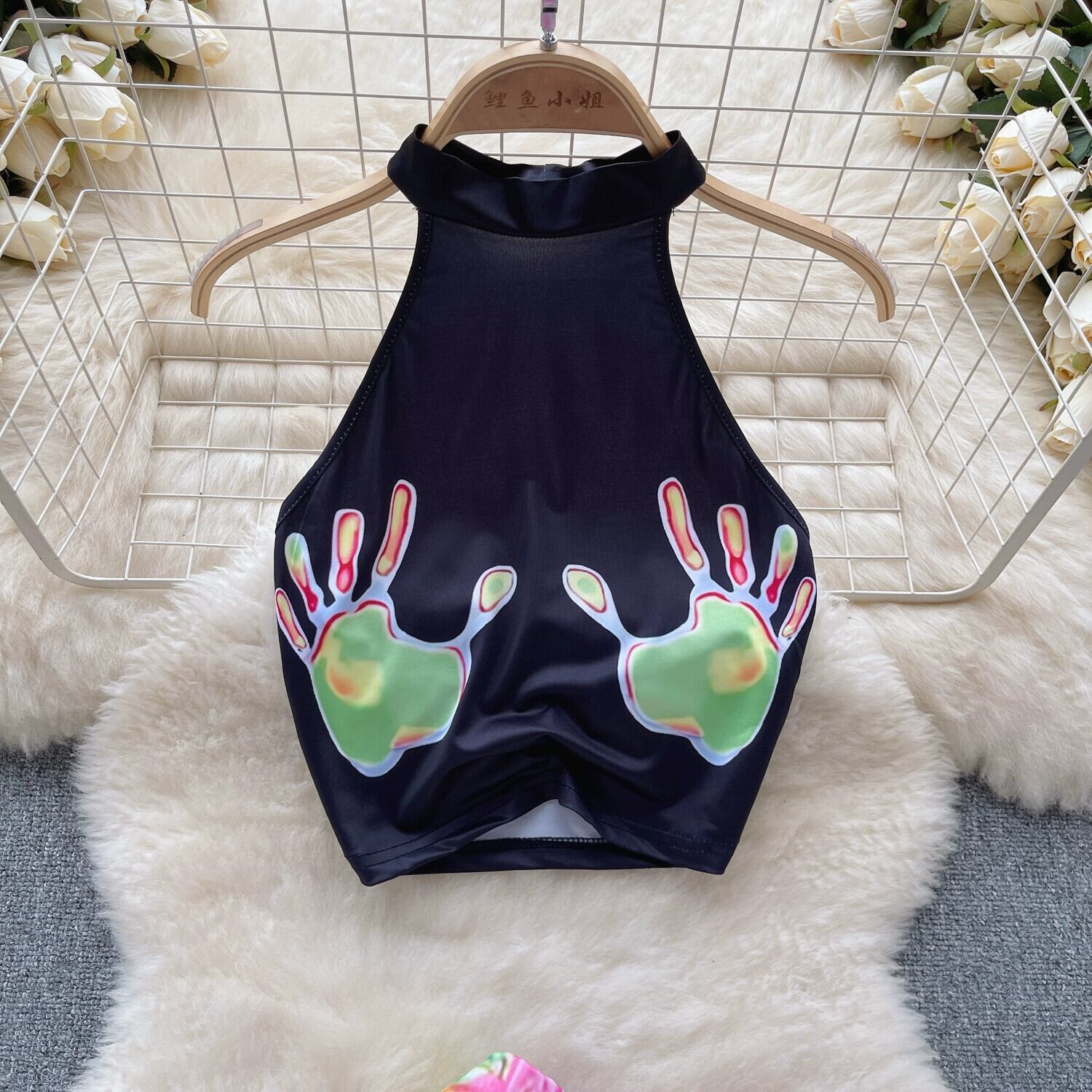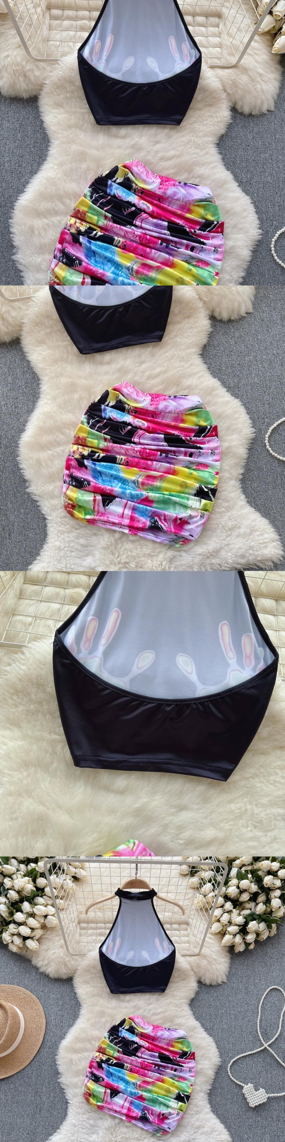 欧米インファッションスーツレディースフレンチノースリーブホルターネックプリントトップス+プリーツヒップカバーショートスカート2点セット ヨーロピアン lyxaj60942510754