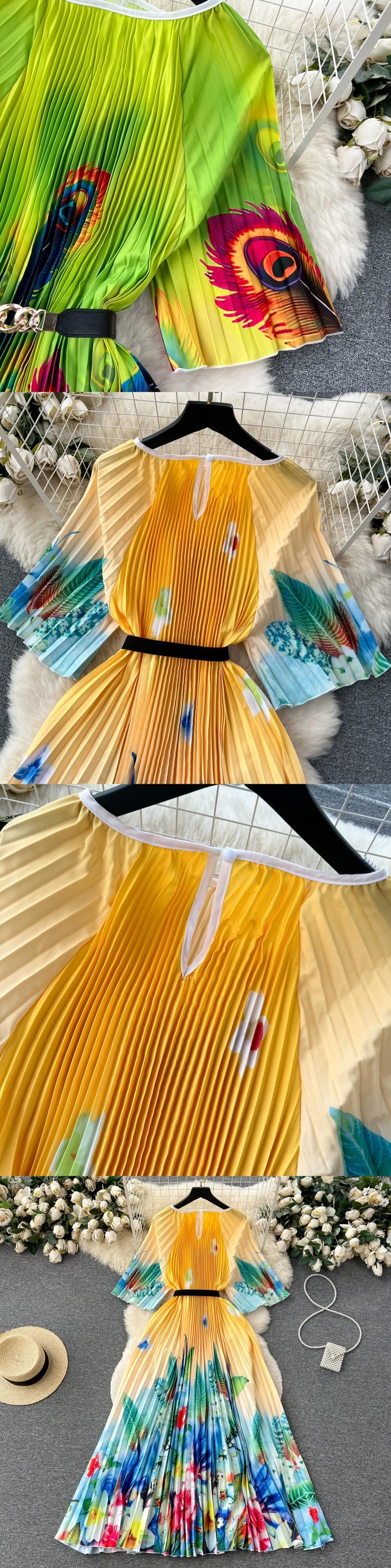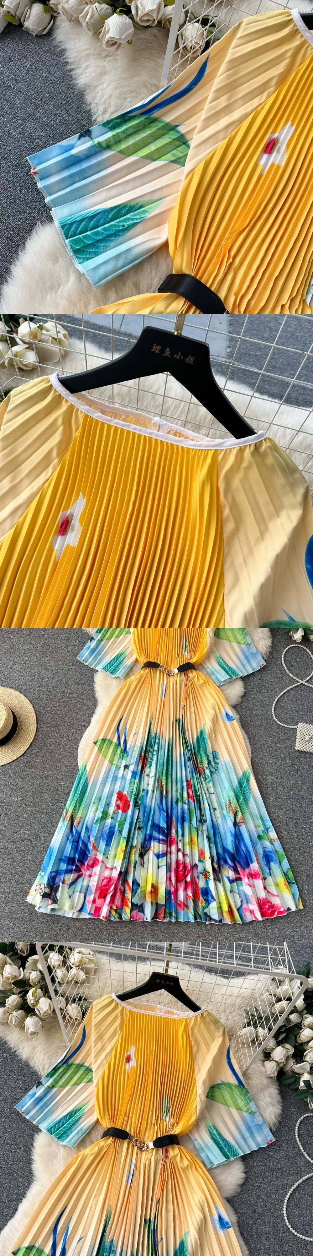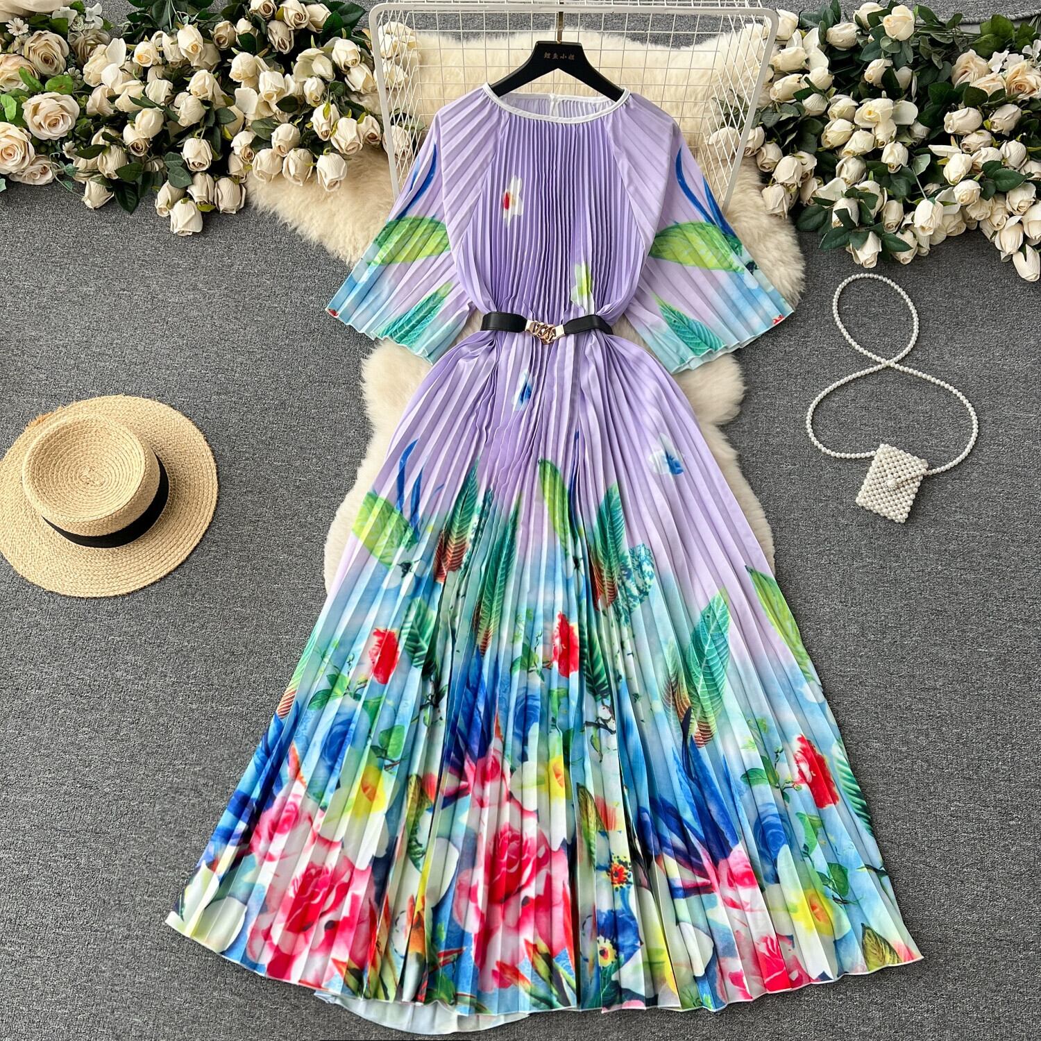 ライトラグジュアリーでハイエンドな花柄ドレスレディース。夏らしいプリーツデザイン、ニッチでシック、ヘップバーンのお姉さんっぽいロングスカート サマー 夏物 lyxaj75851955907