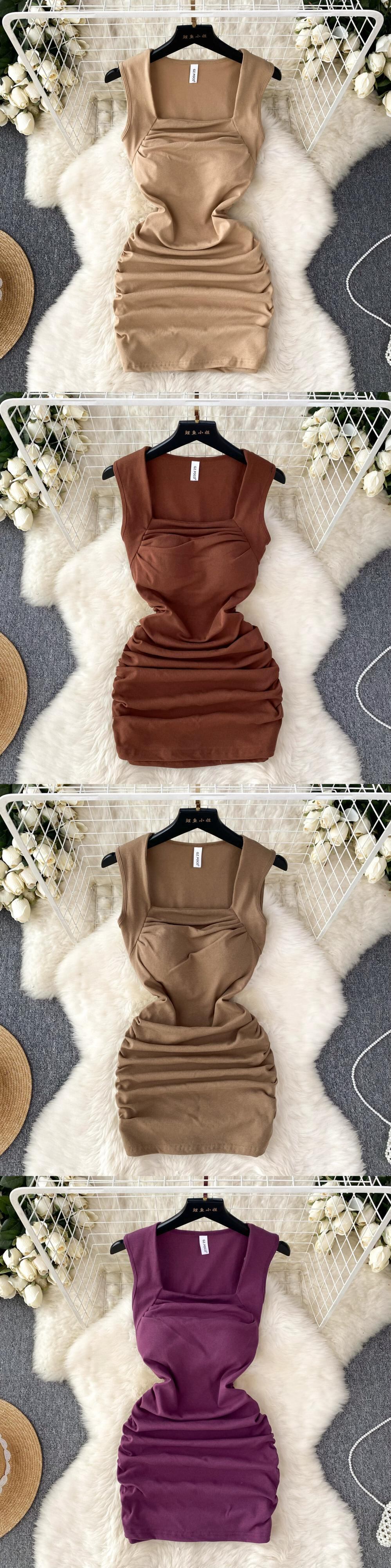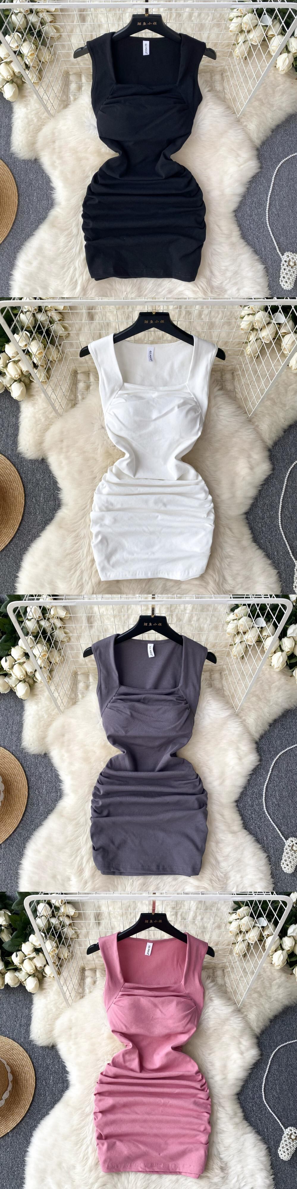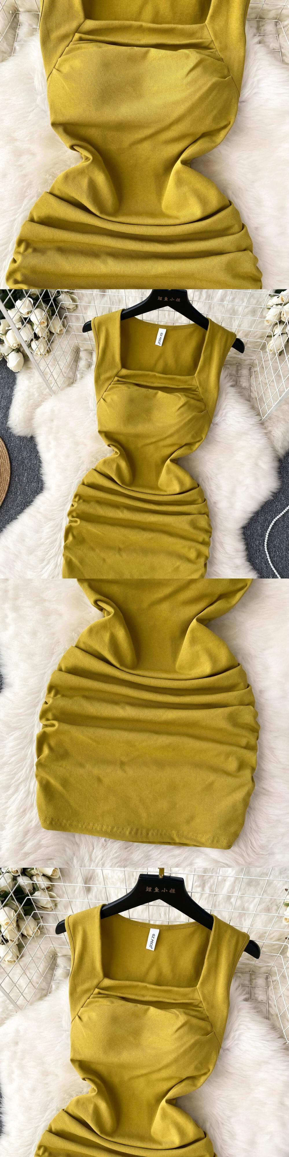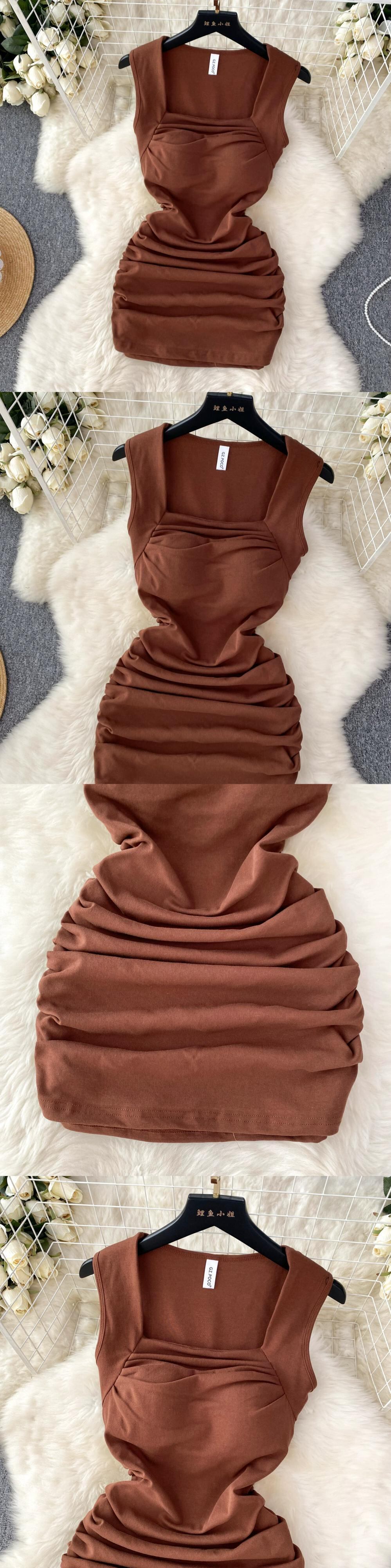 ホット純粋な欲望プリーツスクエアネックノースリーブベストドレス女性アメリカンニッチカジュアルスリムスリムヒップスカート ピュア スクウェア lyxaj32973699794