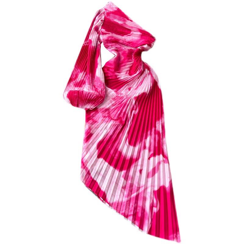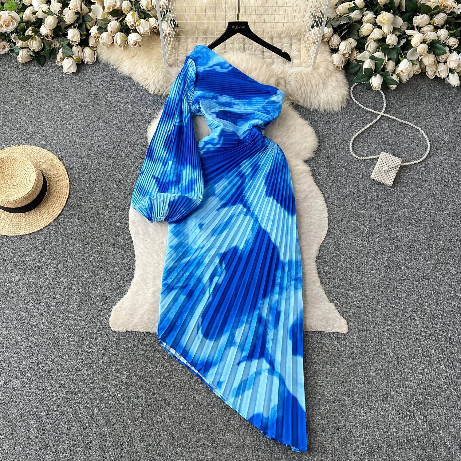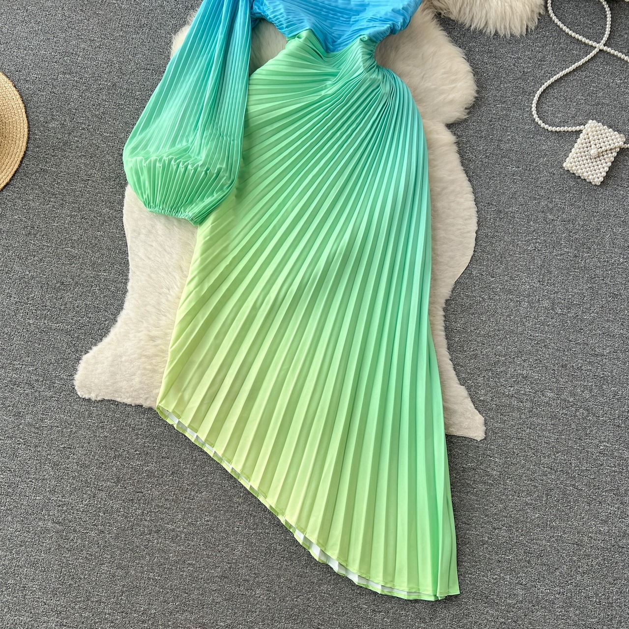 ヨーロッパとアメリカのレトロな軽い大人スタイルのグラデーションカラーの斜め襟オフショルダーランタン長袖ウエスト痩身不規則プリーツドレス ロング ヨーロピアン lyxaj70013401504