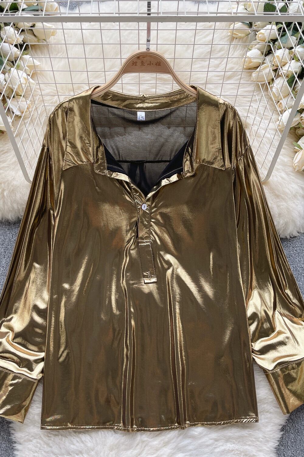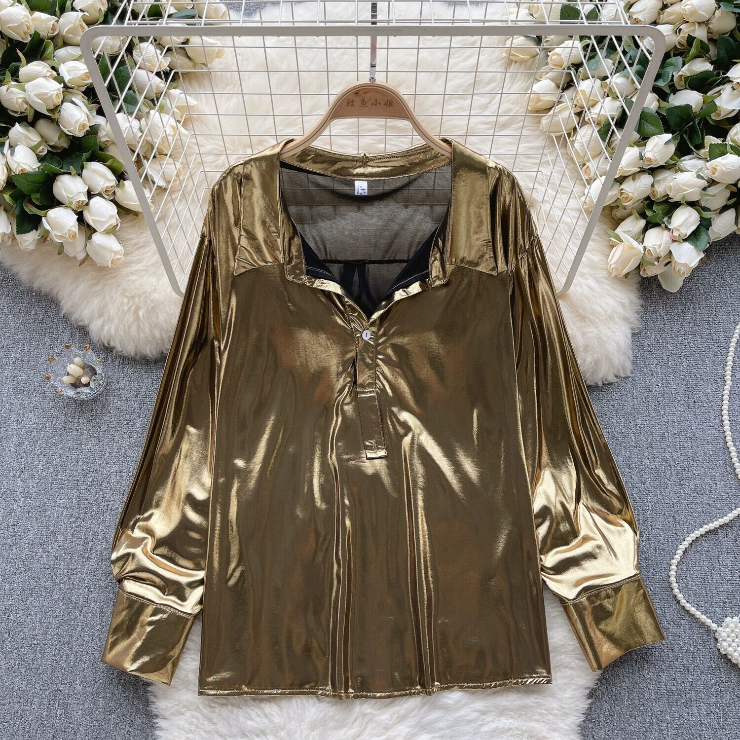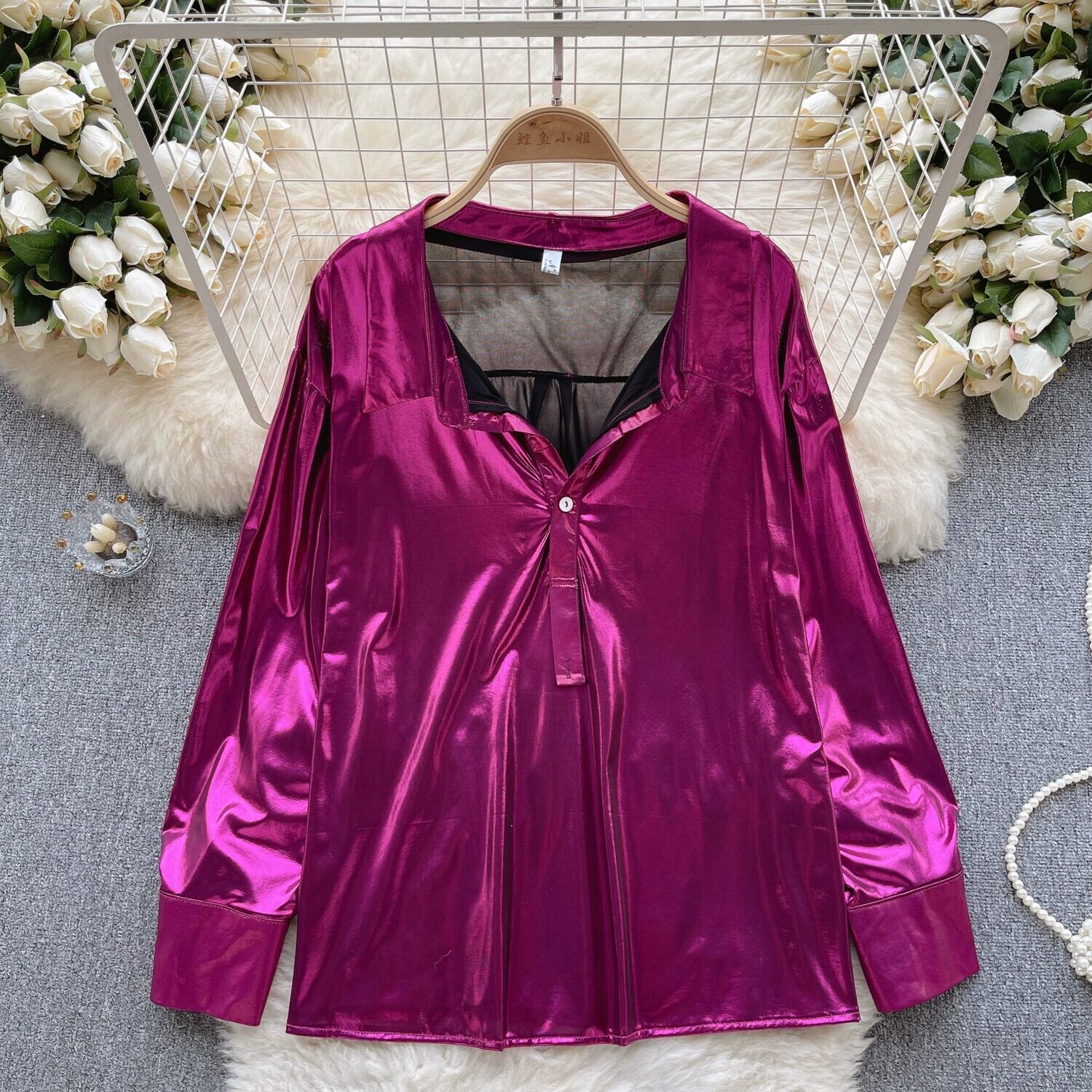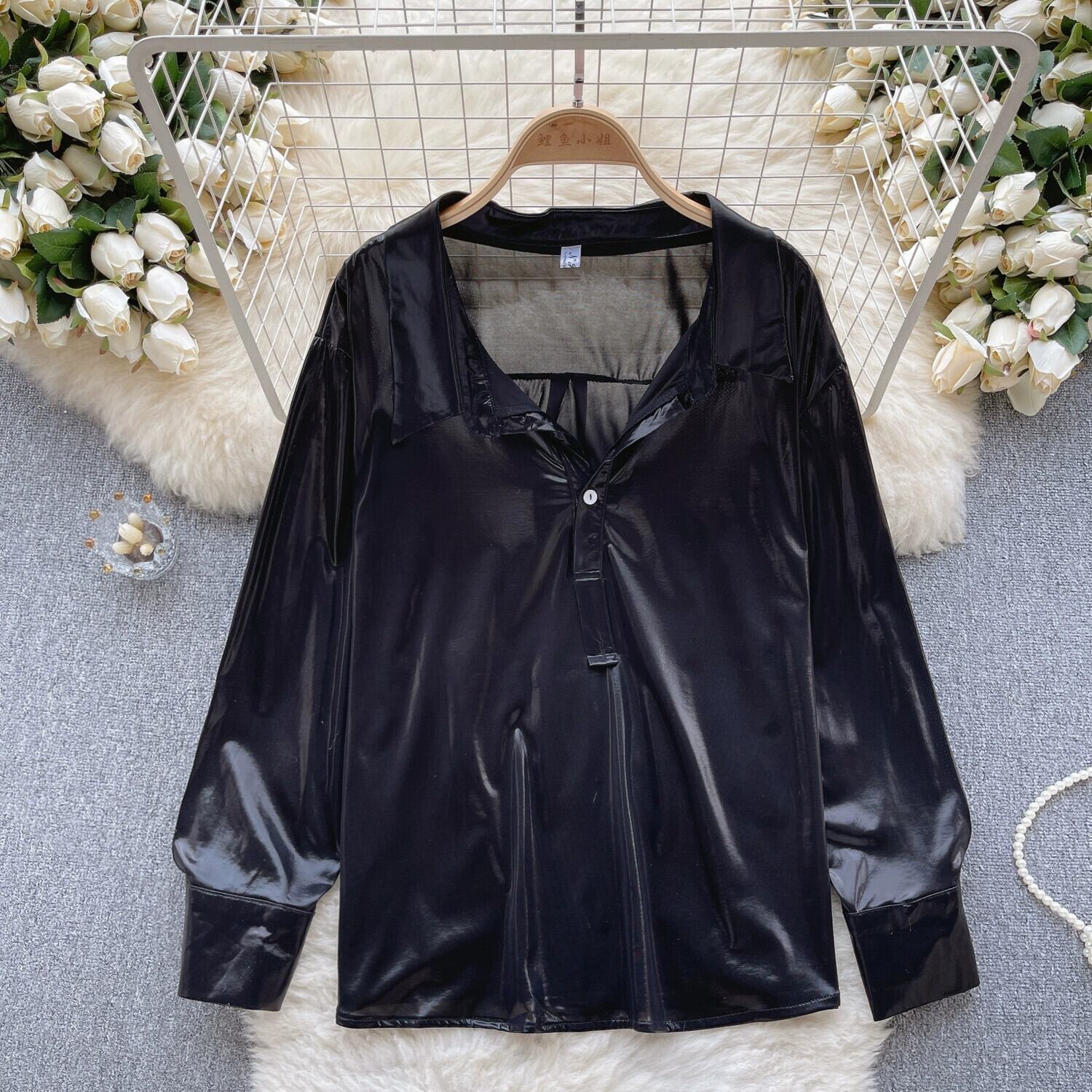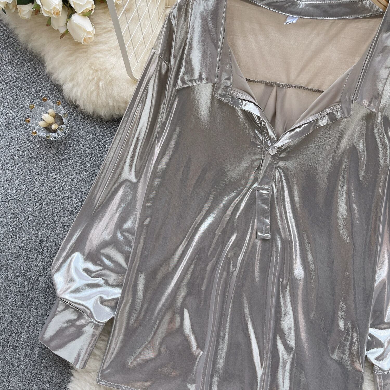 ヨーロッパとアメリカの純粋な欲望スタイルのサテン長袖シャツ女性の秋のラペルルーズ痩身メッシュデザイントップ ロング オータム 秋物 ピュア ヨーロピアン lyxaj71037401585
