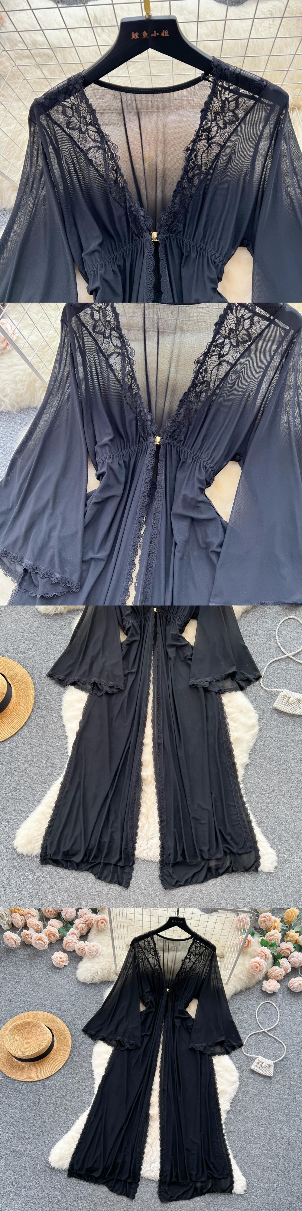 フレンチライト高級ハイエンドメッシュドレス女性の夏の長袖シースルー誘惑デザイン感情的な楽しいパジャマロングドレス サマー 夏物 lyxaj25891104760