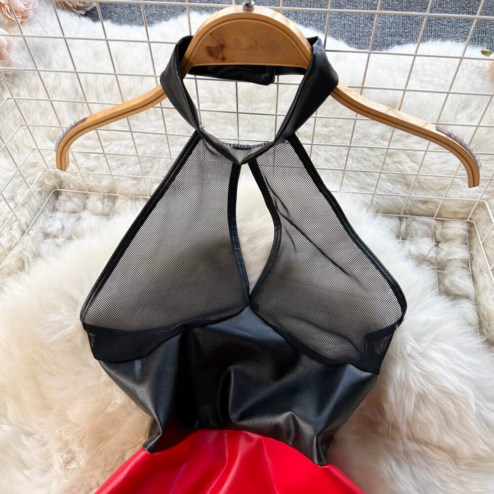 ヨーロッパとアメリカンスタイルのメッシュ中空ステッチホルターネック PU レザーショートスカートノースリーブセクシーなヒップカバーチューブトップドレス女性 ヨーロピアン lyxaj40872097263