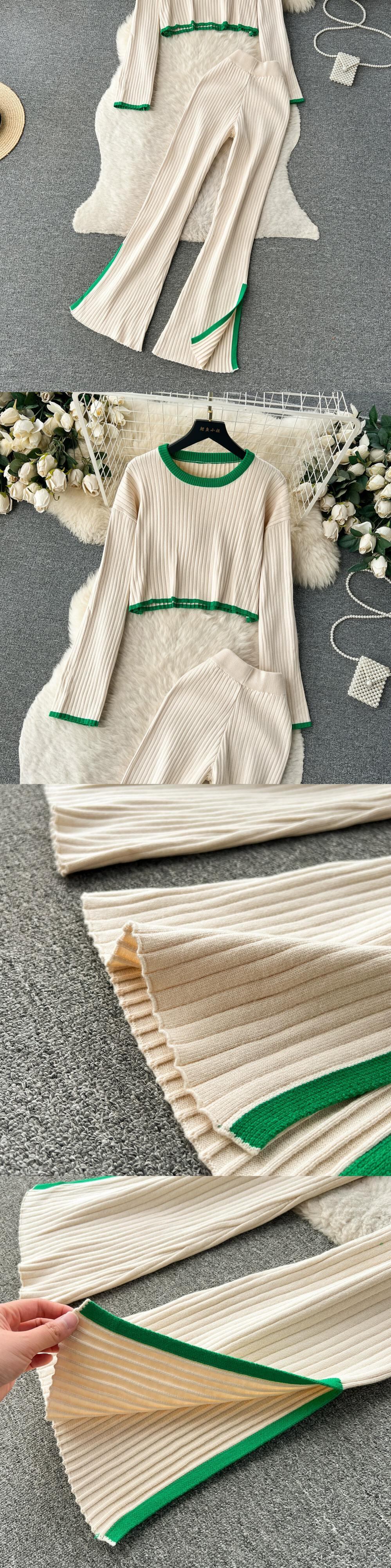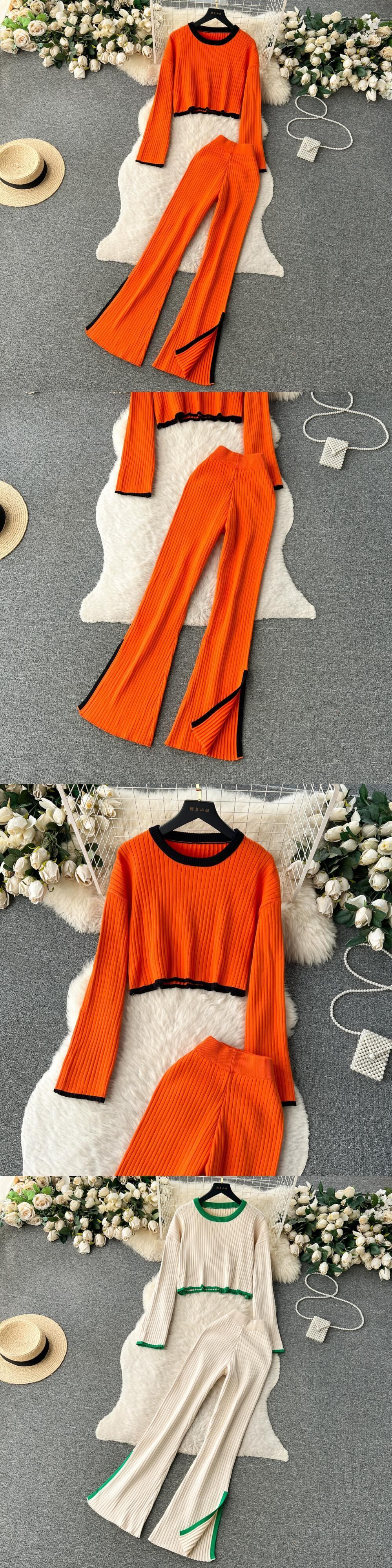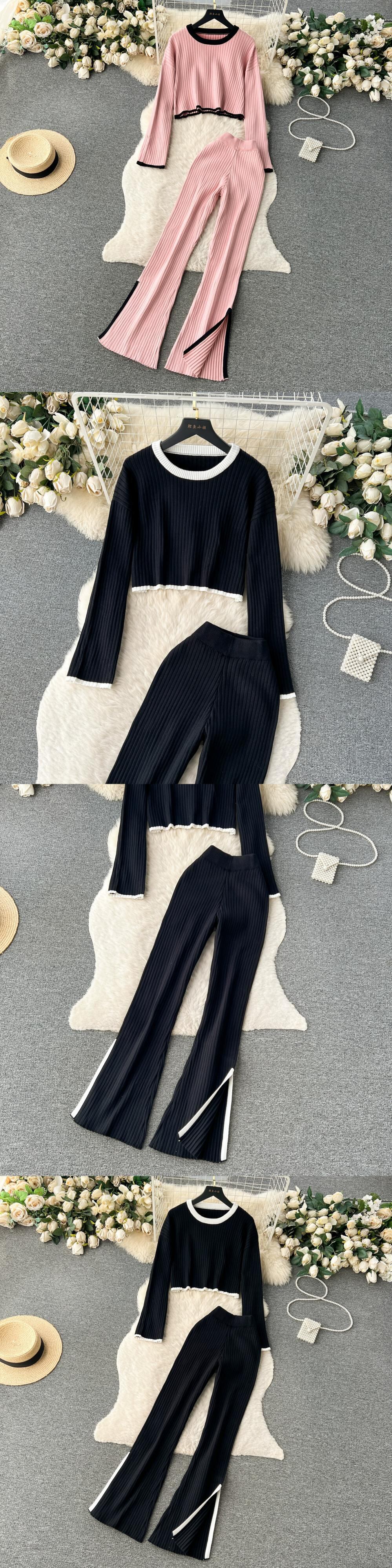 レトロヘボンスタイルニットラウンドネックショート長袖トップ+ハイウエスト痩身ドレープスリットパンツ秋冬スーツ ロング オータム 秋物 ウィンター 冬物 lyxaj6486108457