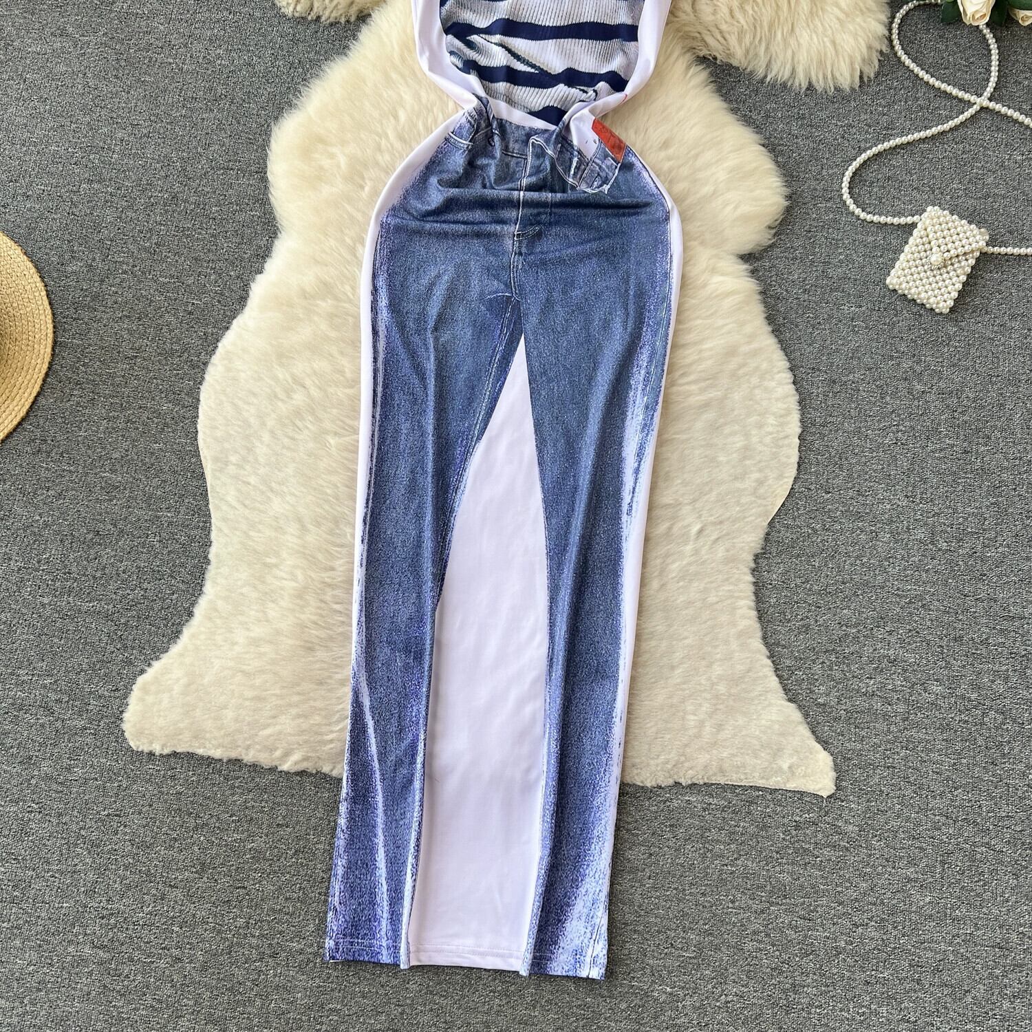ヨーロッパとアメリカのストリートニッチデザイン立体デニムプリントスリムスリムノースリーブベストドレスレディースロングスカート ヨーロピアン lyxaj31678279334