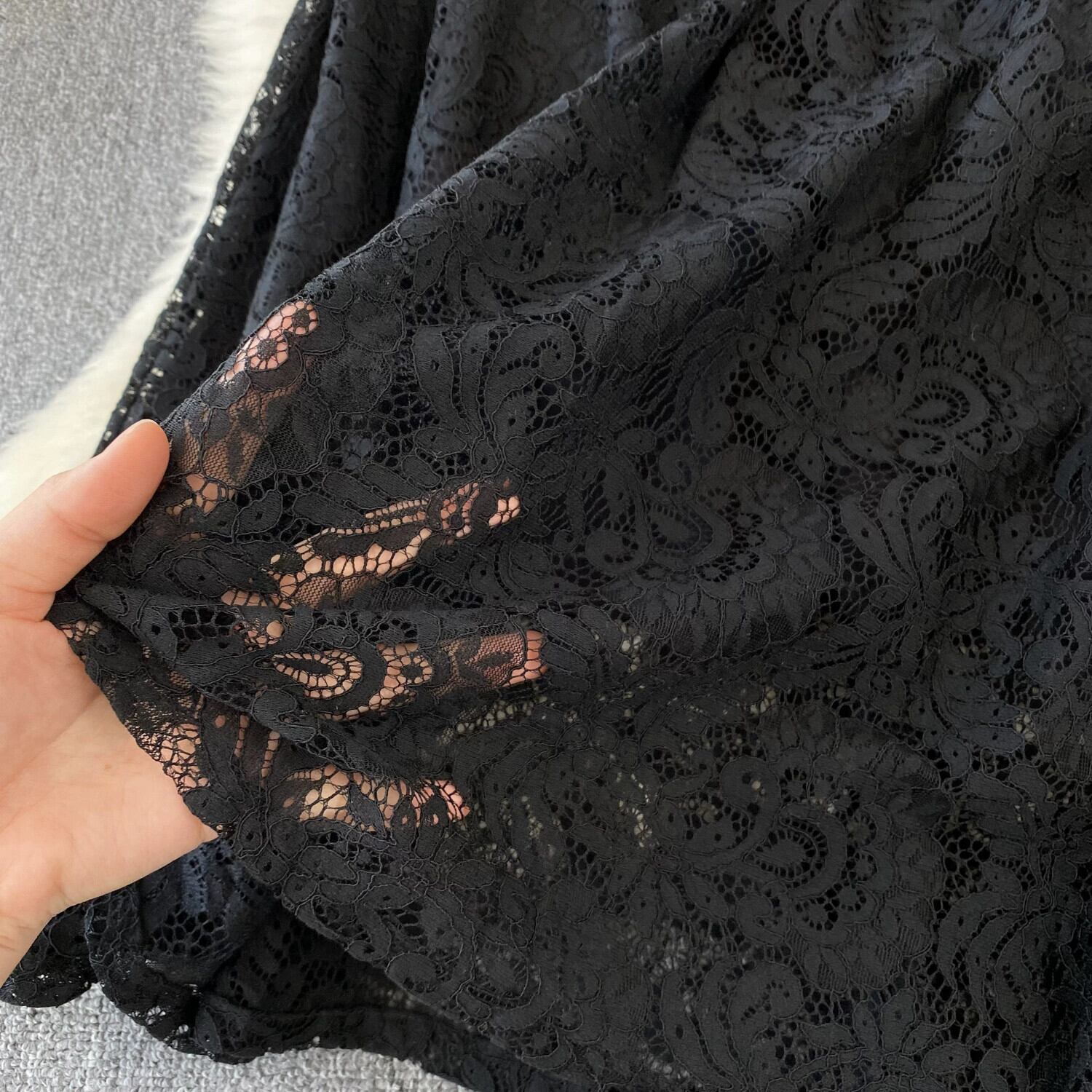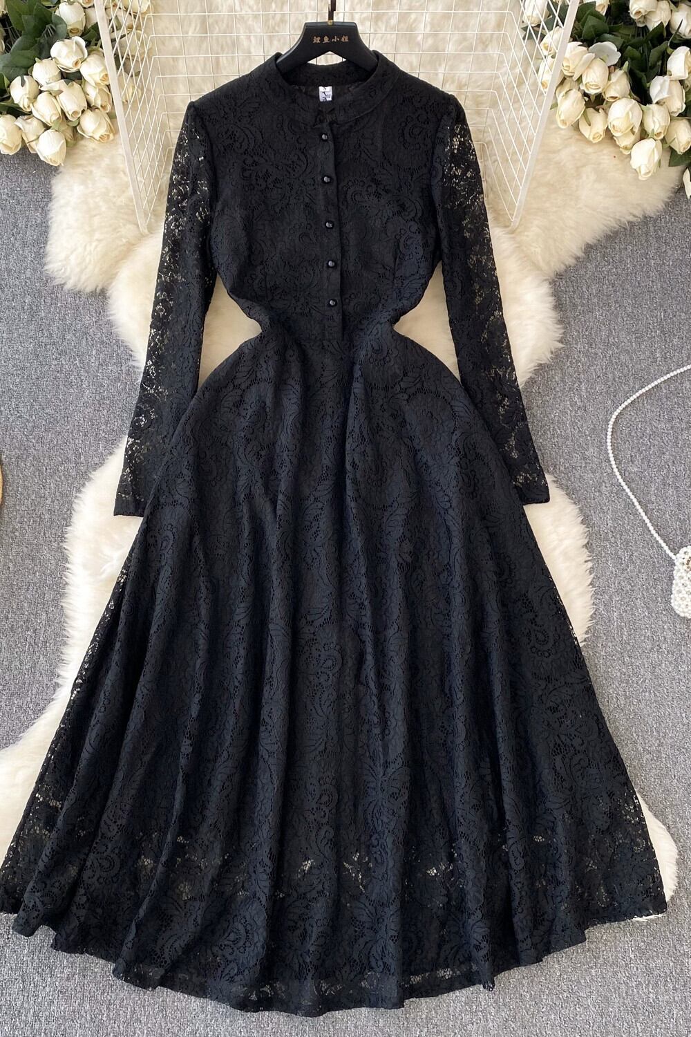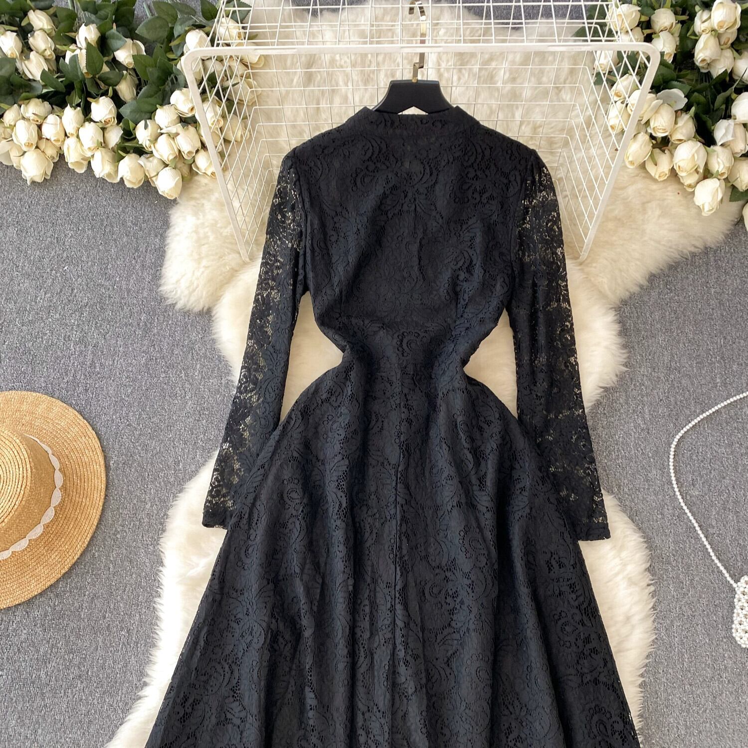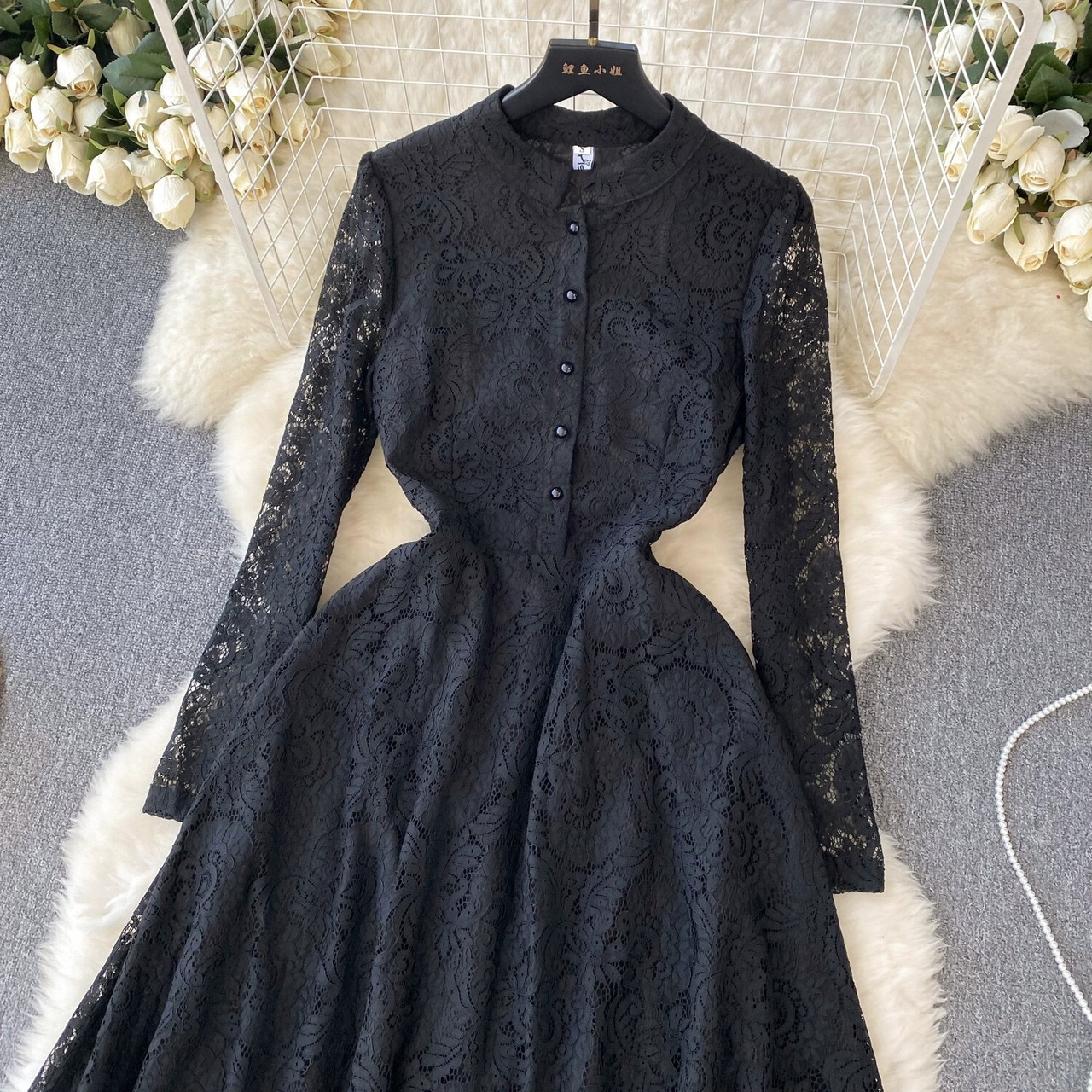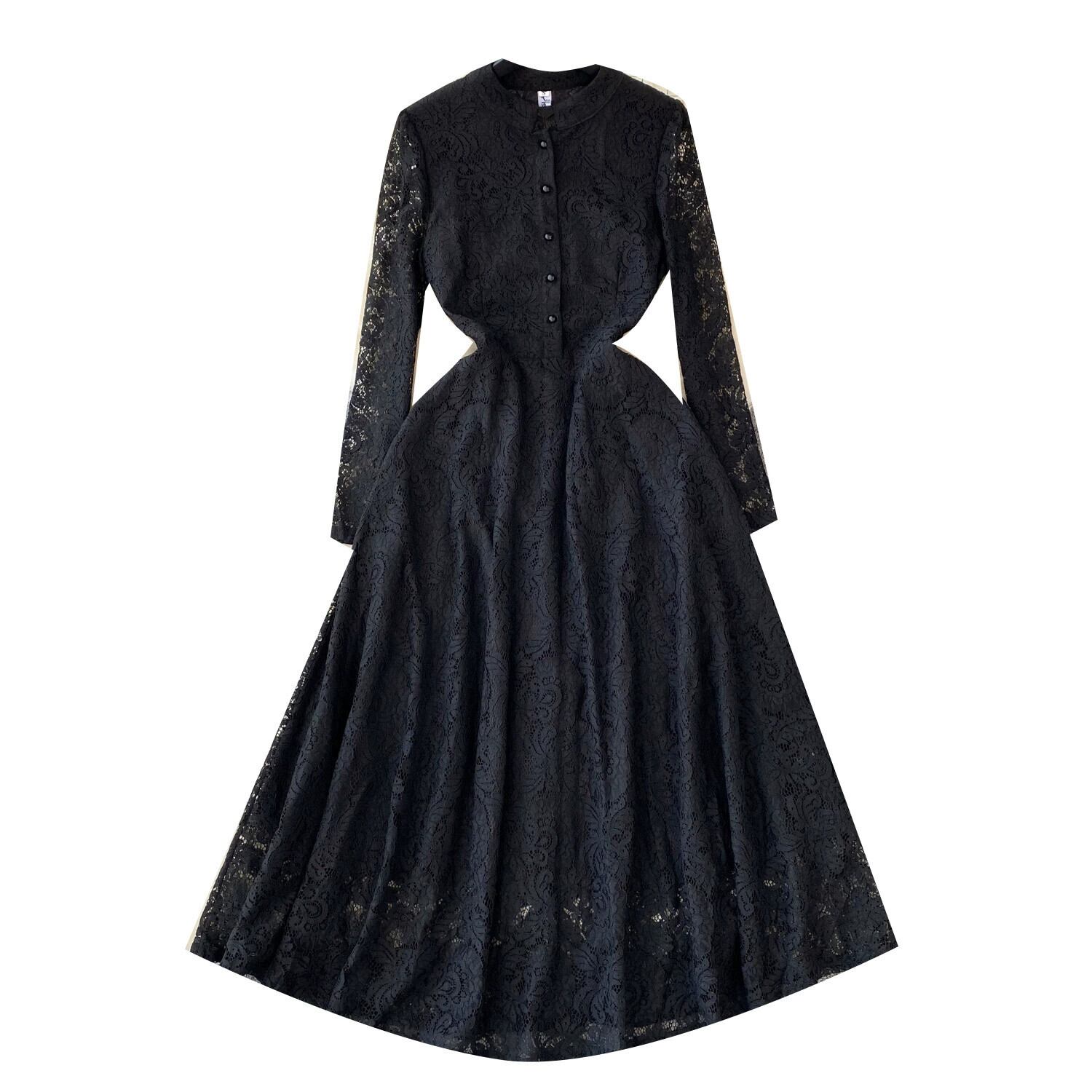 レトロなヘップバーンスタイルのスタンドカラー長袖レースドレススリムウエストとスリムな気質の女性フランスの軽い豪華でエレガントなリトルブラックドレス ロング lyxaj35999856015