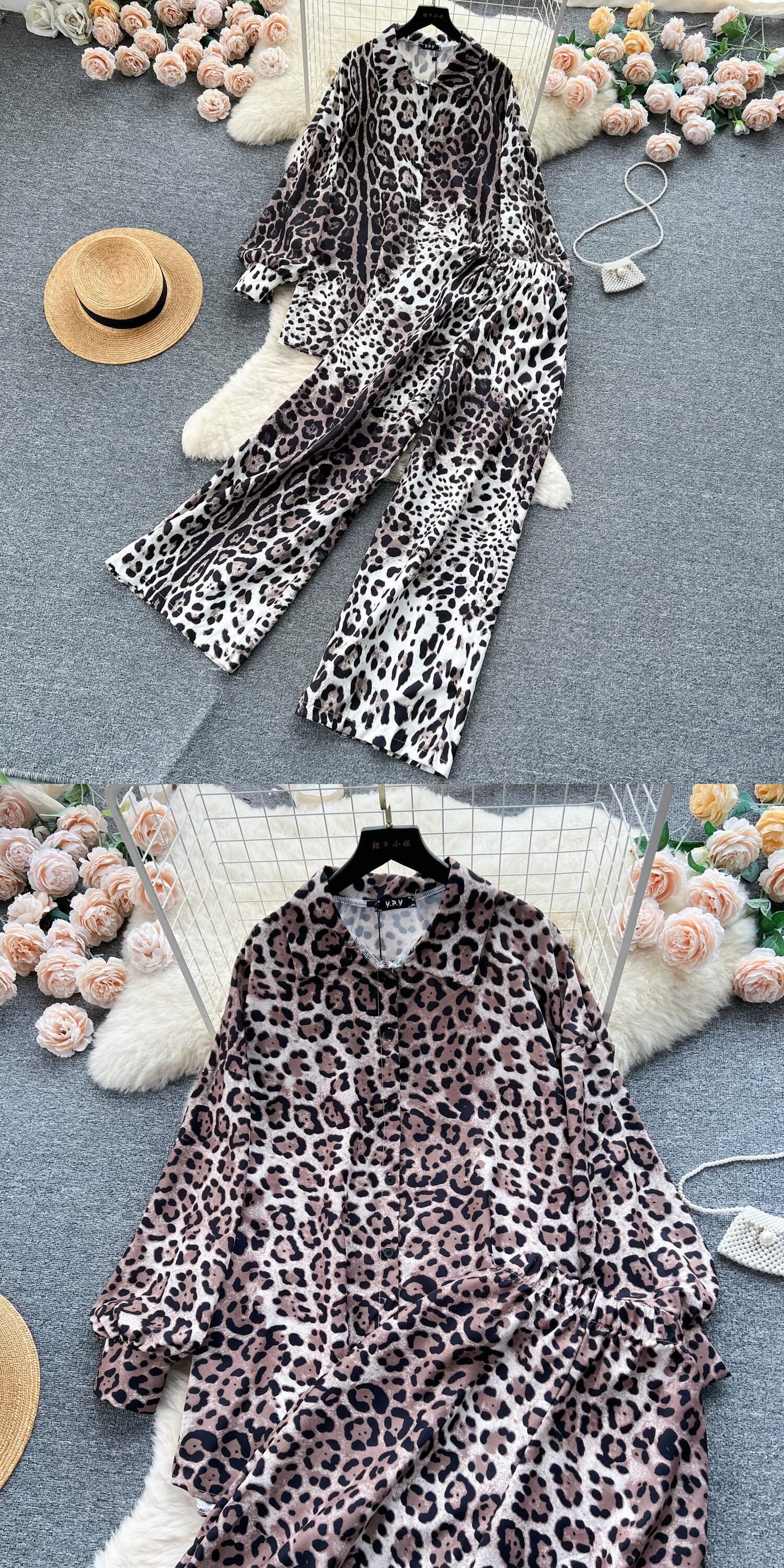 ヨーロッパとアメリカンスタイルのファッションハイエンドヒョウ柄スーツレディースカジュアルルーズ長袖ラペルシャツハイウエスト痩身ワイドレッグパンツ ロング ヨーロピアン lyxaj278925146