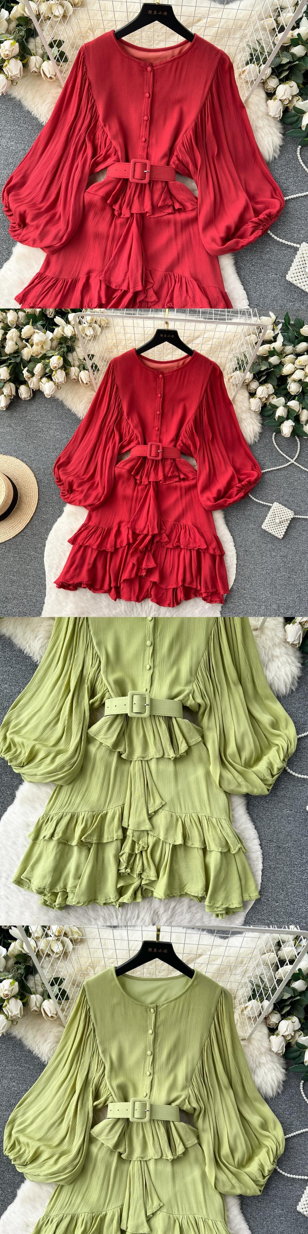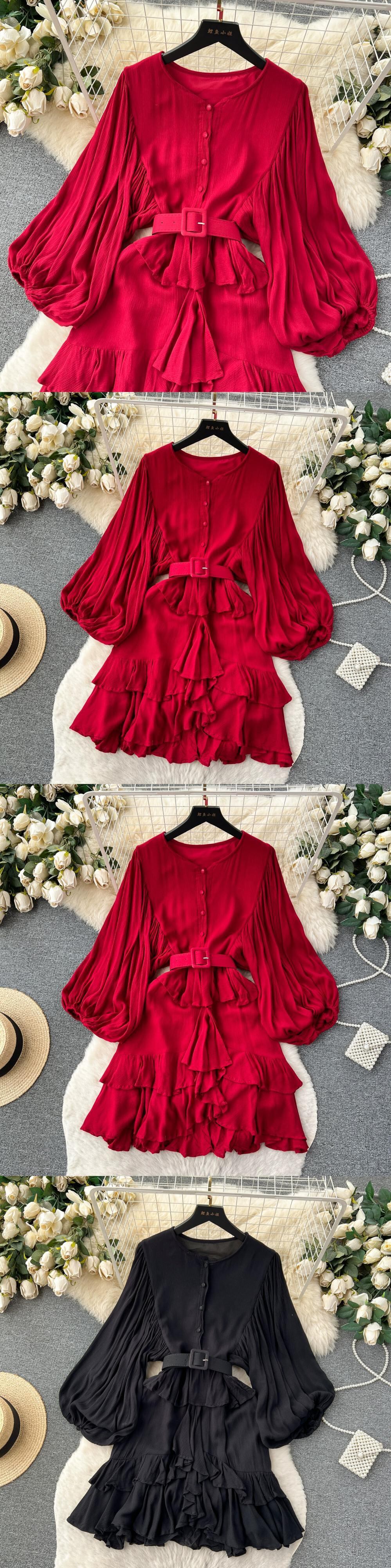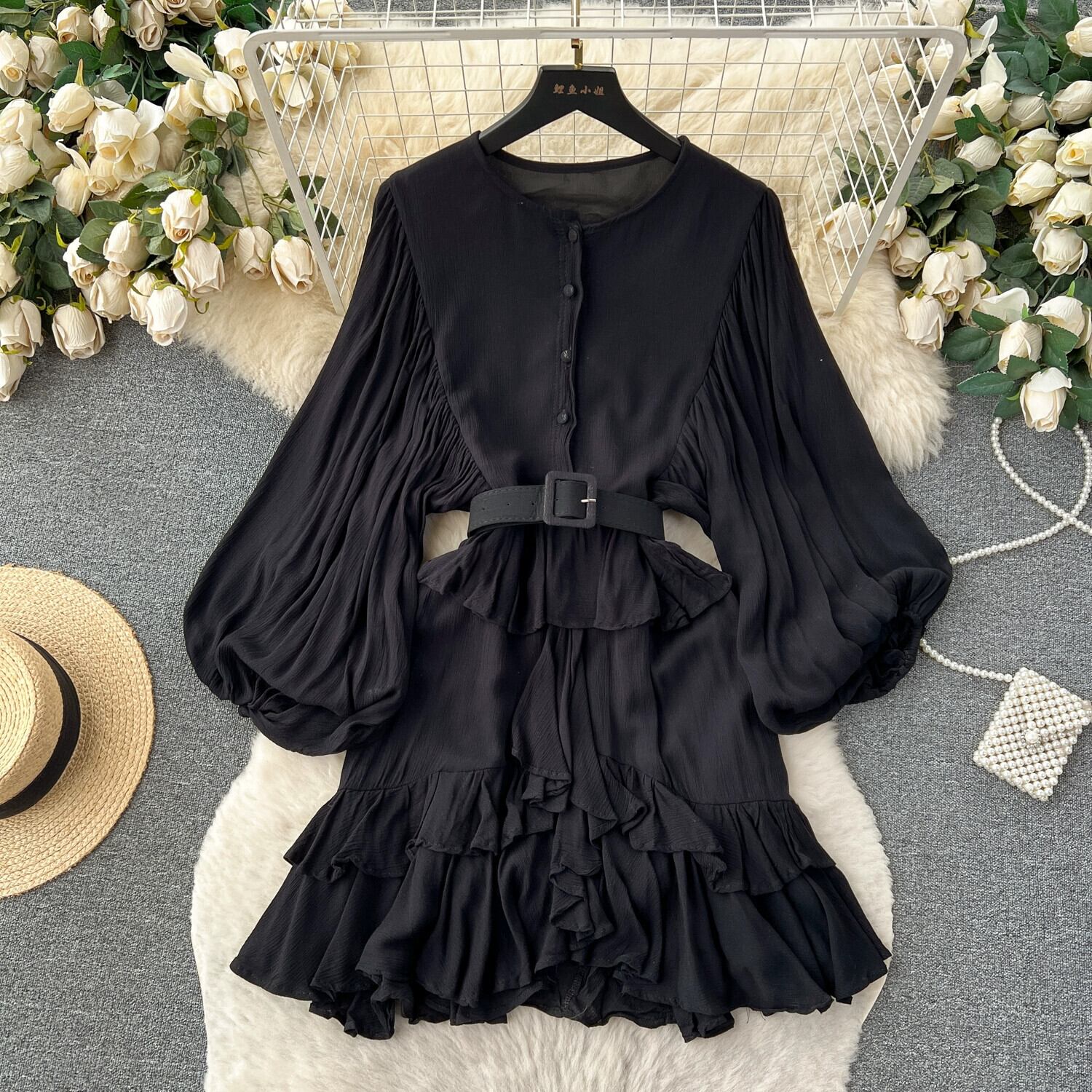 レトロ宮殿スタイルパフスリーブドレス女性の秋フリルウエスト気質ニッチライト高級妖精ドレス レース オータム 秋物 lyxaj77088304767