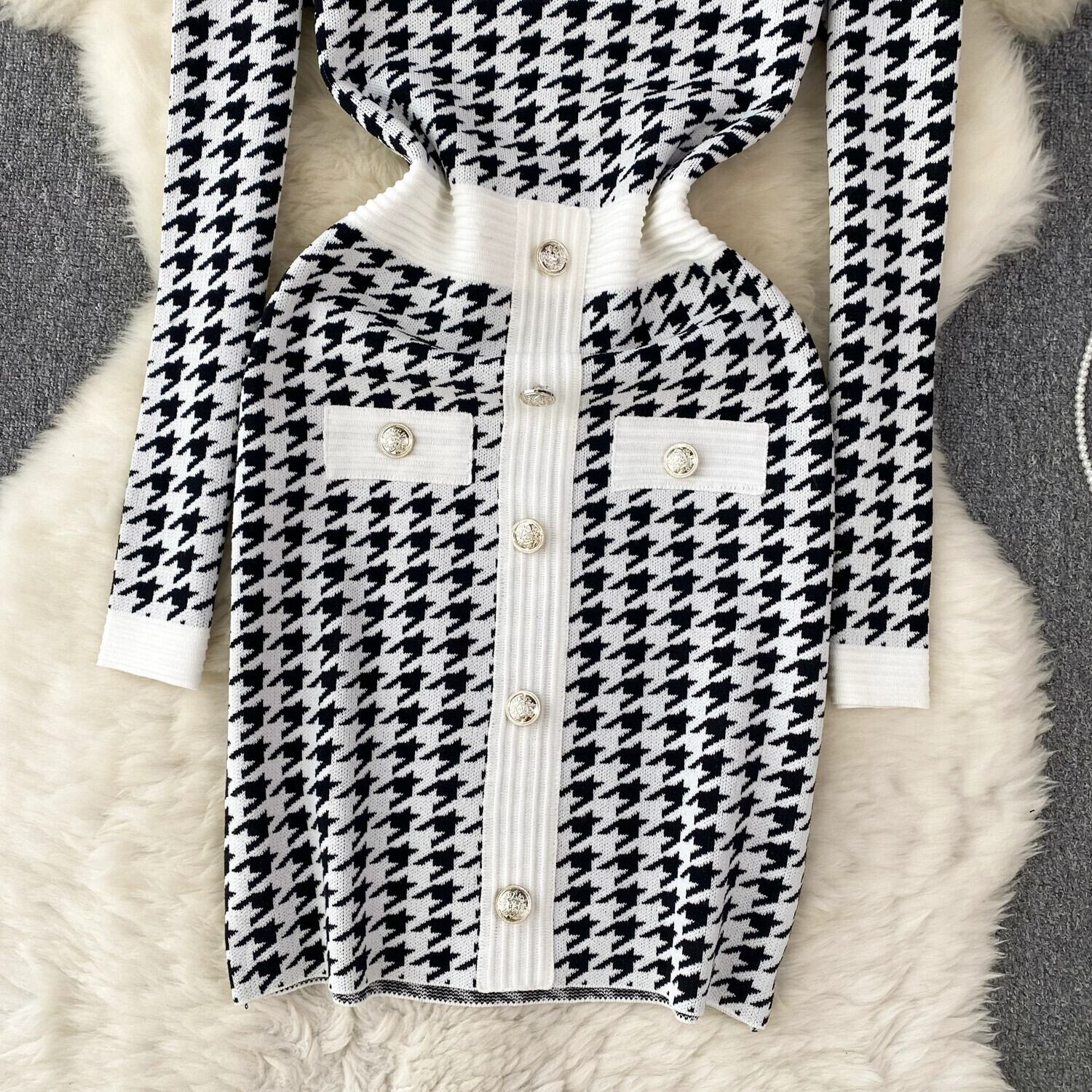 フレンチライト高級ハイエンドチェック柄ニットドレス女性秋冬、ウエストを締める長袖デザイン、超妖精の気質のドレス ロング オータム 秋物 ウィンター 冬物 lyxaj22135770020