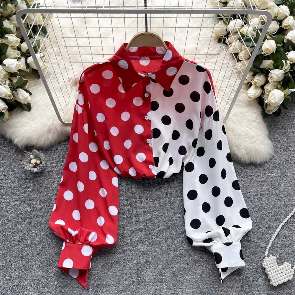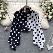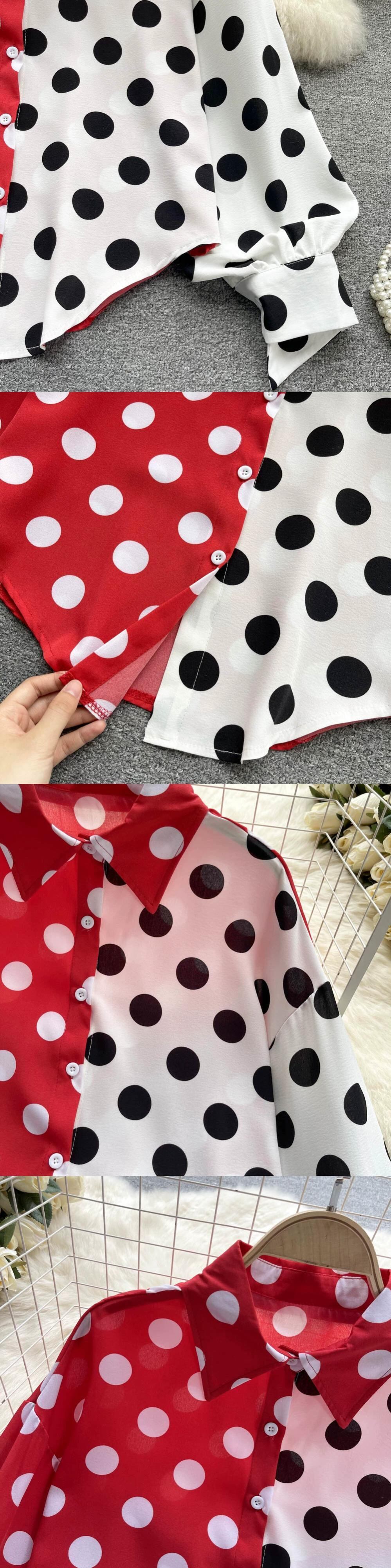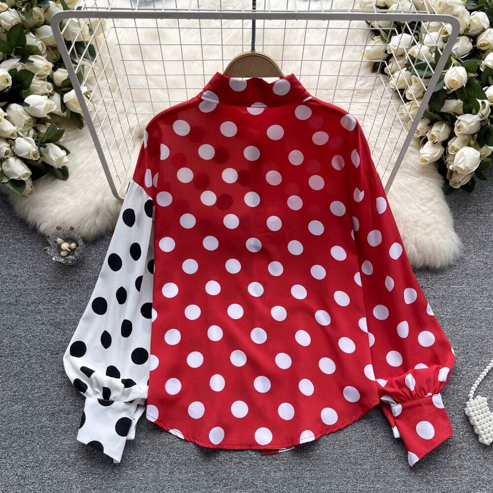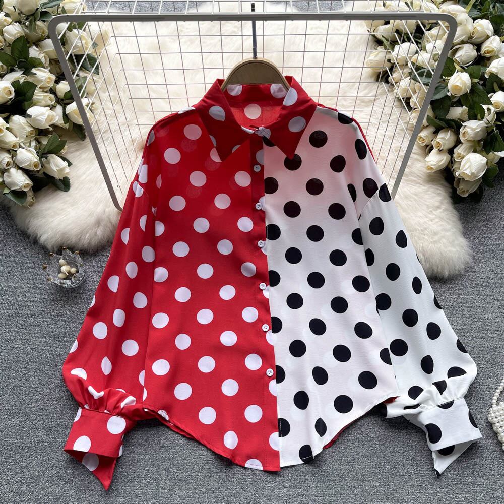 フランスのレトロなコントラストカラーの水玉シャツの春夏の女性、ゆったり、スリム、ファッショナブルで多用途な長袖シフォントップ ロング スプリング 春物 サマー 夏物 lyxaj43241893150