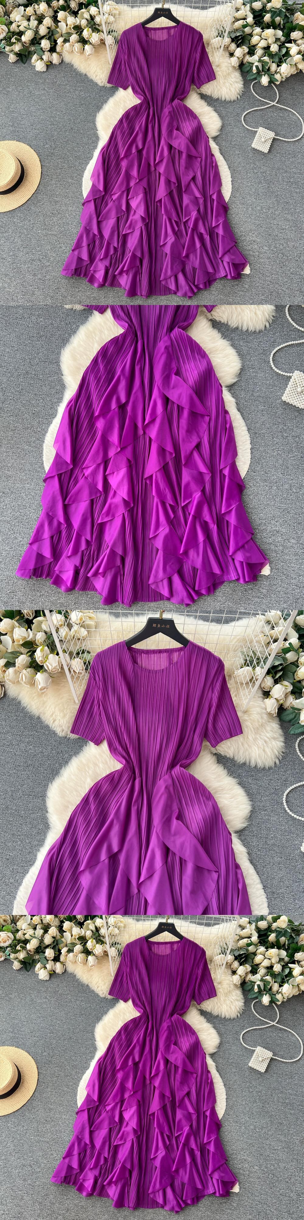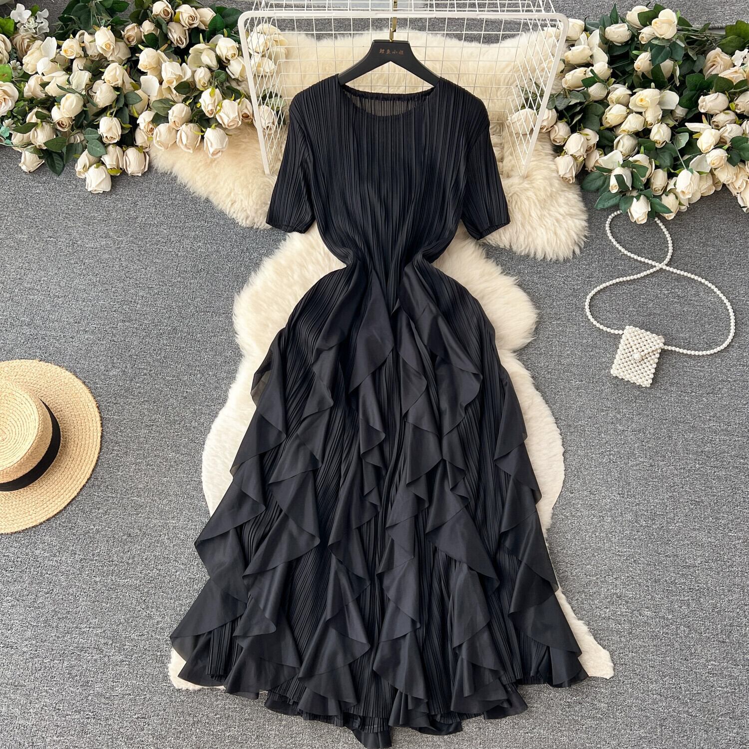 軽く豪華でハイエンドのラウンドネック半袖プリーツフリルドレス女性ハイウエストとスリムな気質カジュアル休日ロングスカート ハイウェスト Oネック lyxaj98462051974