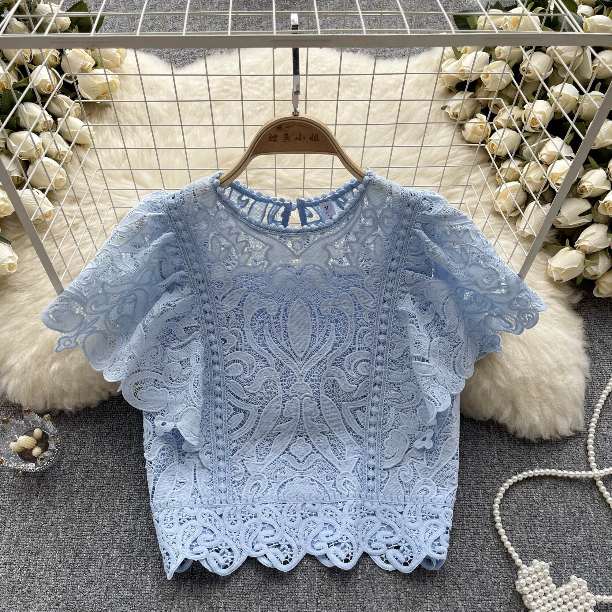 フランスの甘くて優しいラウンドネック小さなフライングスリーブレーストップ女性 2023 夏の新しいハイウエストショート多目的シャツ 大人ガーリー スウィート キュート カジュアル サマー 夏物 Oネック lyxaj55097257475