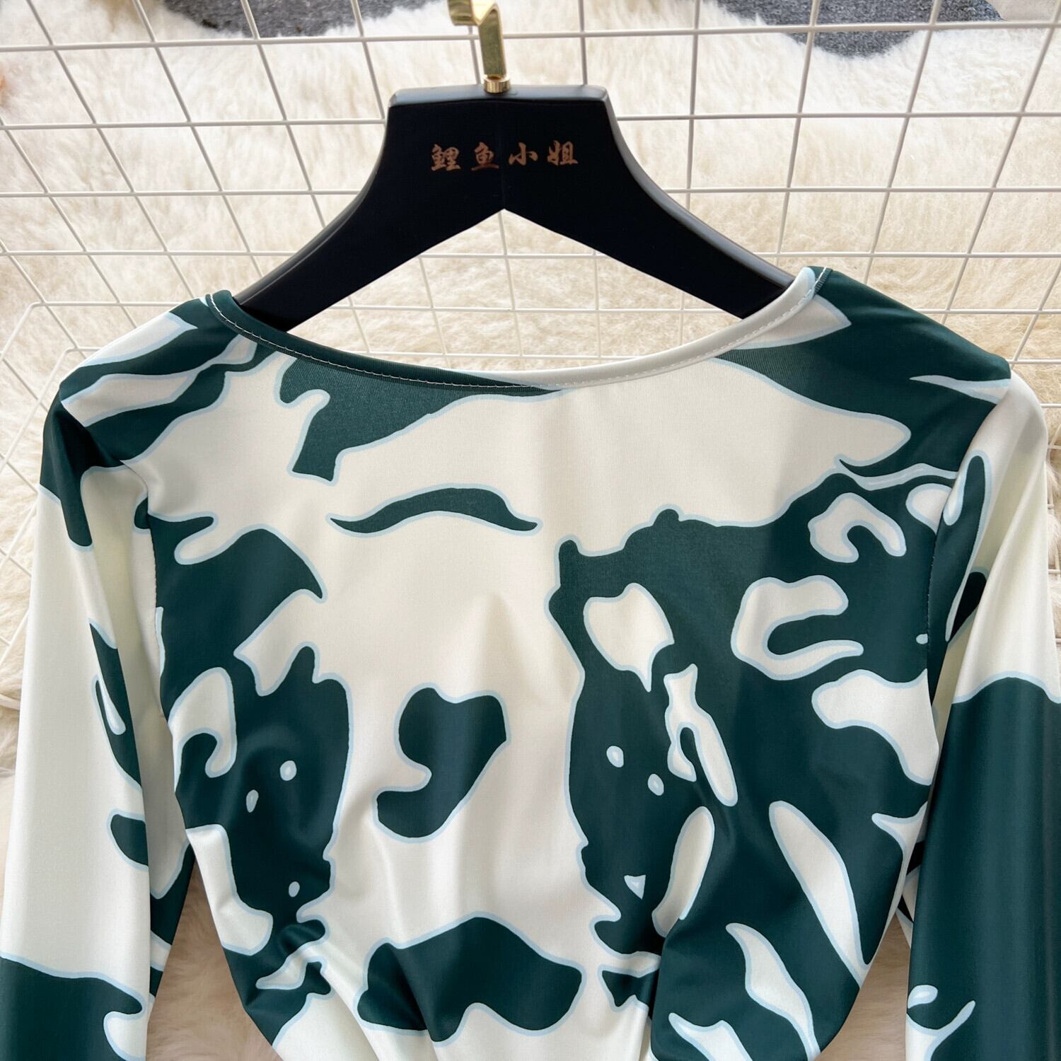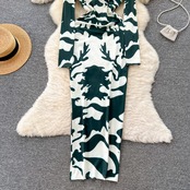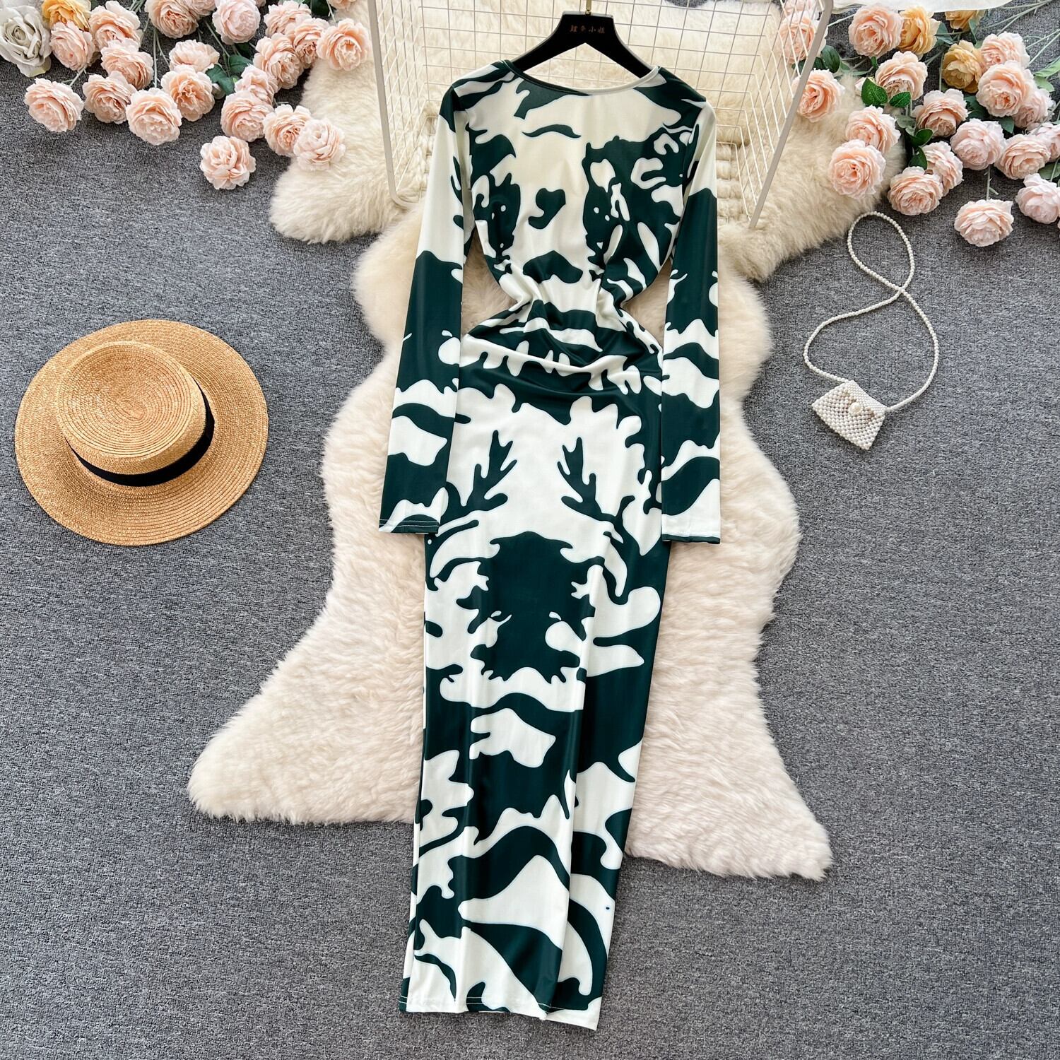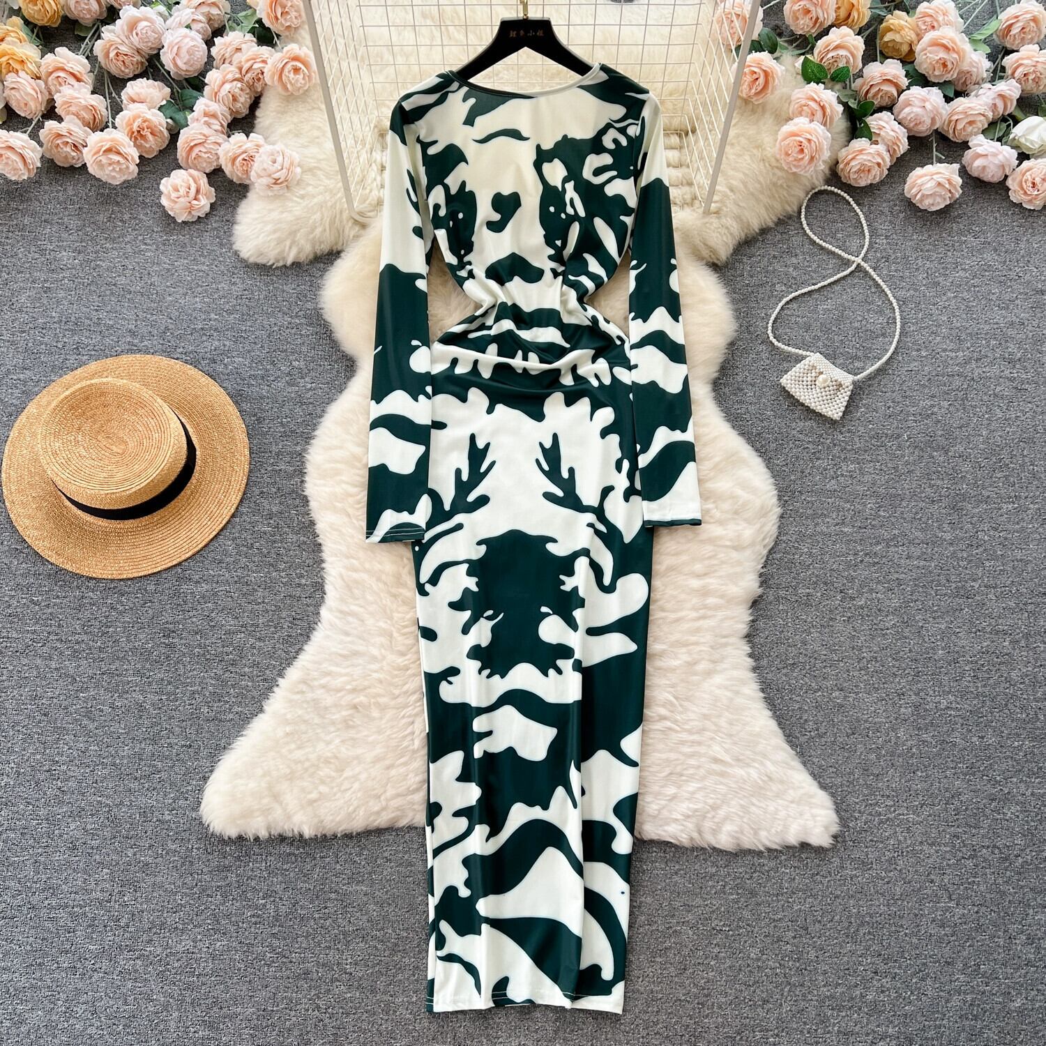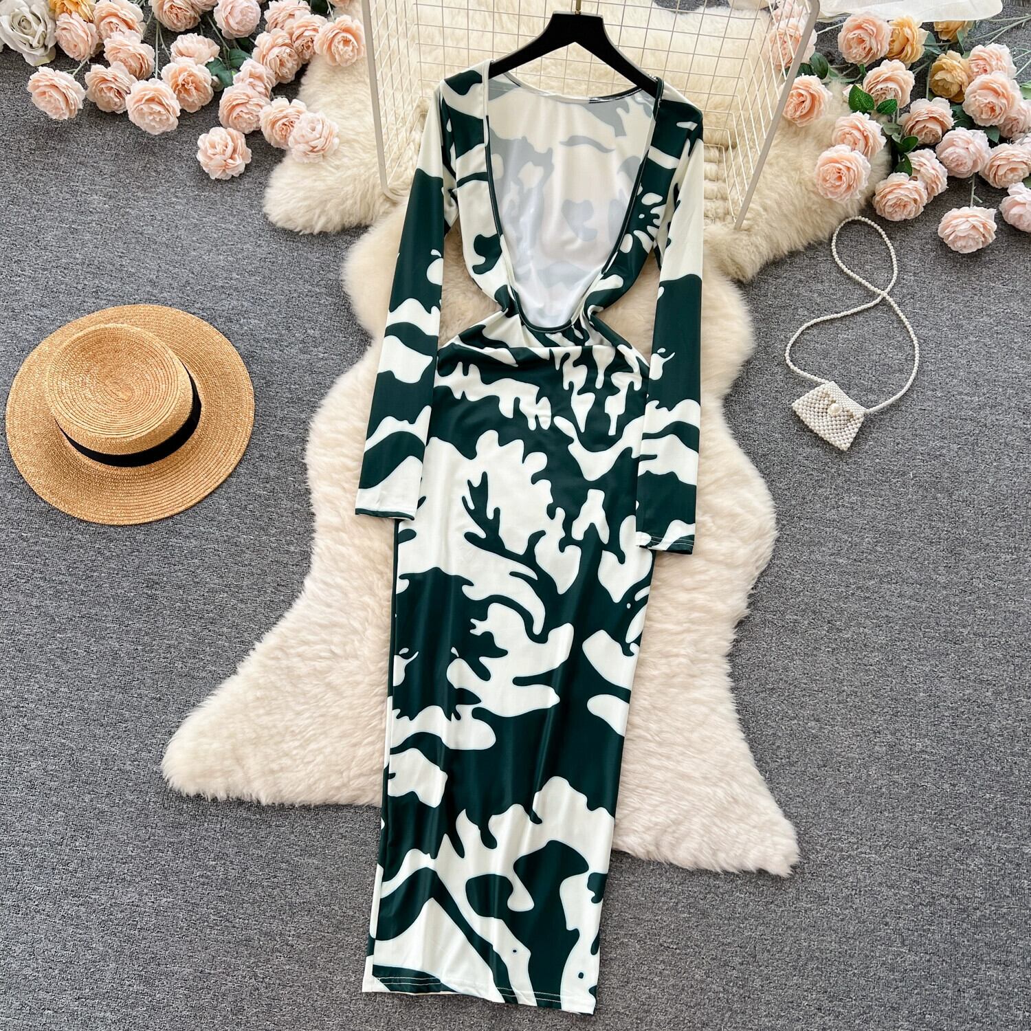 セクシーな中空の大きな背中の開いたプリントドレス女性、フランスの純粋な欲望ネクタイ長袖タイトフィットスリムロングヒップカバースカート ピュア lyxaj37657427235