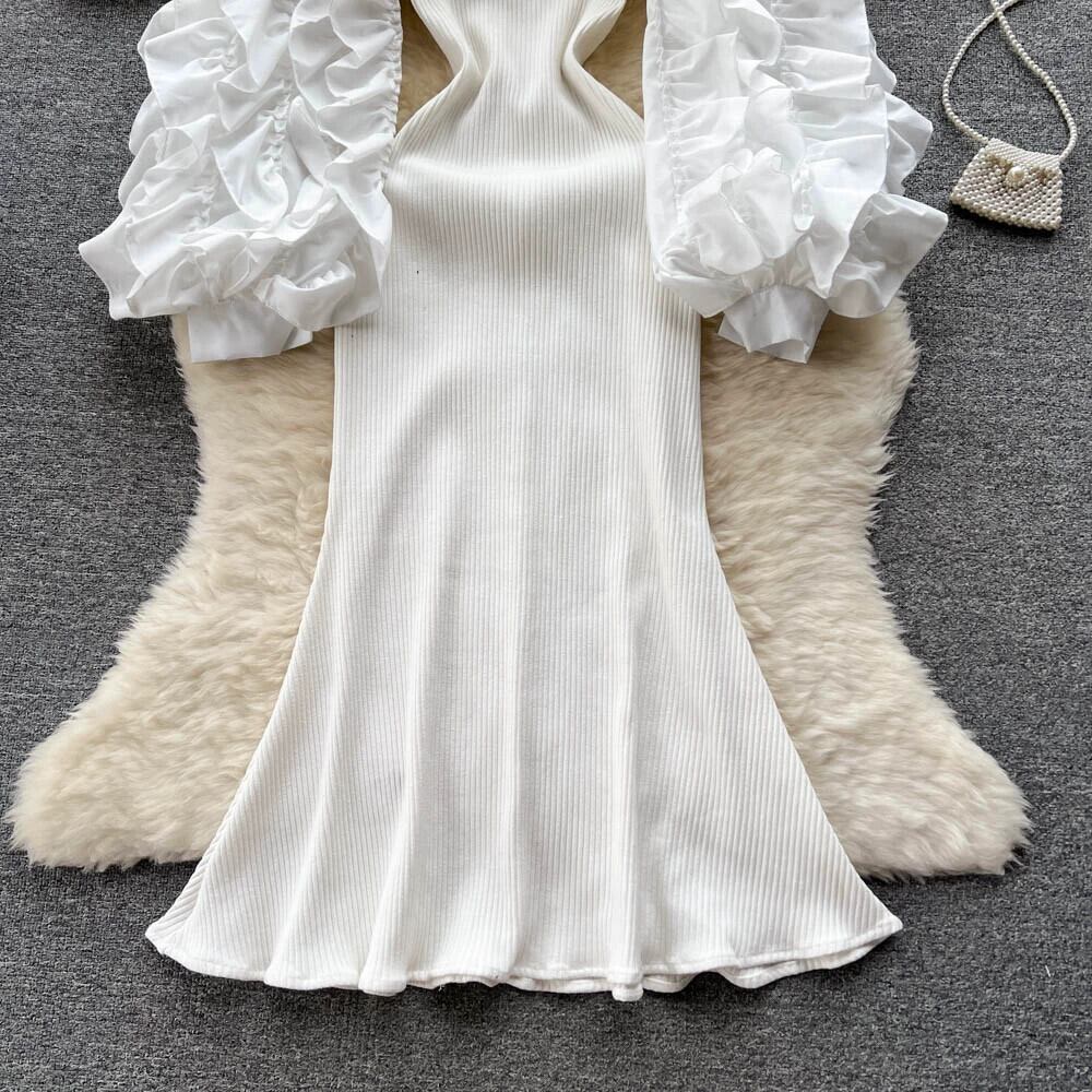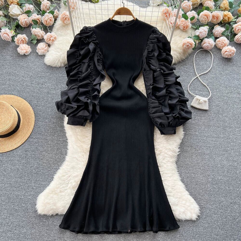 秋の新しい気質多彩なデザインのパフスリーブスプライシングラウンドネックスリムニットスカートフィッシュテールドレス女性のトレンド オータム 秋物 Oネック lyxaj7533786460