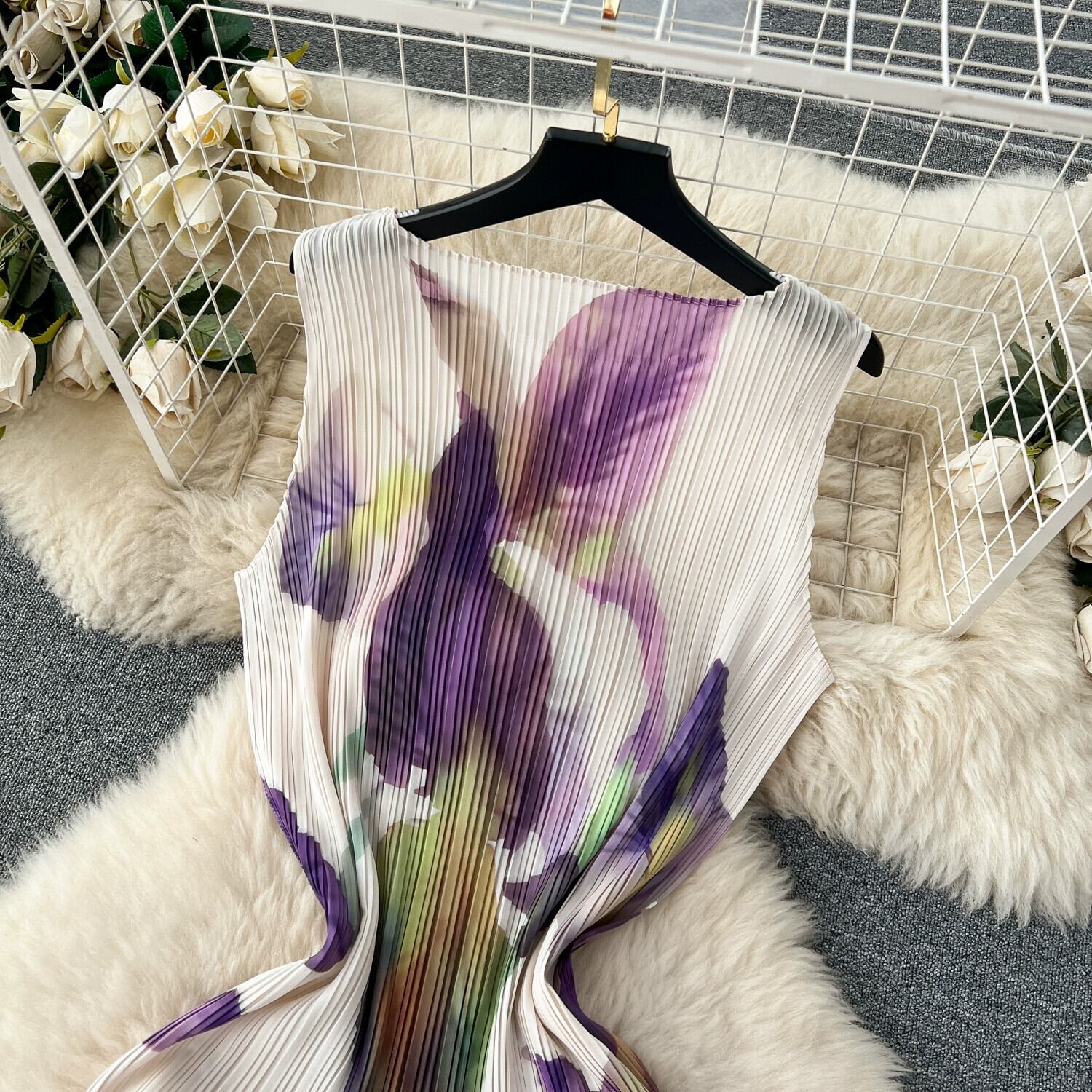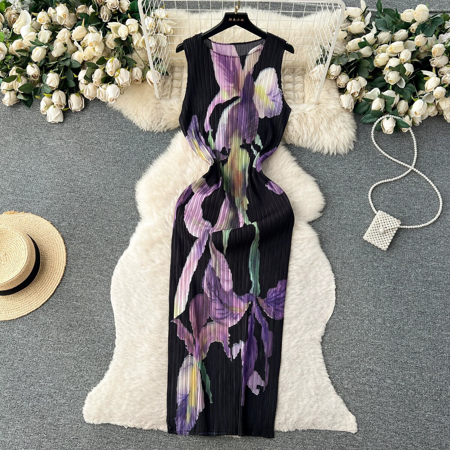 フランスのハイエンドプリントドレスの女性の夏のノースリーブプリーツデザインウエスト痩身ニッチスーパーフェアリーロングスカート サマー 夏物 lyxaj22239639611