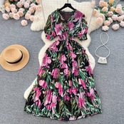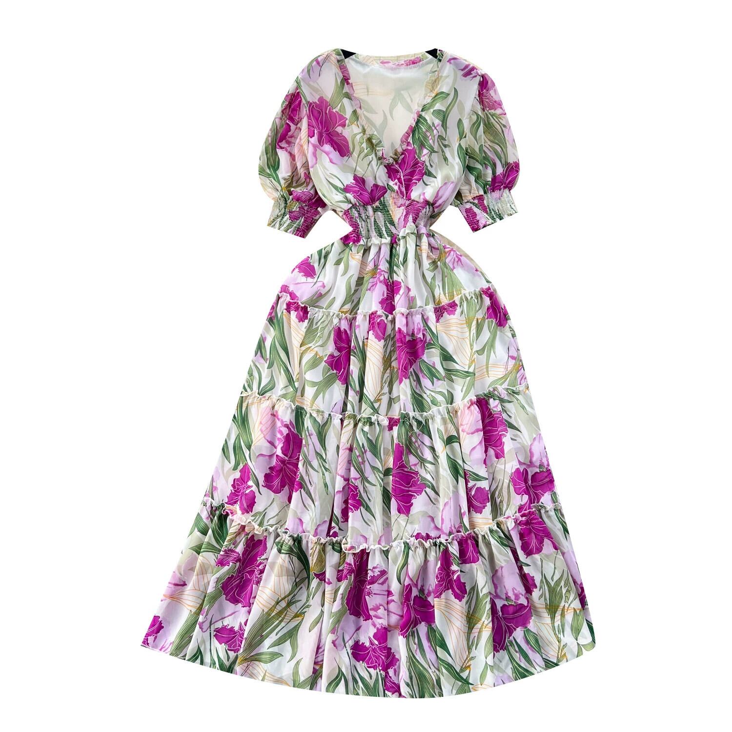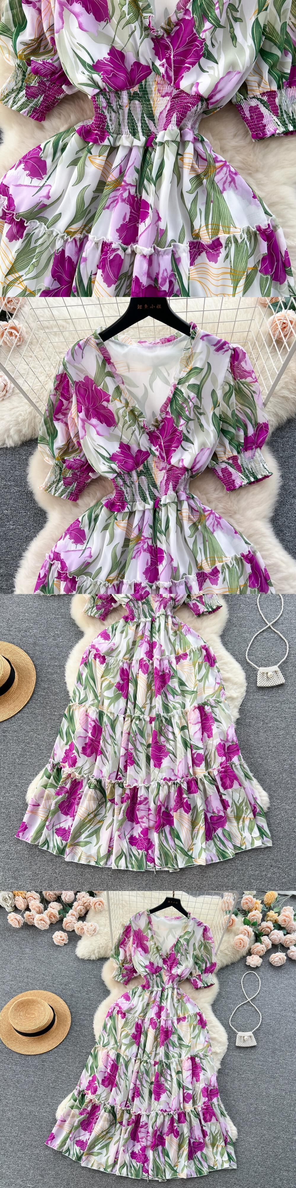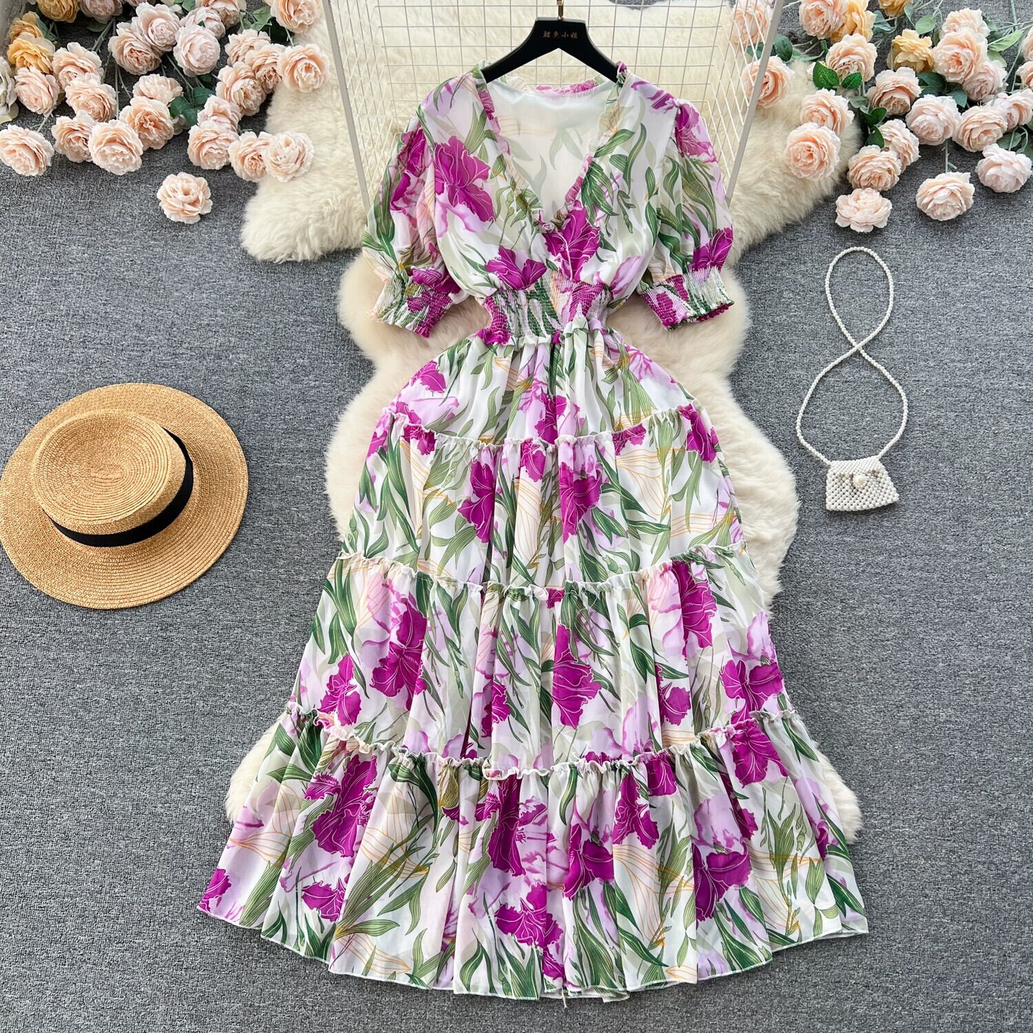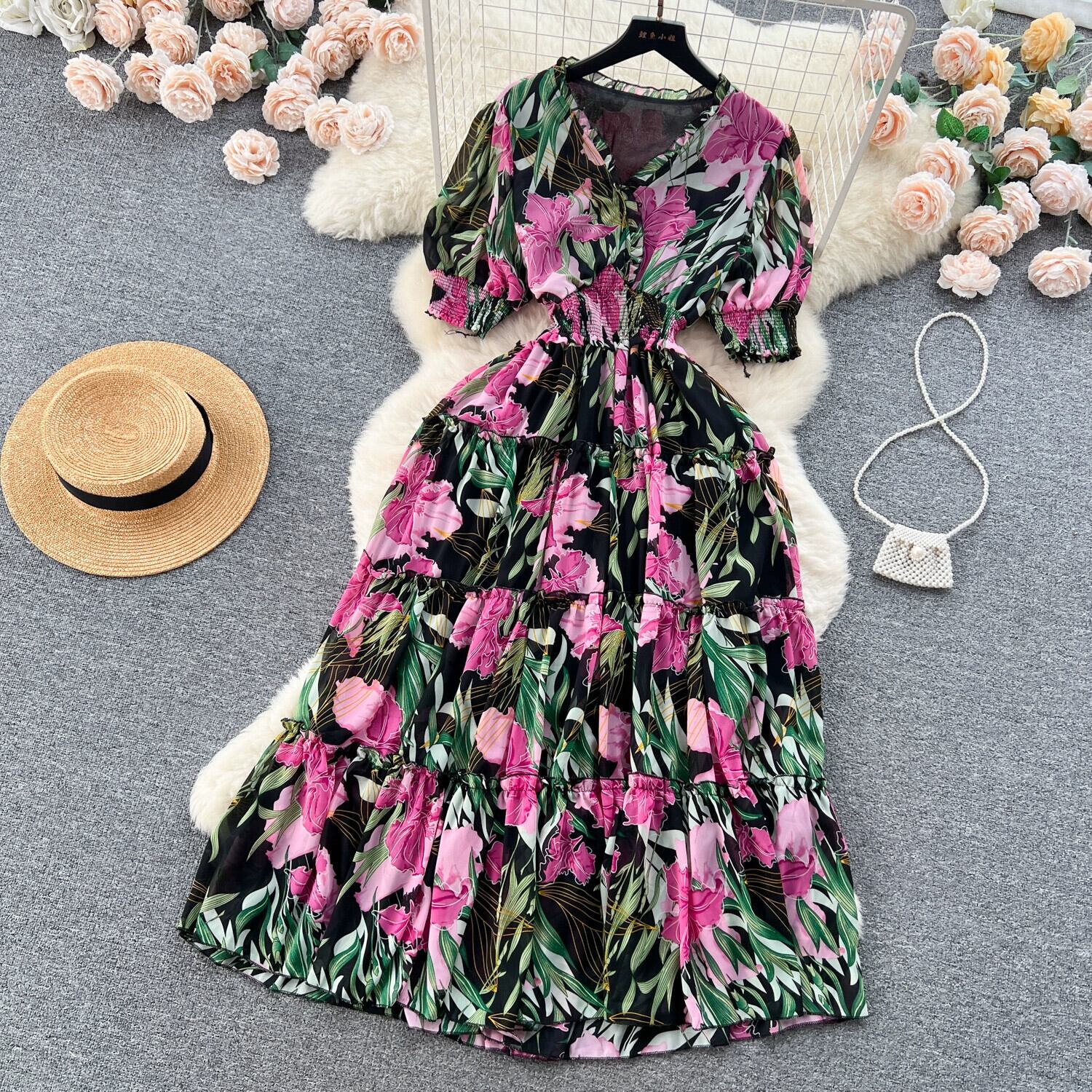 レトロロマンチックな花柄ドレス女性の夏のパフスリーブウエストエンドニッチライト高級妖精ドレス サマー 夏物 lyxaj53008174982