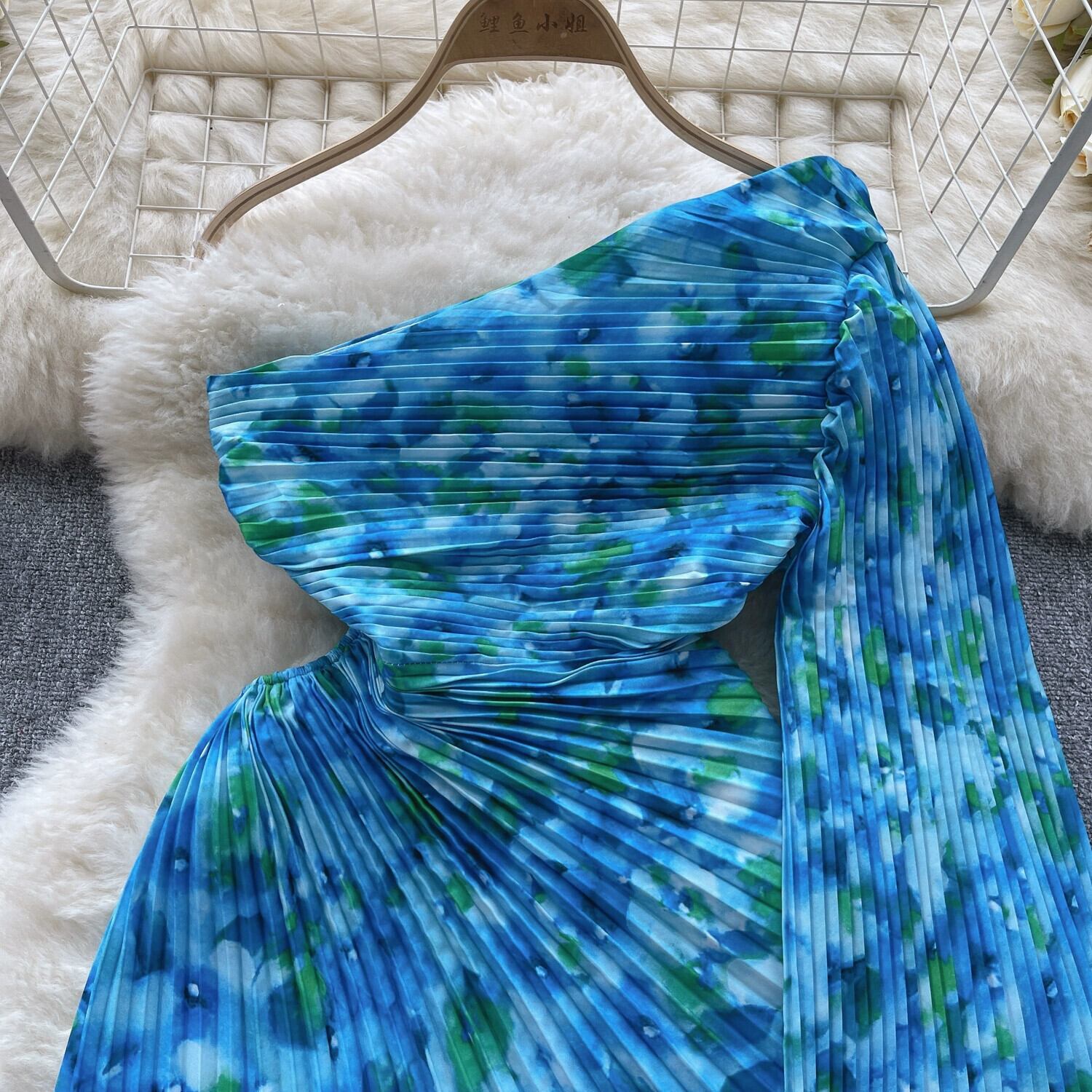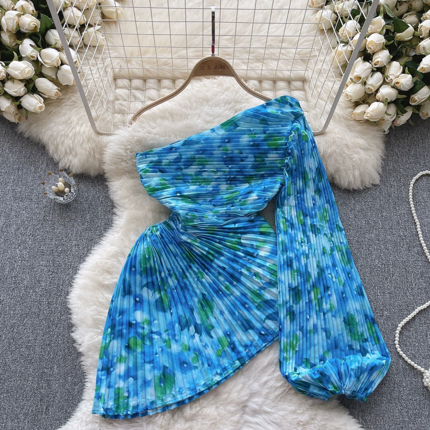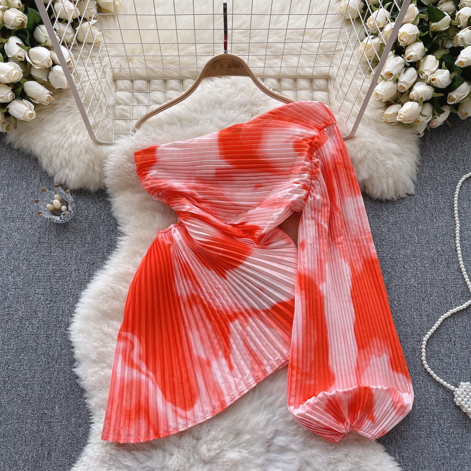 ニッチデザインのスラントカラーオフショルダー長袖プリーツシャツ女性中空ウエストとスリムシックなハイエンドトレンディなトップ ロング lyxaj39105381016