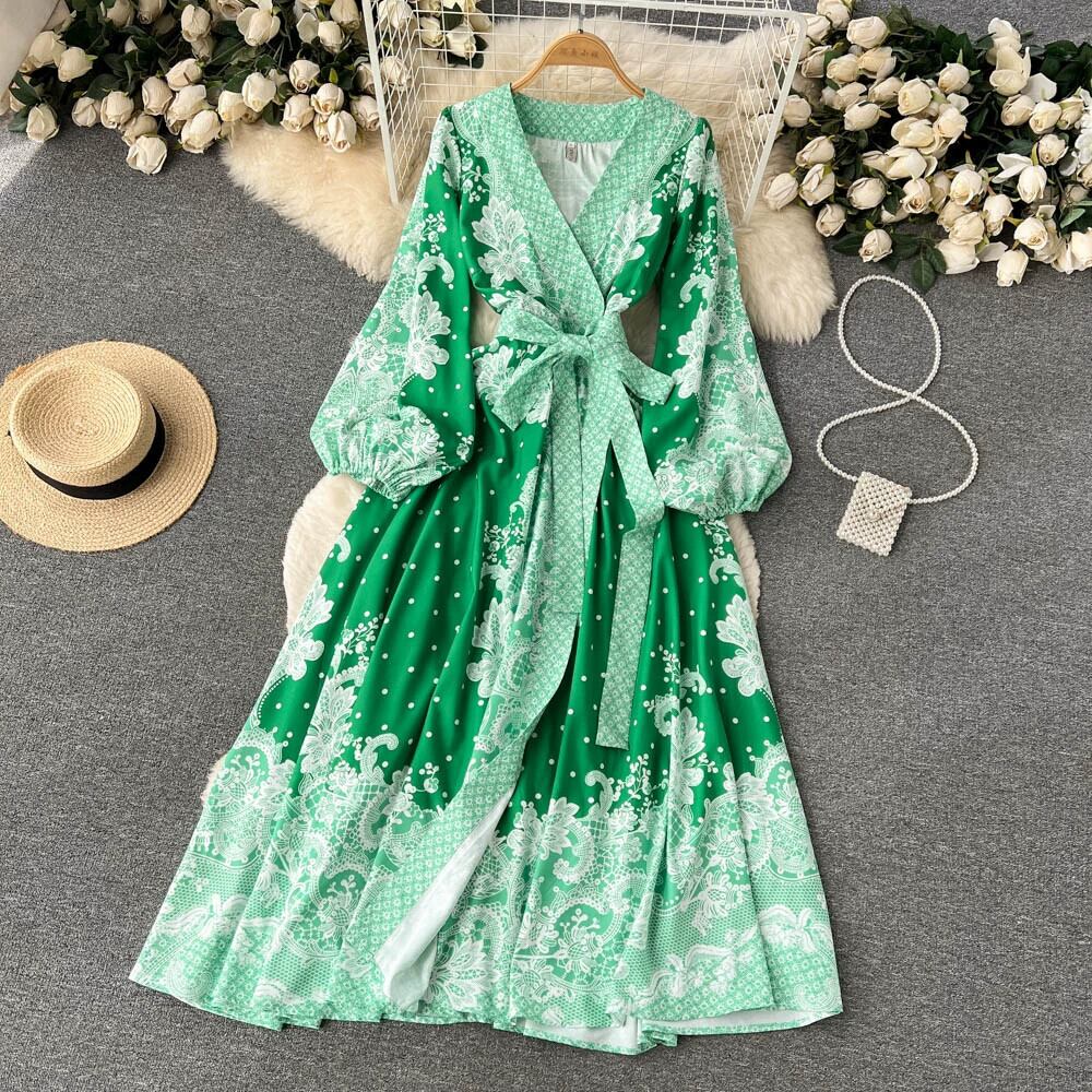 春と秋のヨーロッパとアメリカのレトロな宮殿スタイルのプリントランタンスリーブ V ネックストラップドレス女性のエレガントなロングスカート レース スプリング 春物 オータム 秋物 Vネック ヨーロピアン lyxaj30364134675
