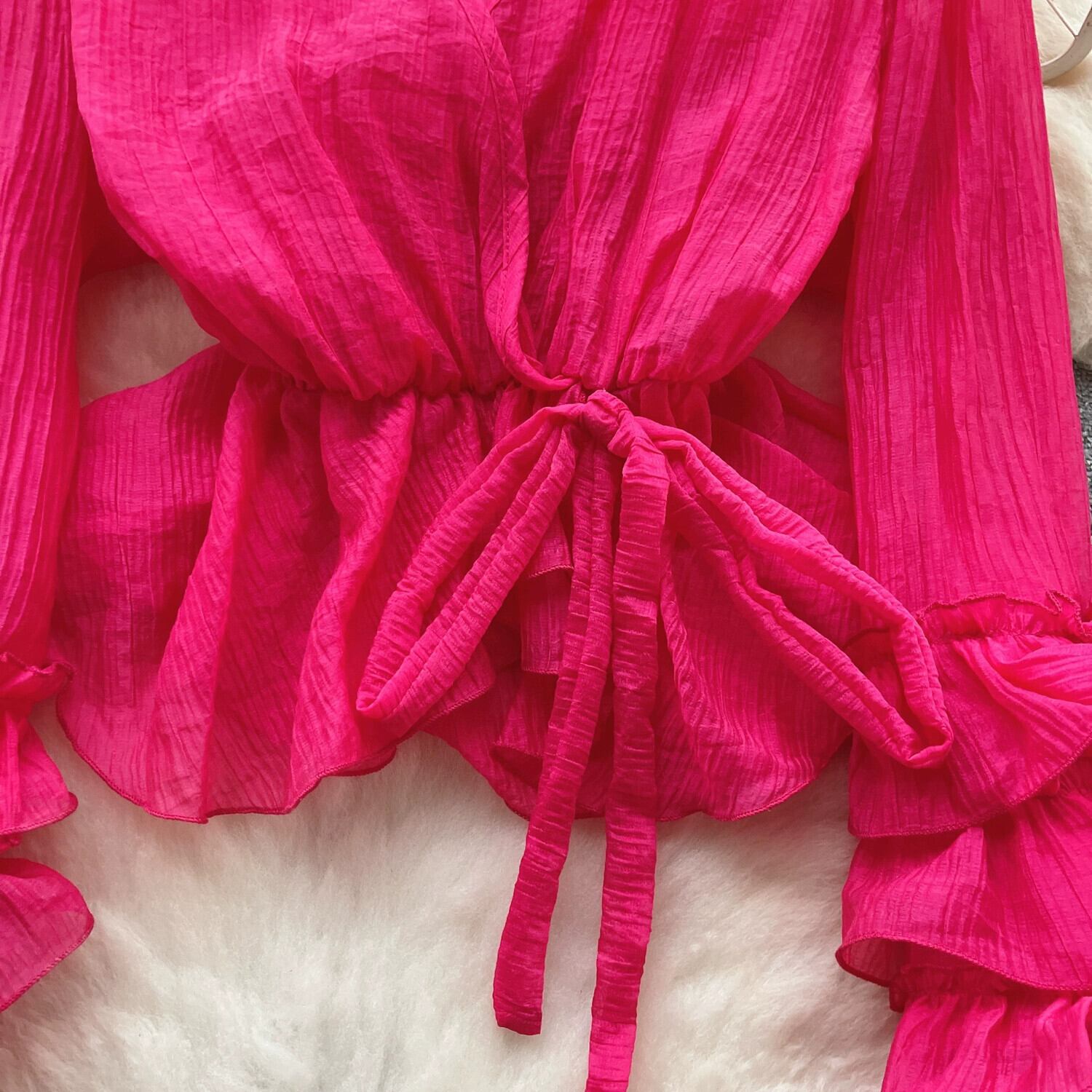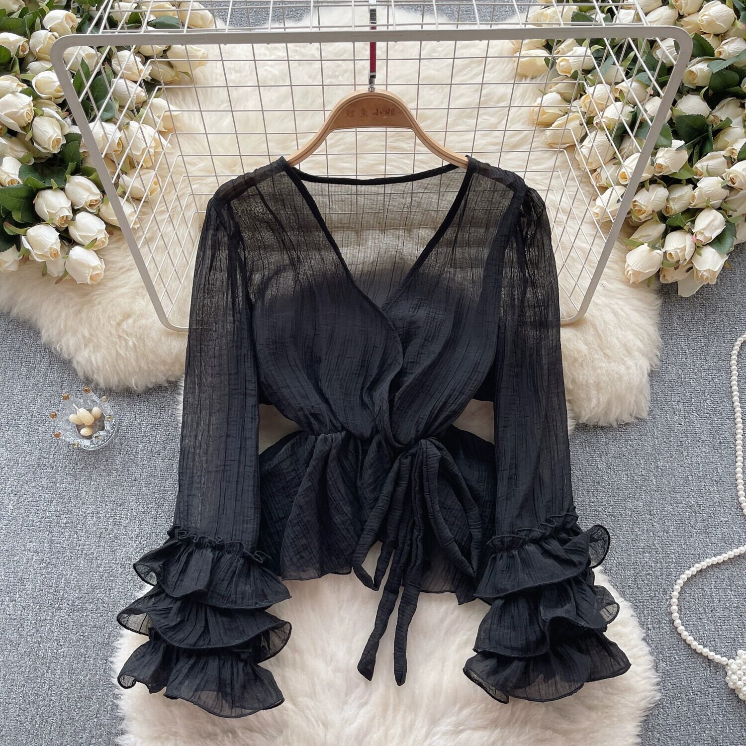 フランスの甘くて優しいスタイルのシフォンシャツレディース、ニッチ、シック、ハイエンド、レースアップウエスト、ショート、気質トップ、トレンディ 大人ガーリー スウィート キュート カジュアル lyxaj28293720999